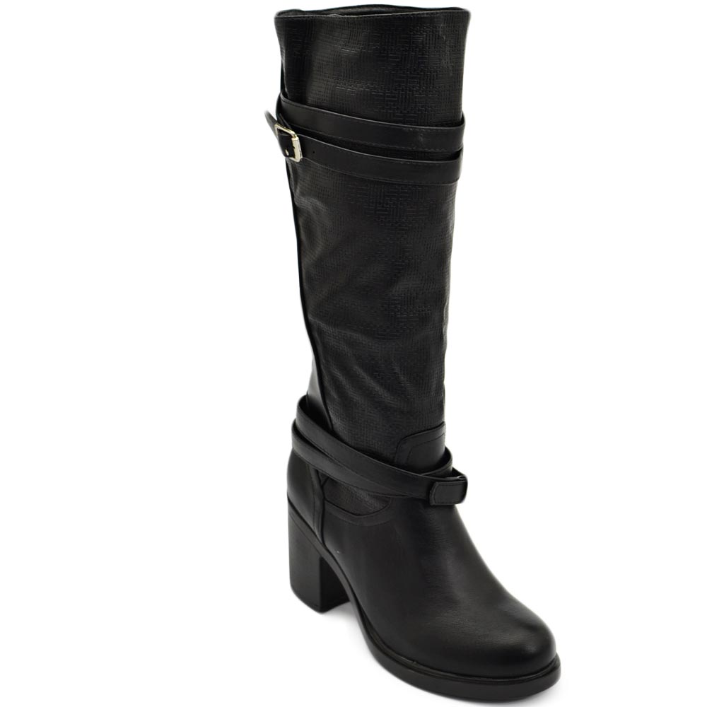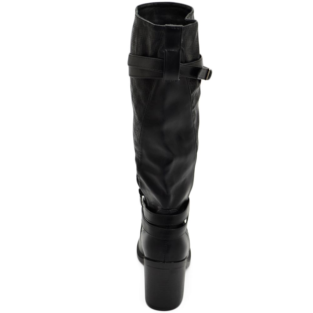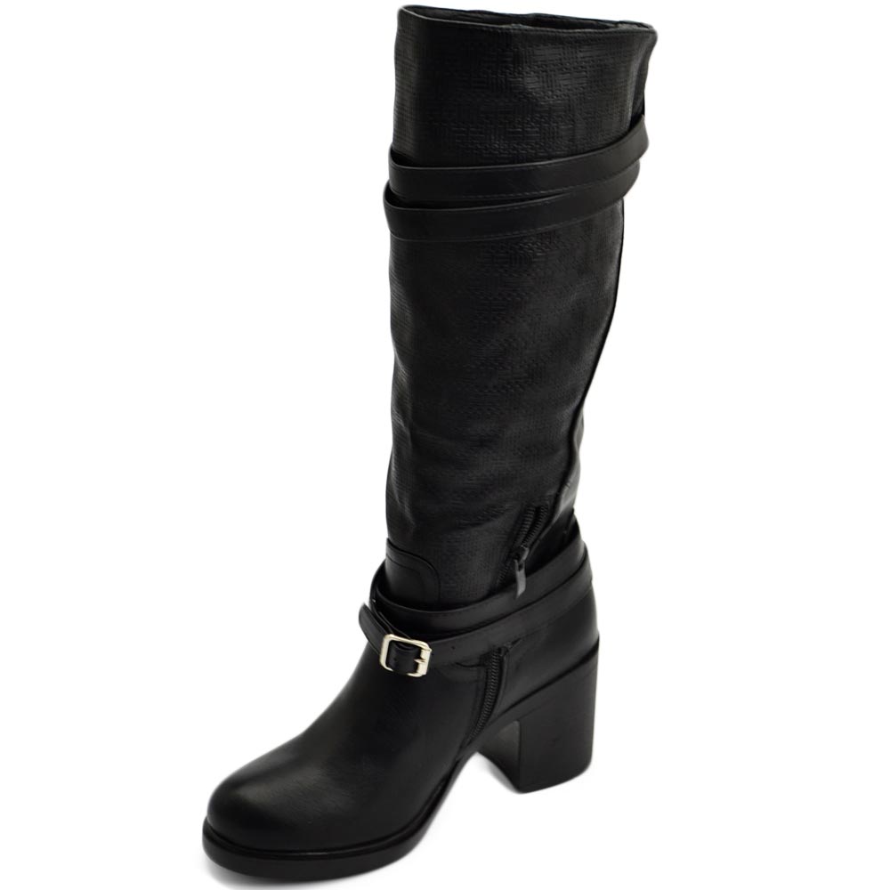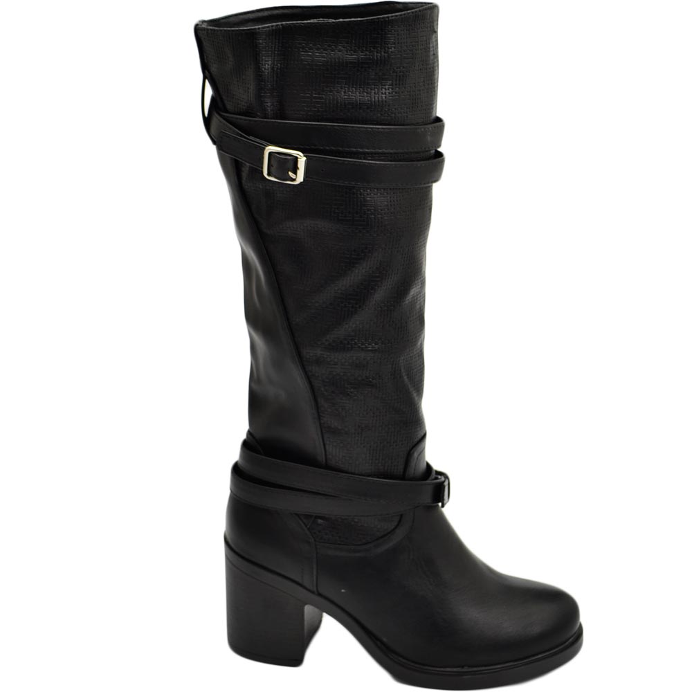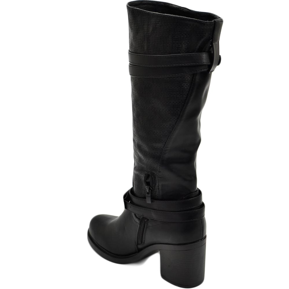 Stivali donna neri altezza biker tinta unita traforato al polpaccio morbido con fibbia gomma tacco antiscivolo glam moda