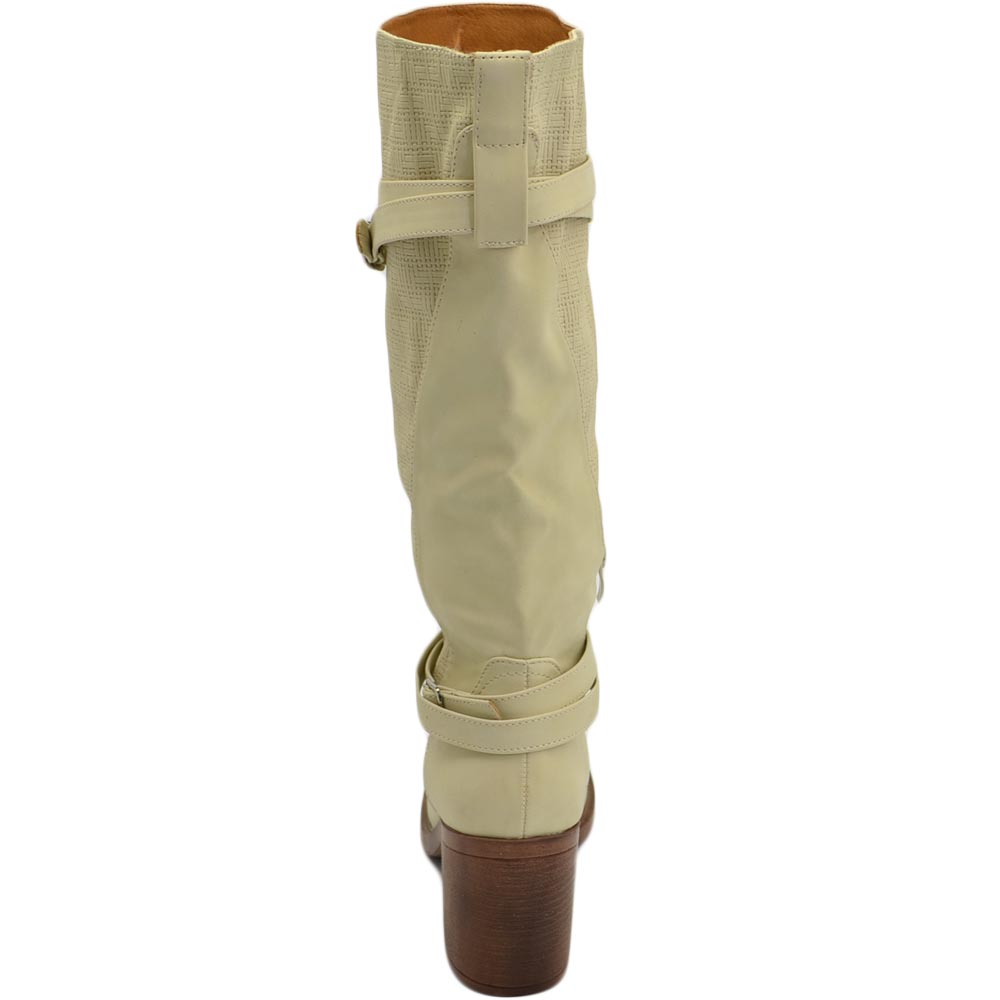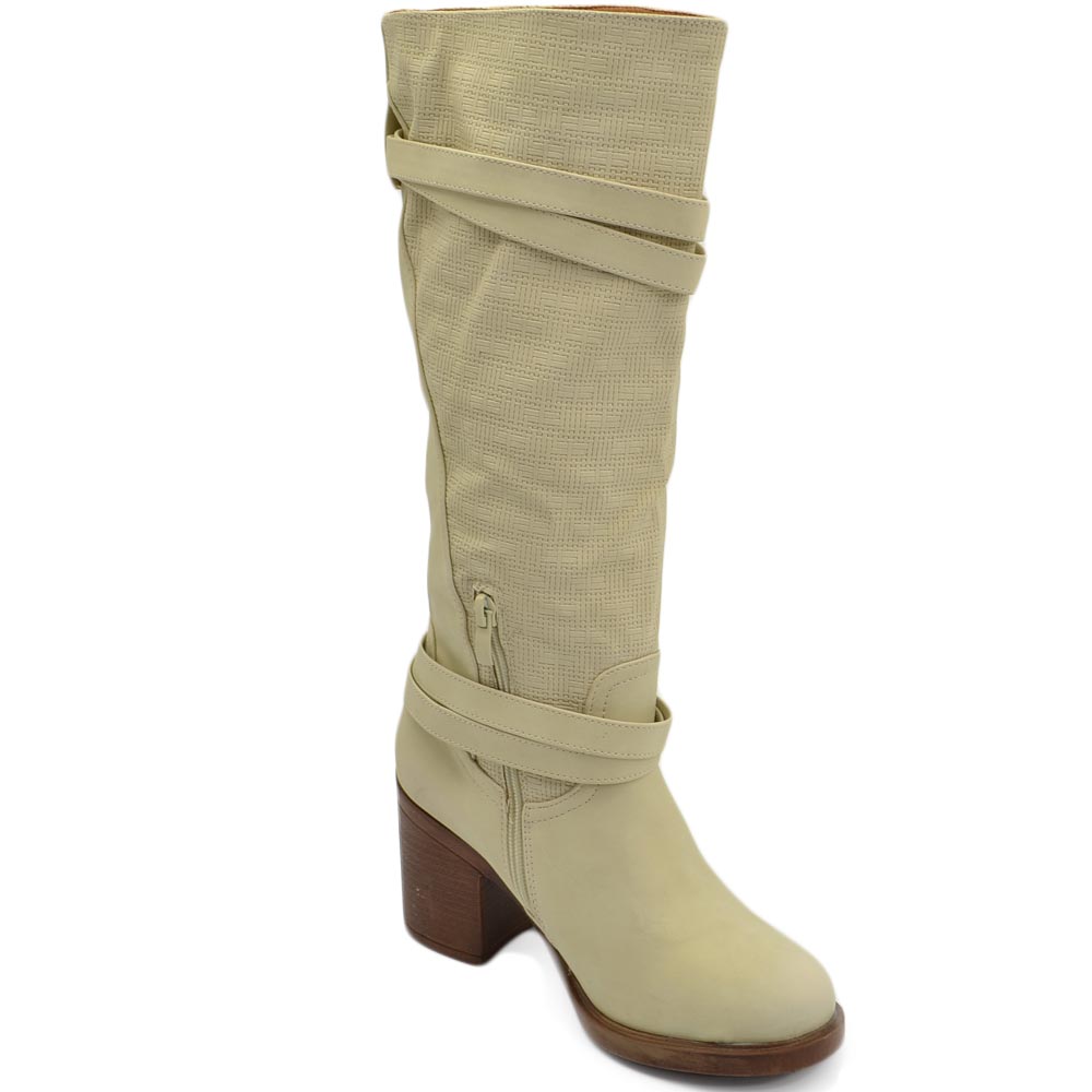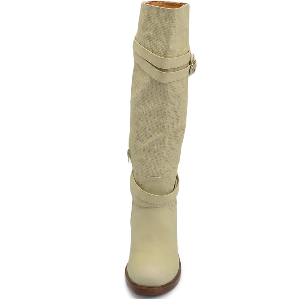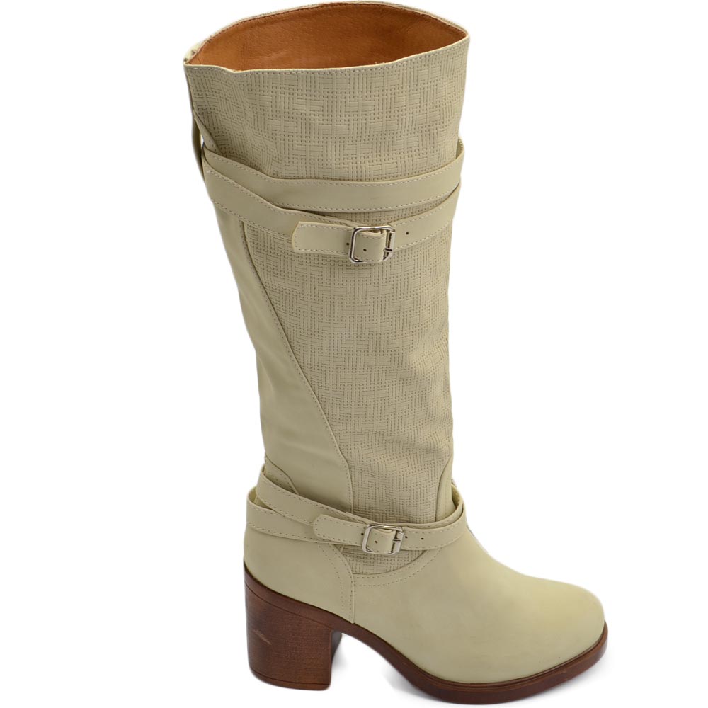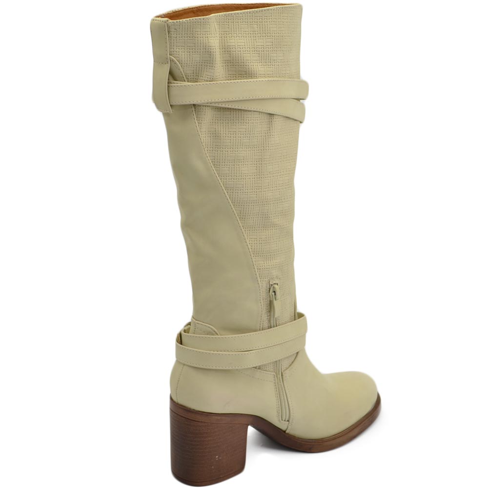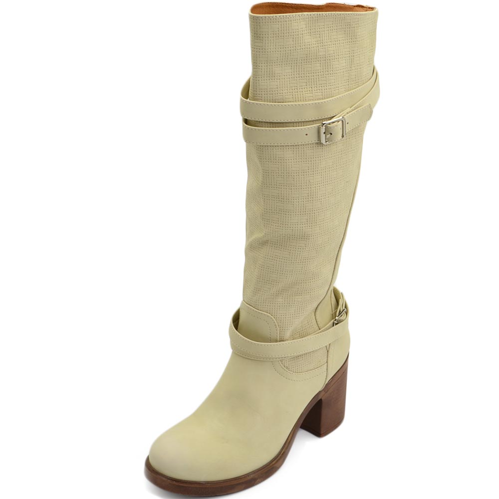 Stivali donna beige altezza biker tinta unita traforato al polpaccio morbido con fibbia gomma tacco antiscivolo moda