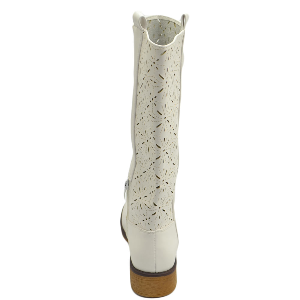 Stivali tronchetti donna pelle crema a punta tonda tacco squadrato taglio asimmetrico moda meta' polpaccio tendenza.