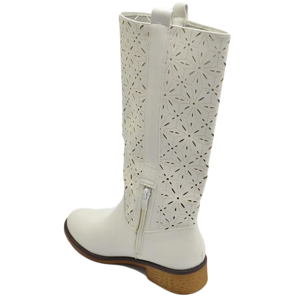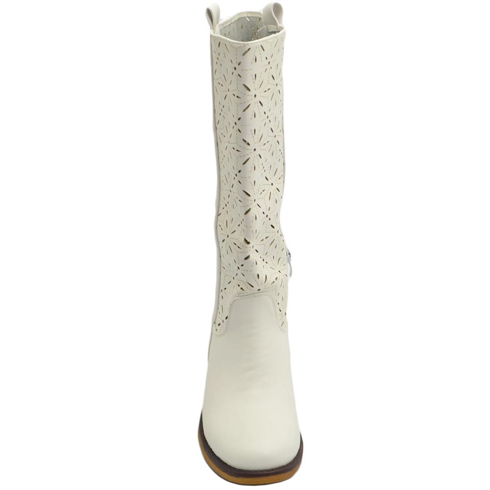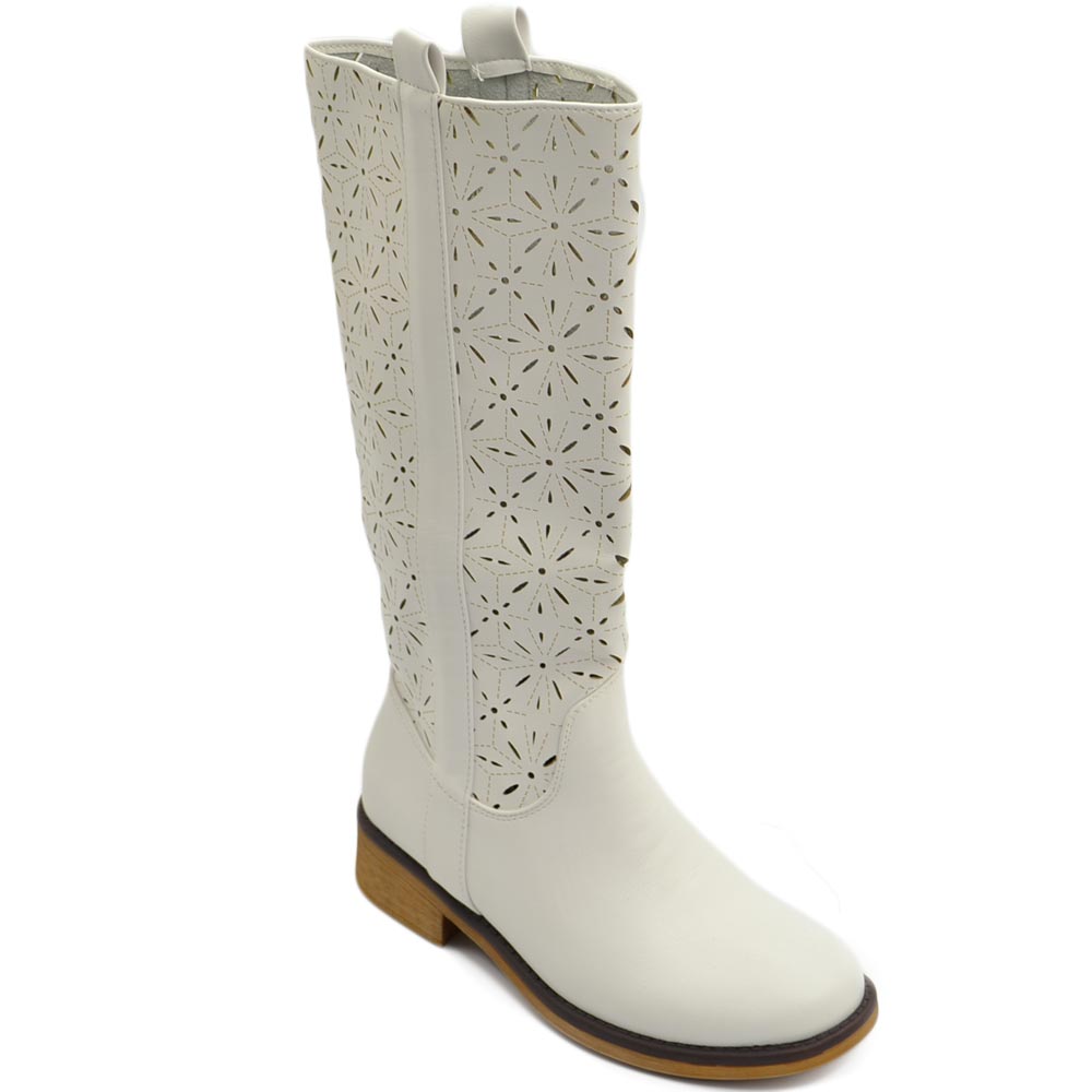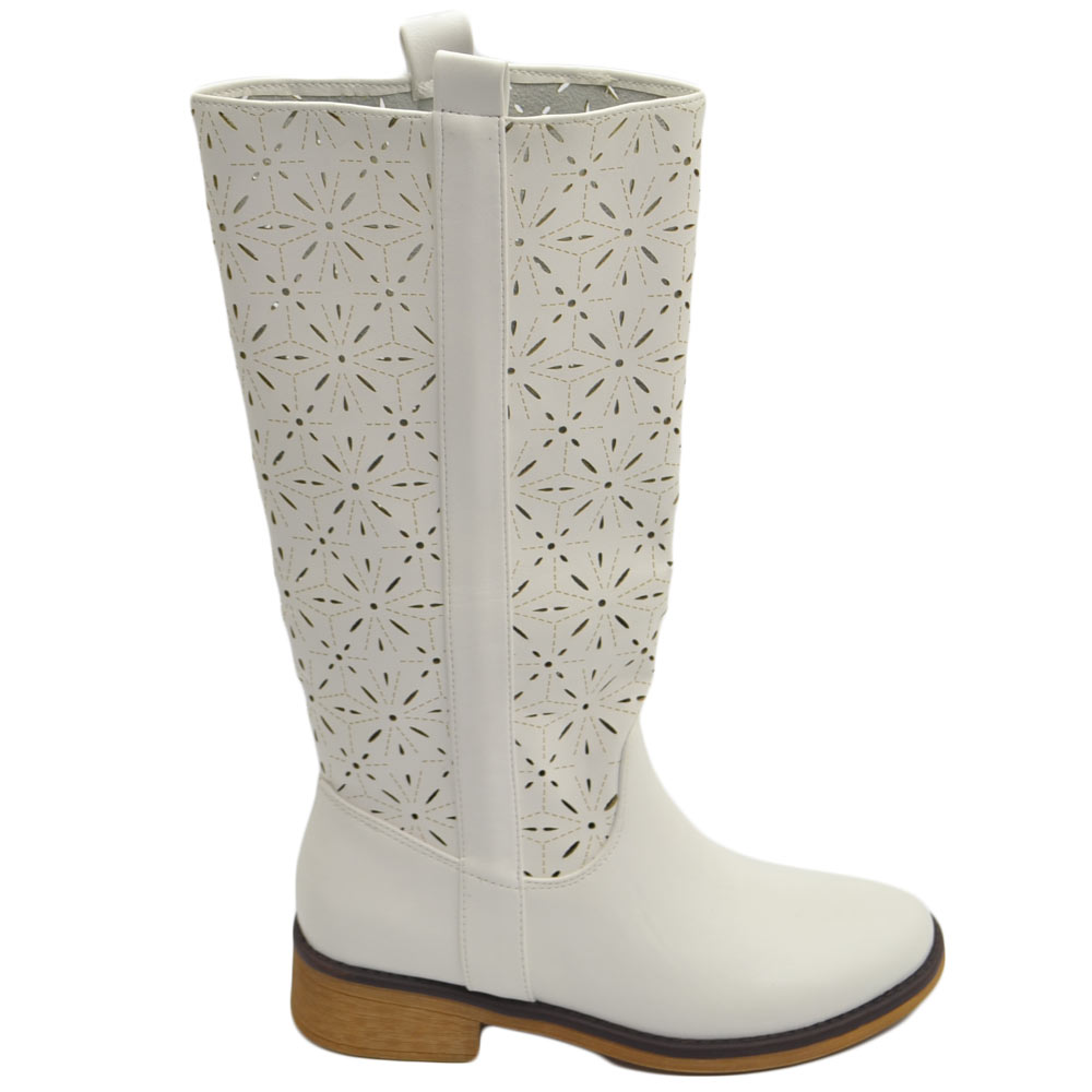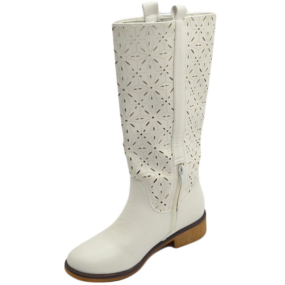 Stivali donna alto punta tonda cuoio gambale traforato puntinato al ginocchio moda elegante