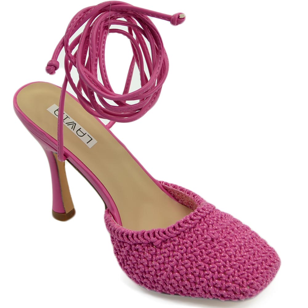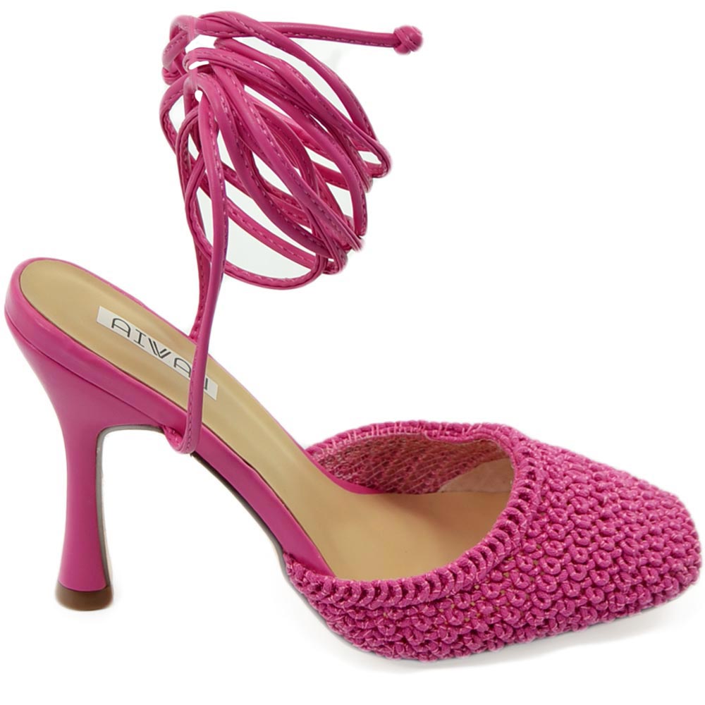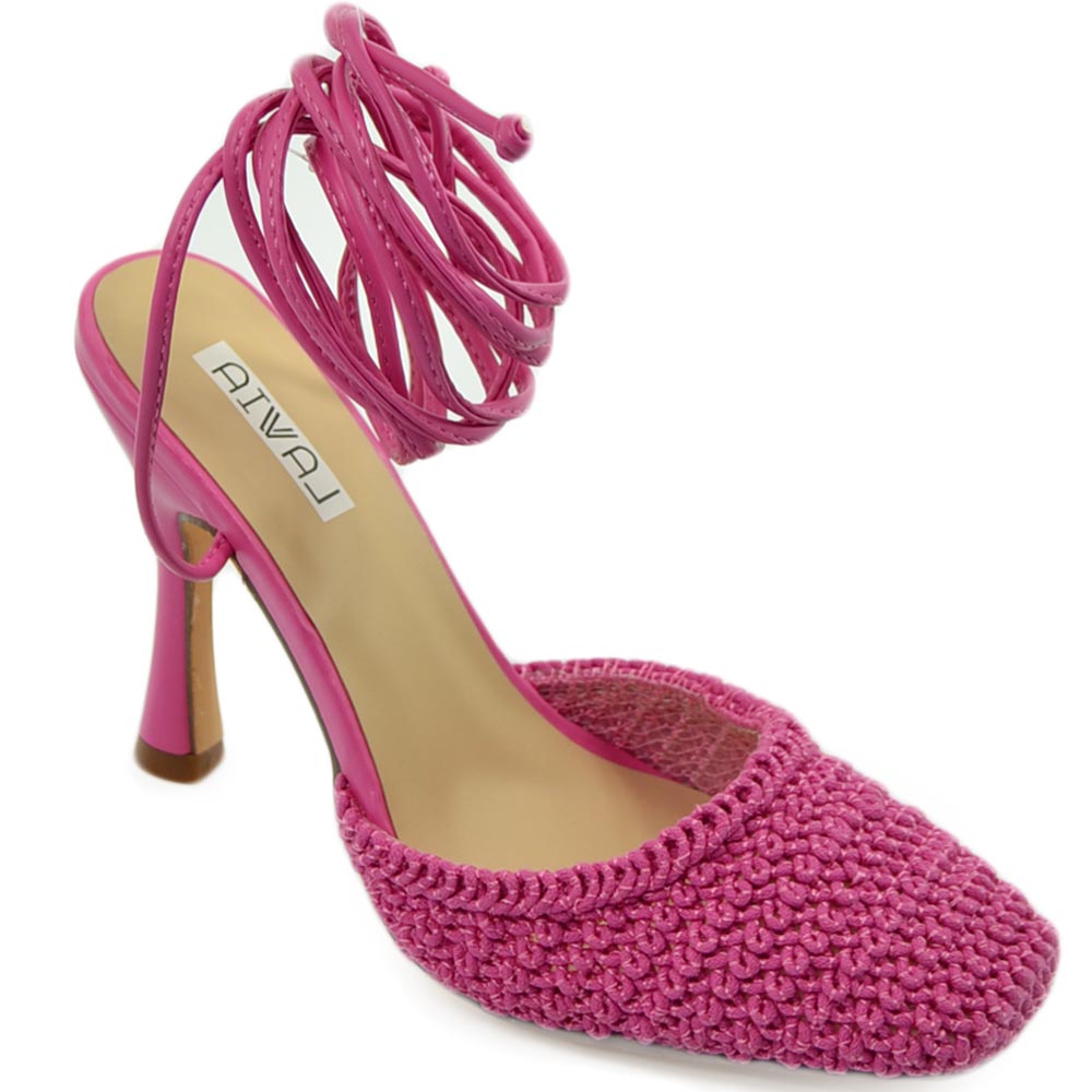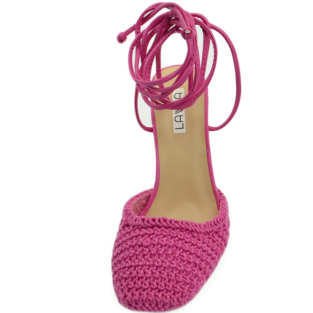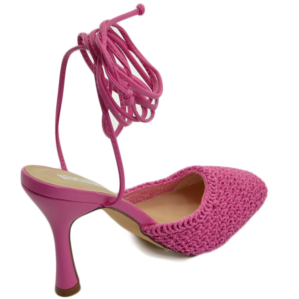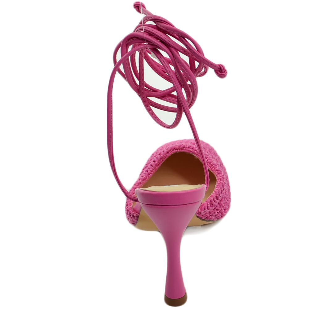 Decollete tacco donna fantasia uncinetto fucsia punta quadrata tallone scoperto allacciatura schiava caviglia lacci