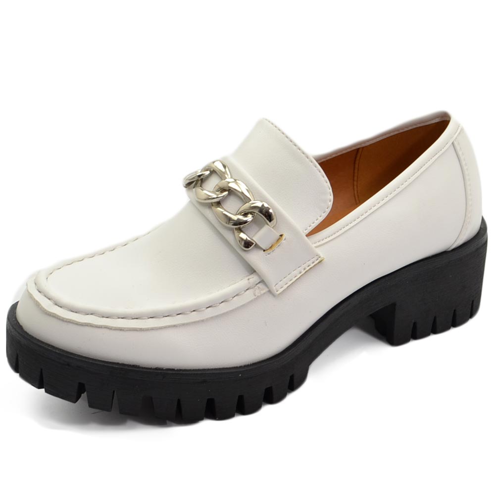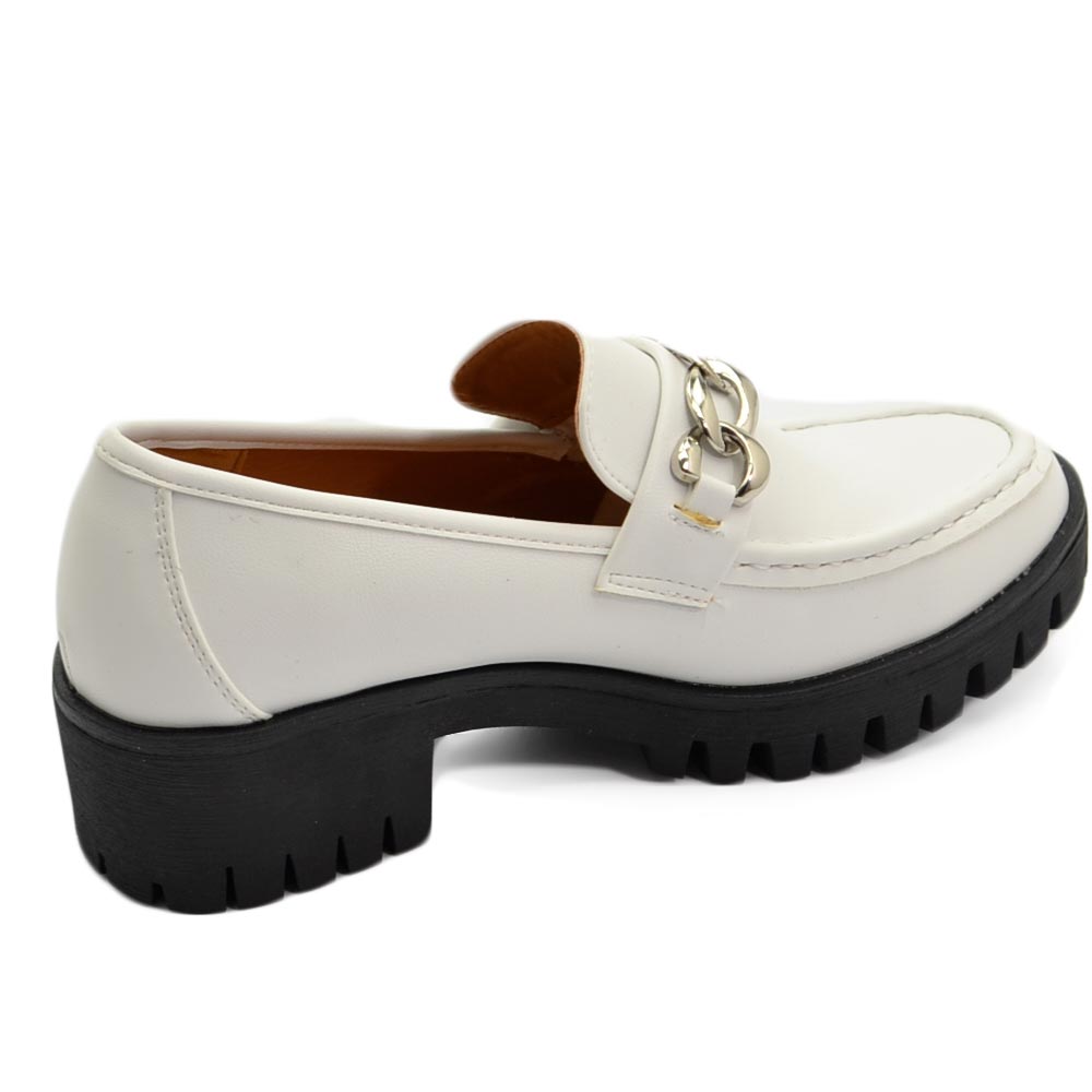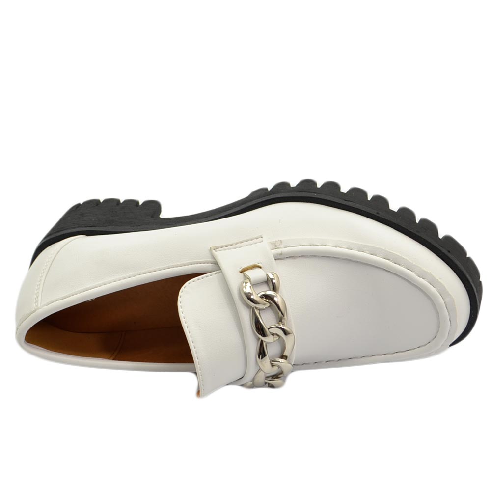 Mocassini donna college bianco accessorio catena argento suola gomma alta nera carrarmato moda tendenza