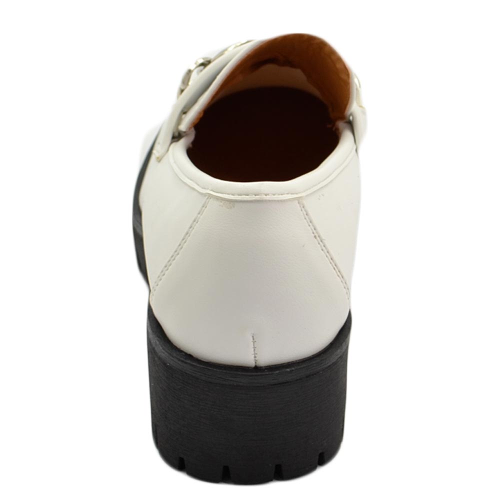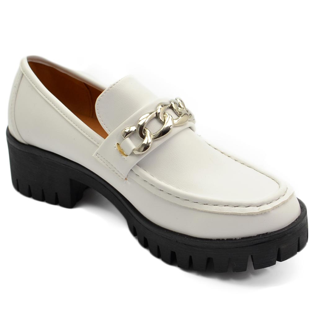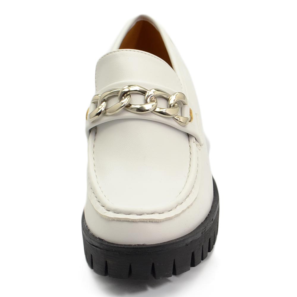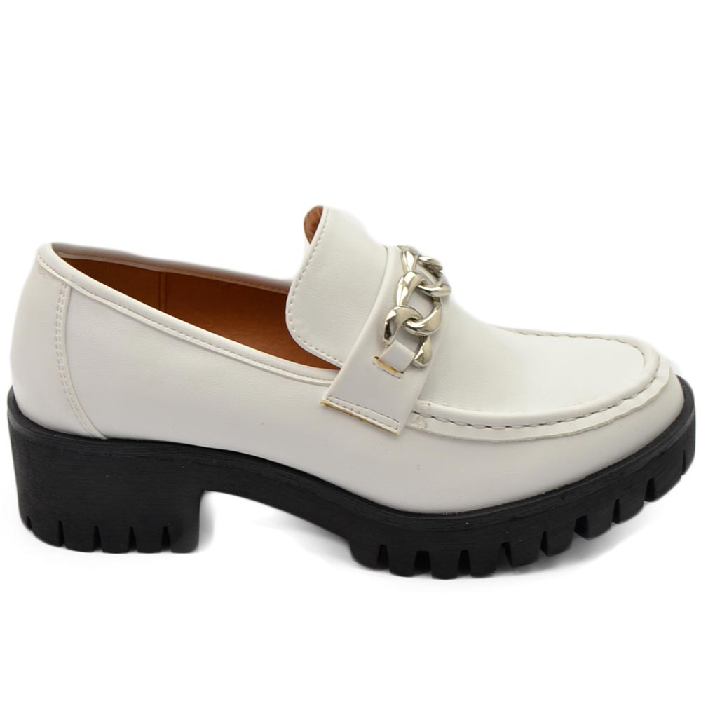 Mocassini donna college bianco accessorio catena argento suola gomma alta nera carrarmato moda tendenza
