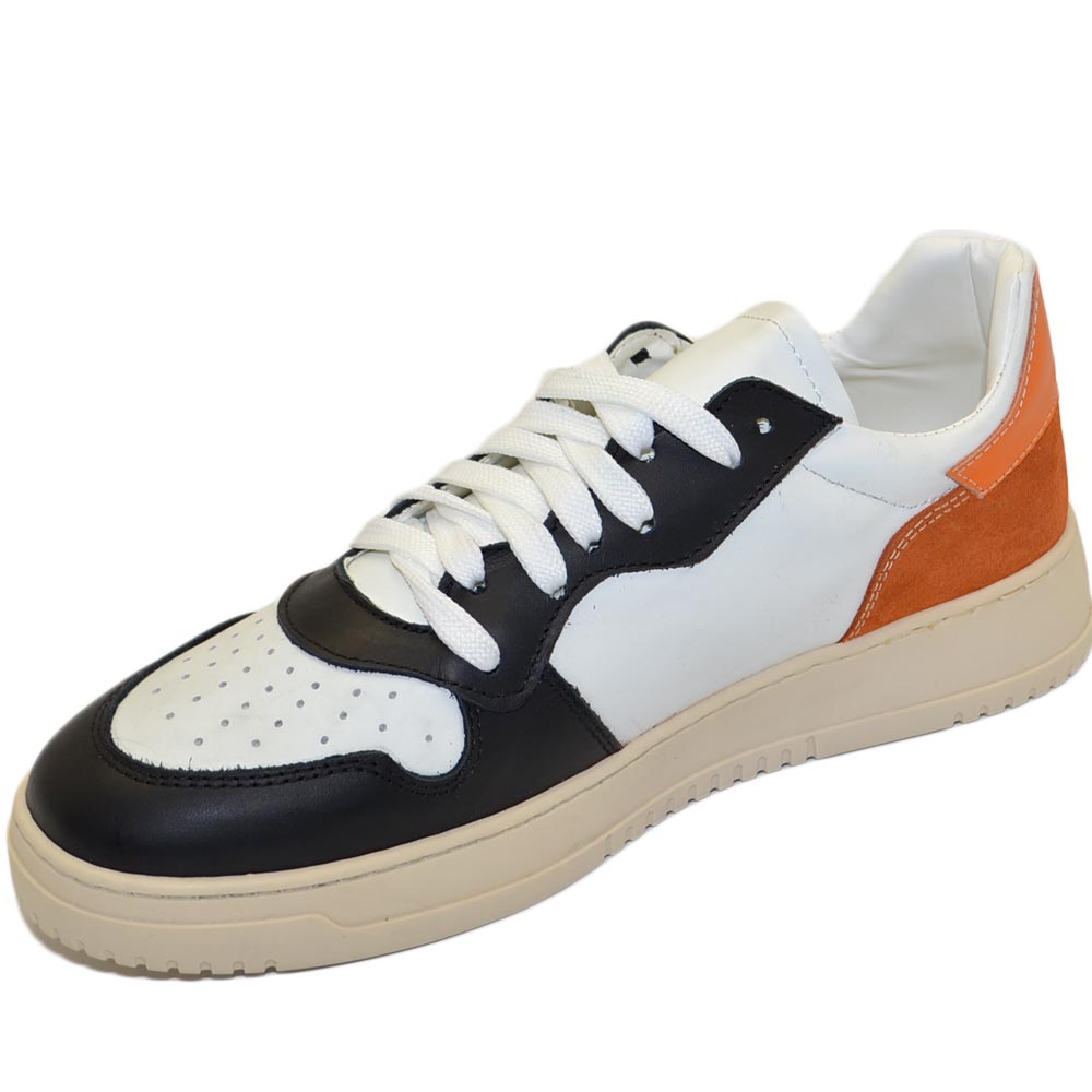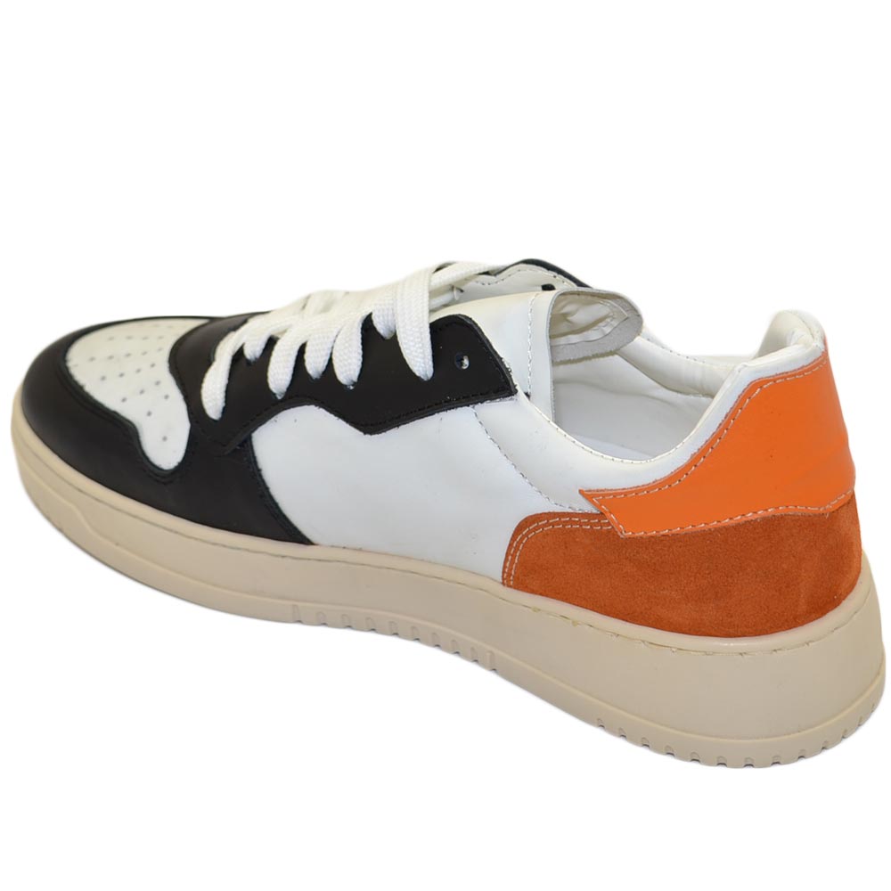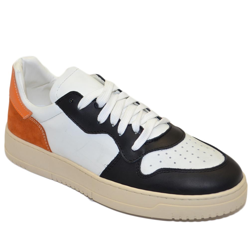 Scarpa sneakers multicolore bianco arancione e nero uomo basic vera pelle lacci comodo fondo in gomma beige