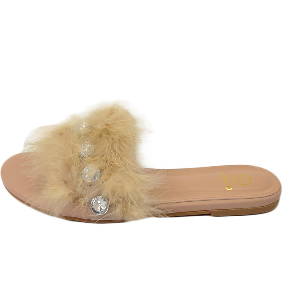 Pantofoline donna pelliccia peluche pelo con applicazioni beige nude voluminosa colorata morbide raso terra moda glamour