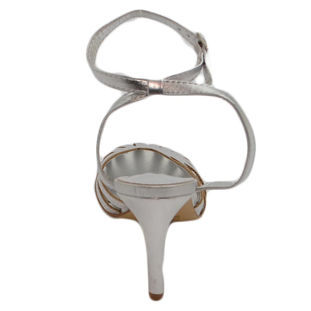 Sandali tacco donna a fascette argento opaco satinato anni 60 tacco sottile 8cm cerimonia cinturino alla caviglia