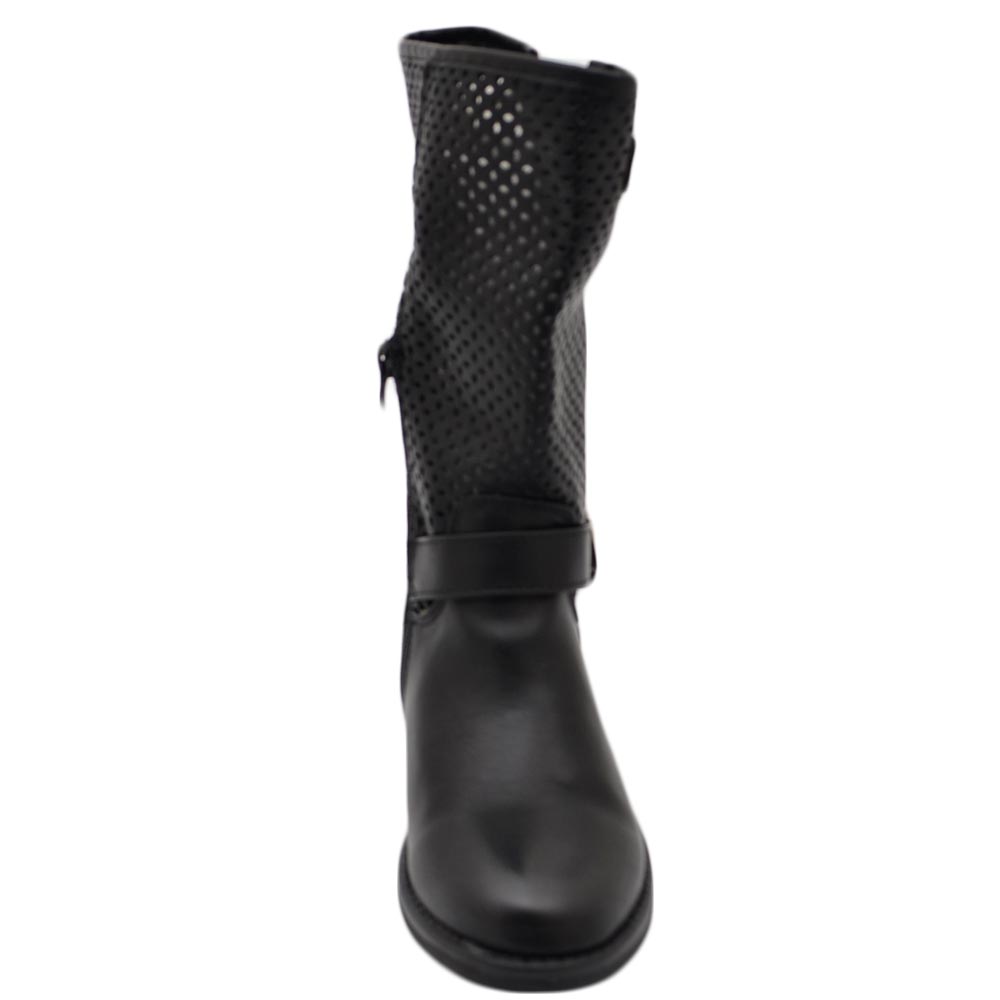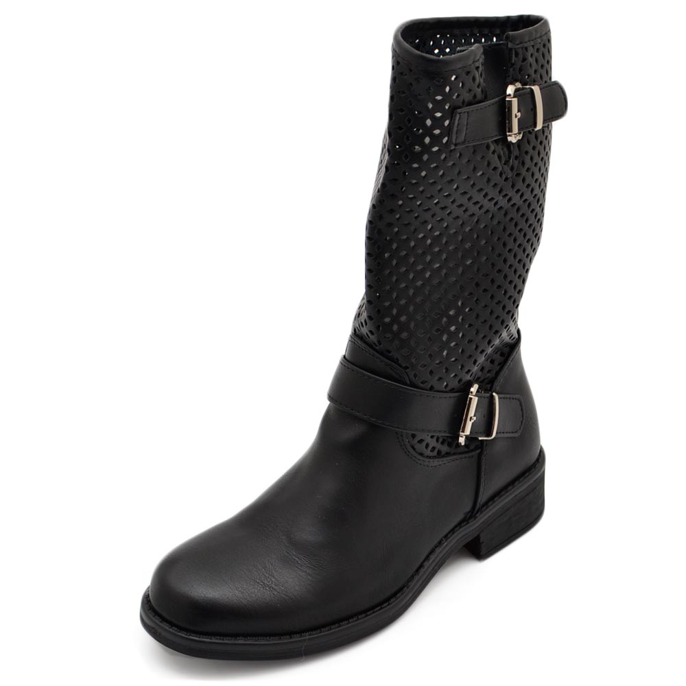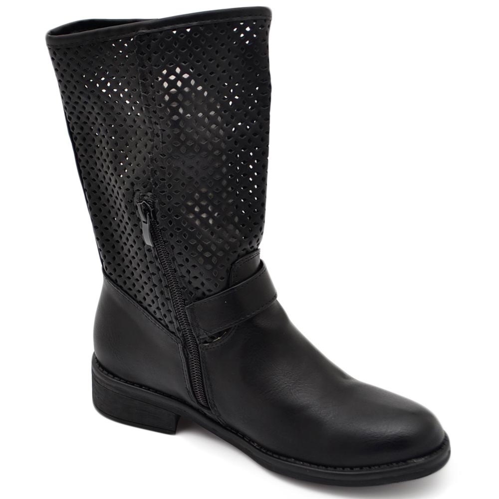 Stivali donna biker estivi comodi traforati con fibbia casual in pelle nera suola in gomma altezza meta' polpaccio