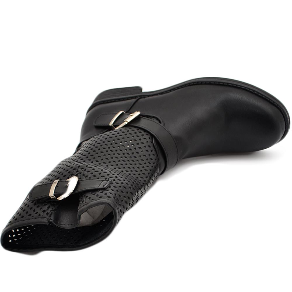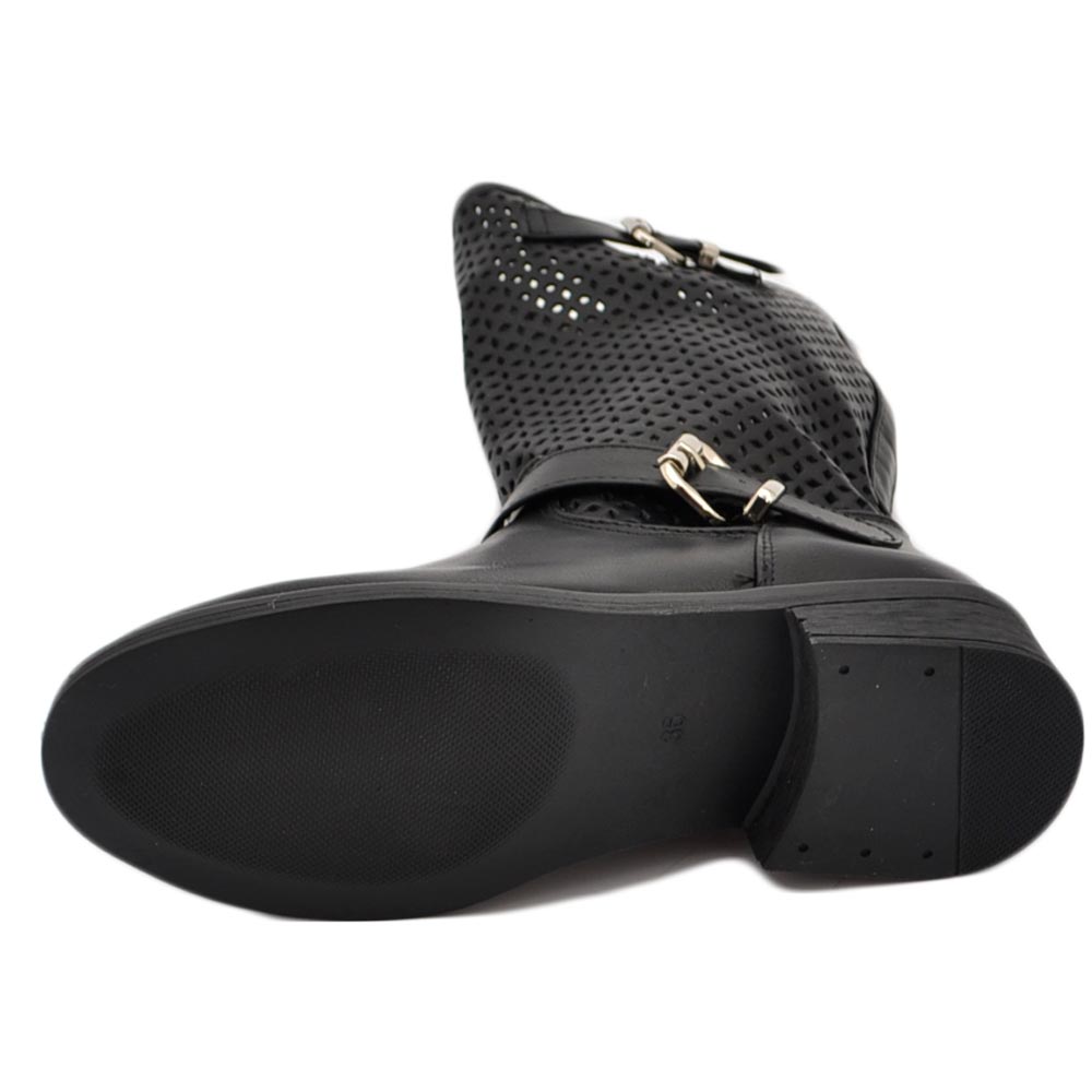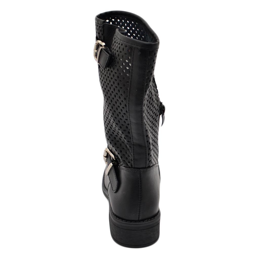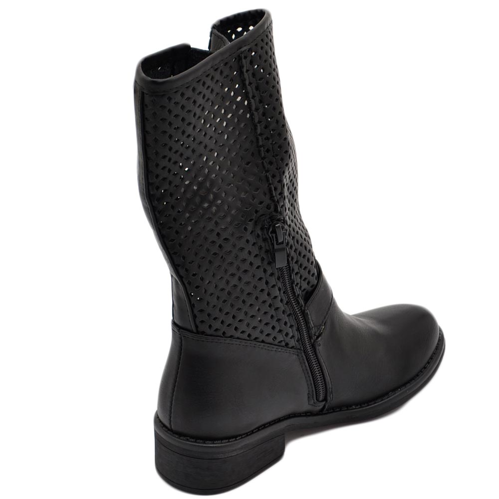 Stivali donna biker estivi comodi traforati con fibbia casual in pelle nera suola in gomma altezza meta' polpaccio
