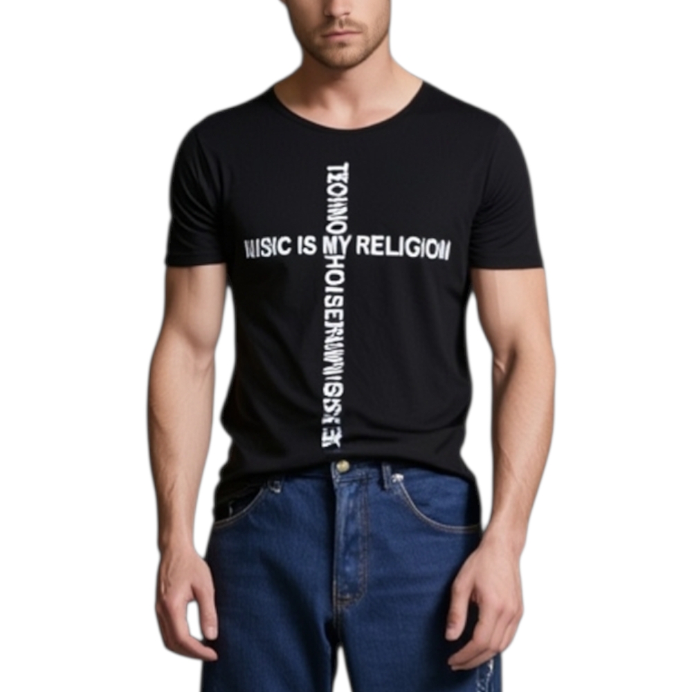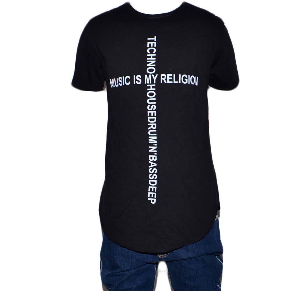 T-Shirt lunga uomo nera oversize maniche corte scritta la music is my religion street style estate