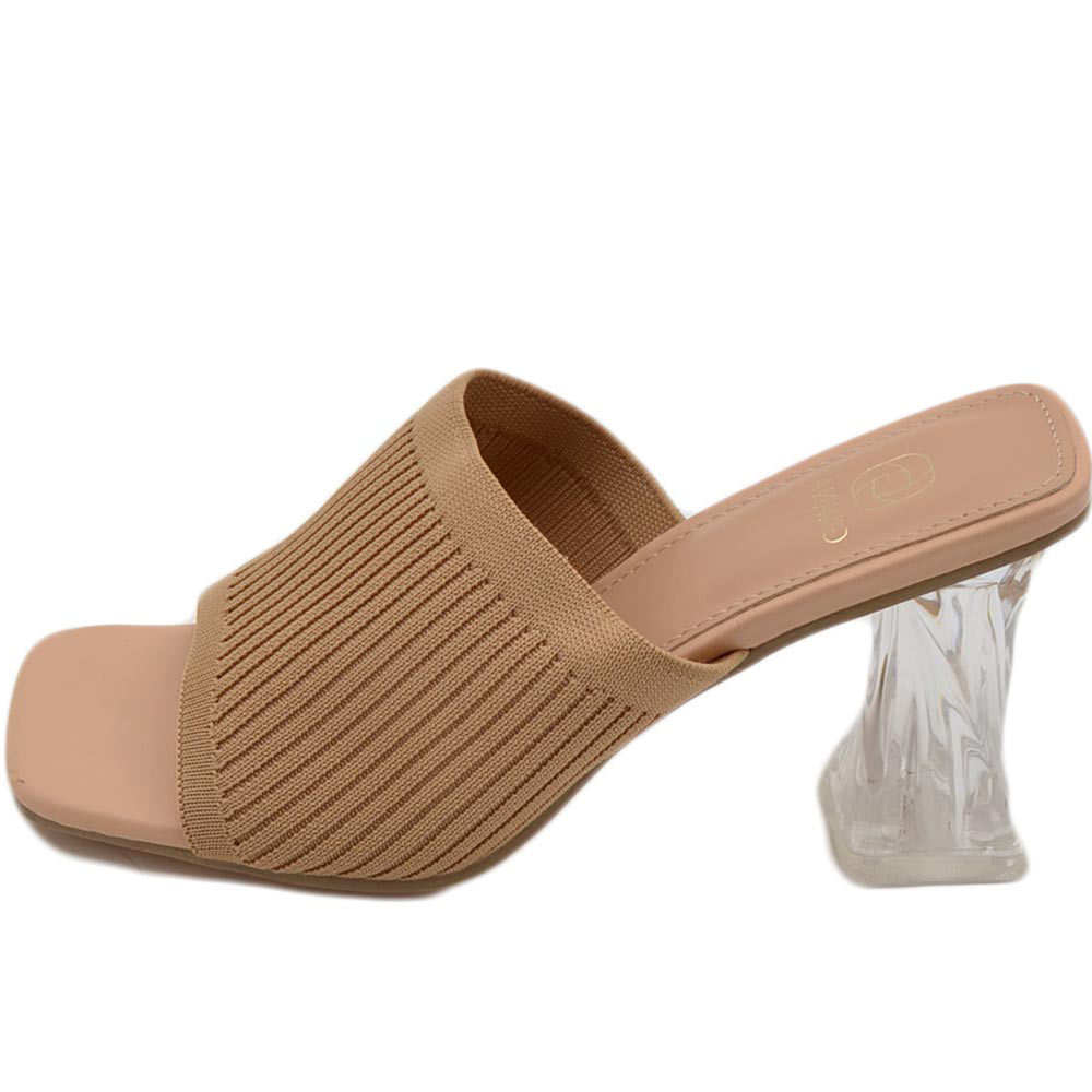 Sandali donna mules pantofole in tessuto elastico nude e tacco trasparente martini 7 moda tendenza