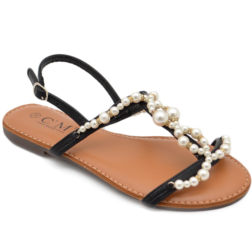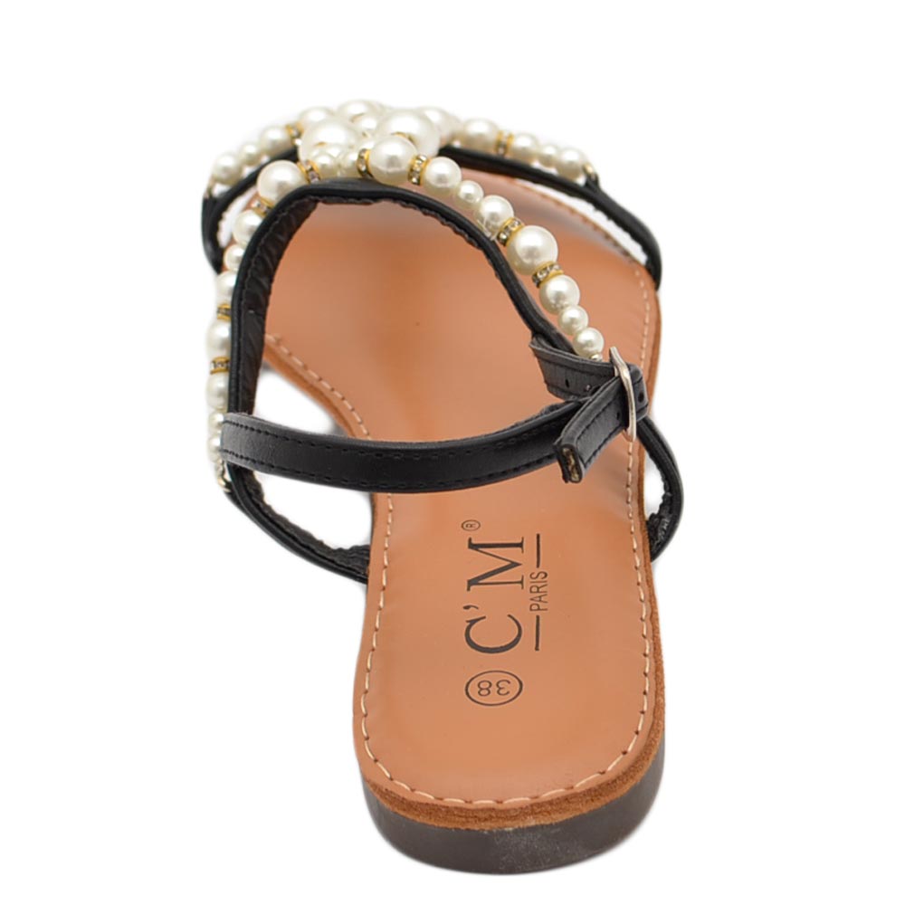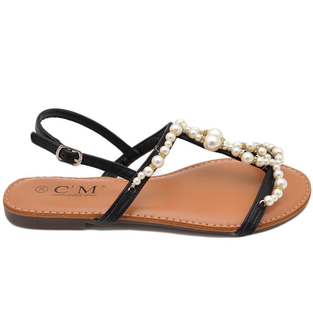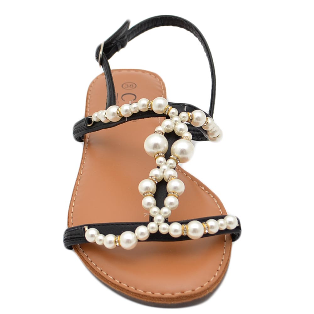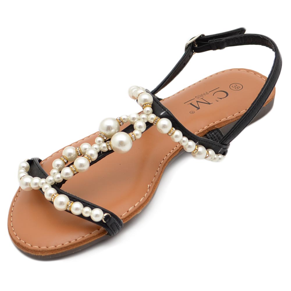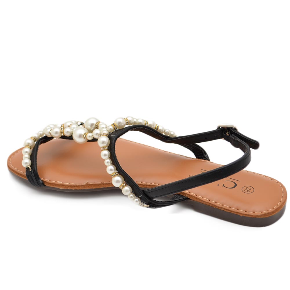 Sandalo basso positano donna nero fascette con perle dettagli oro cinturino alla caviglia antiscivolo basic