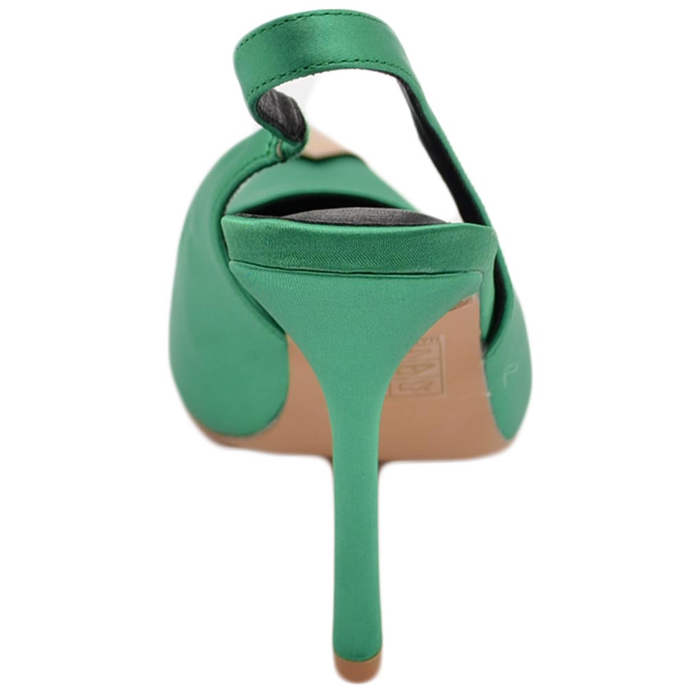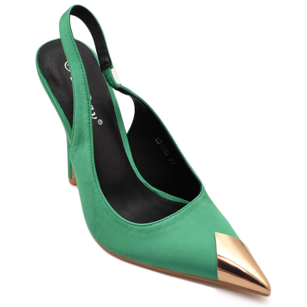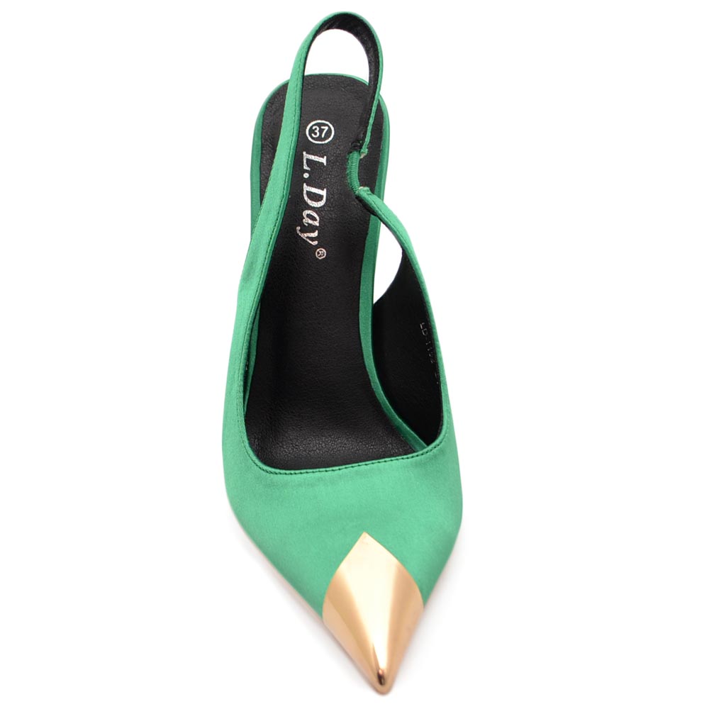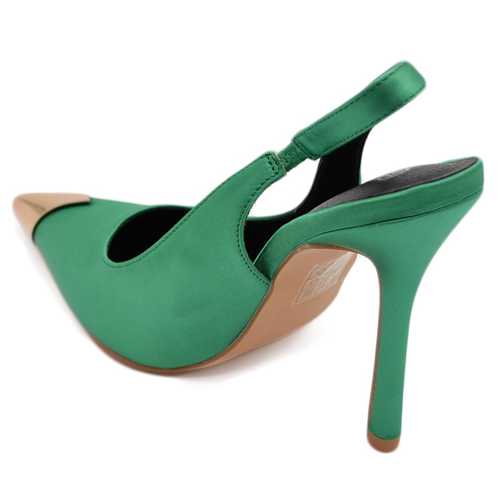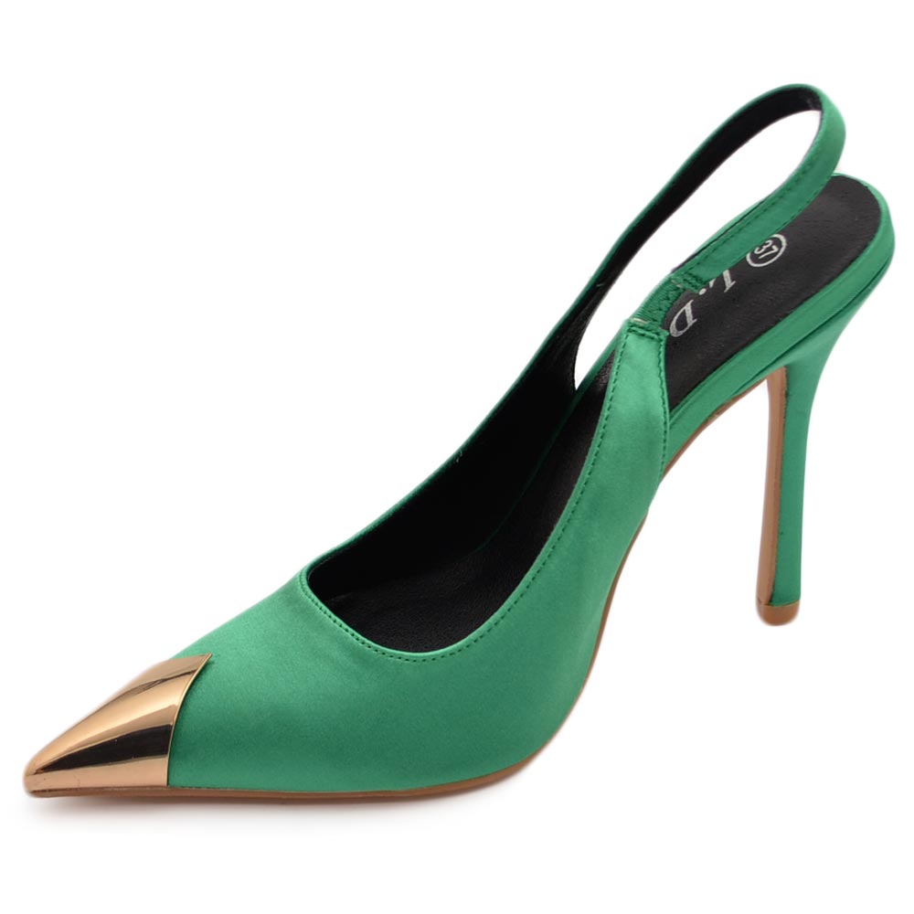 Decollete' donna verde smeraldo alto tacco spillo 12 cm aperto dietro placca oro punta in raso moda cerimonia elegante