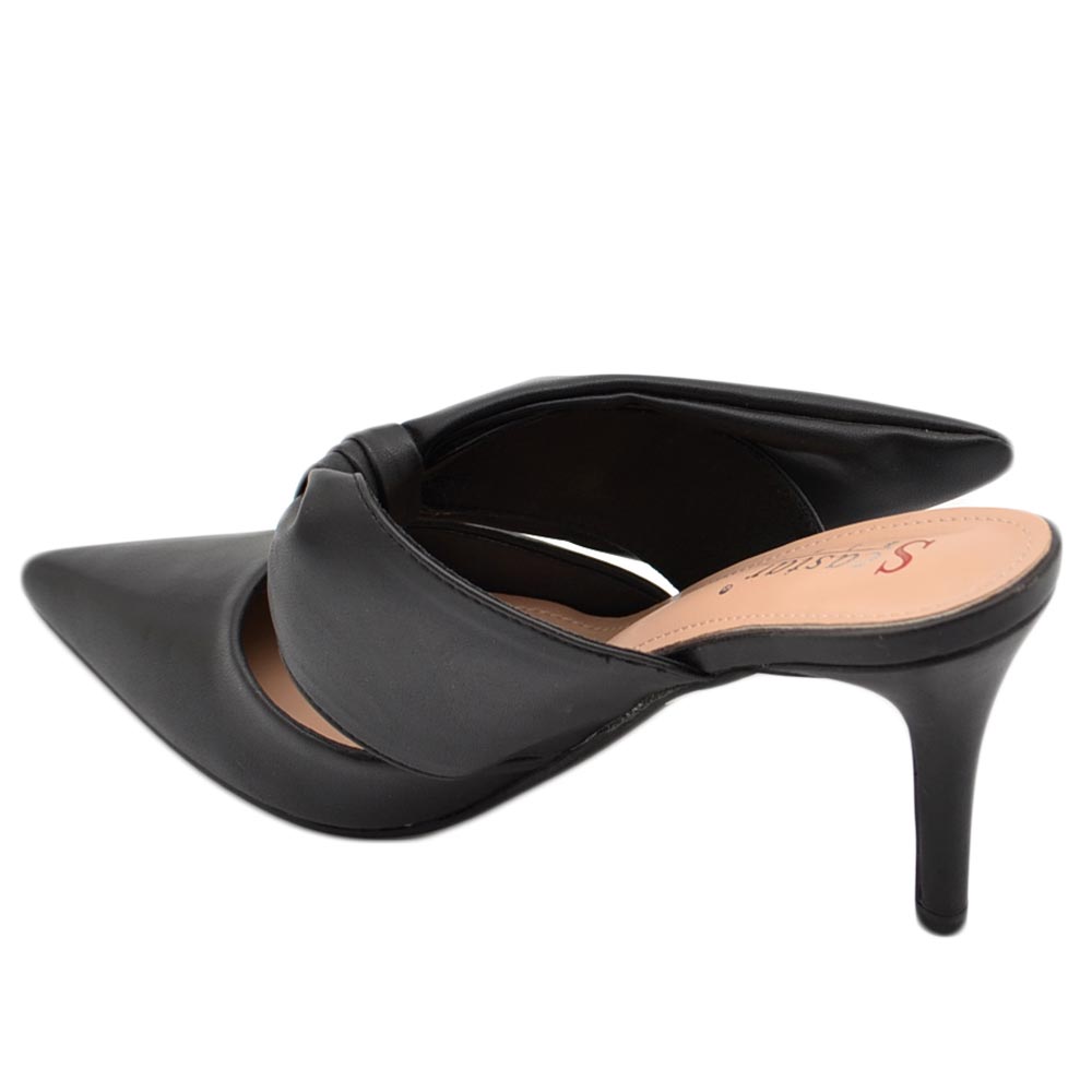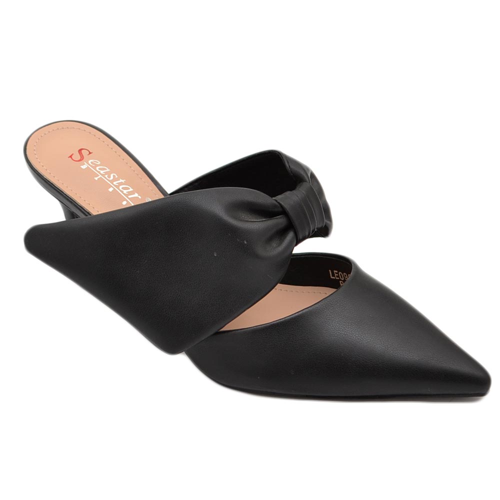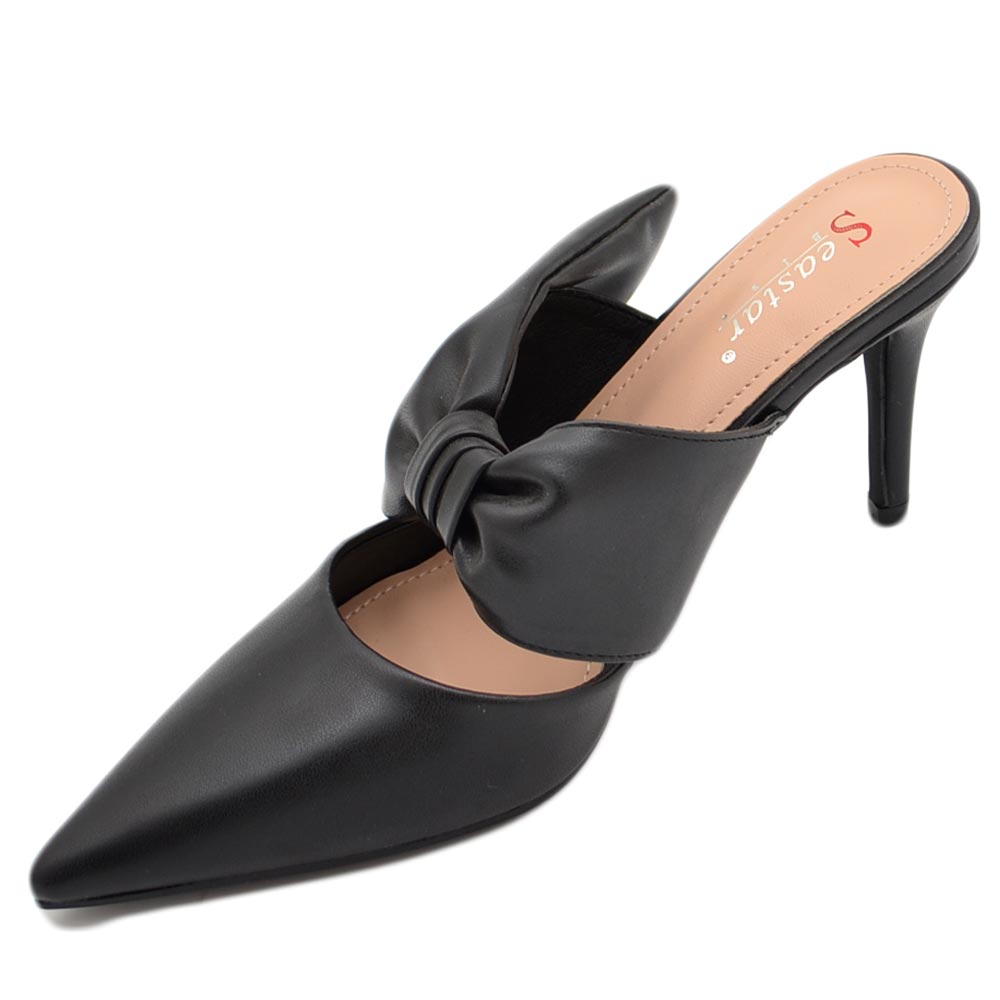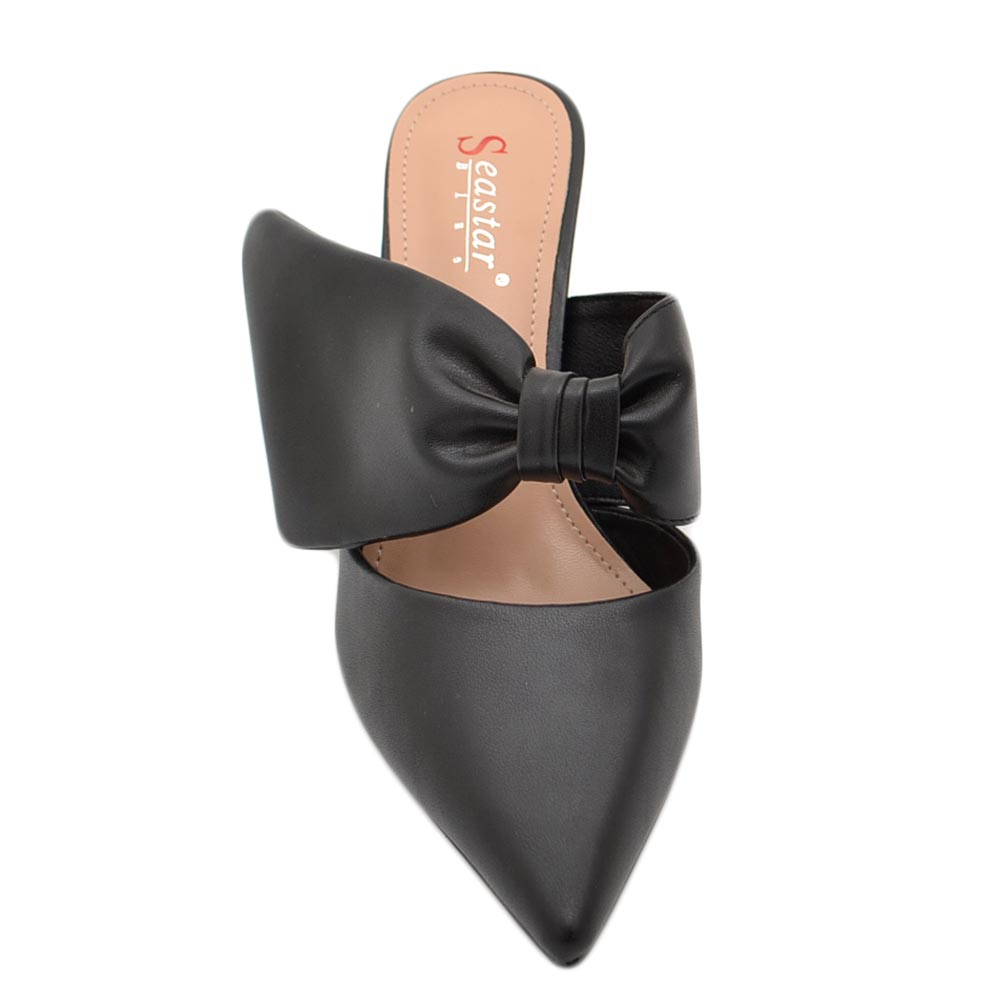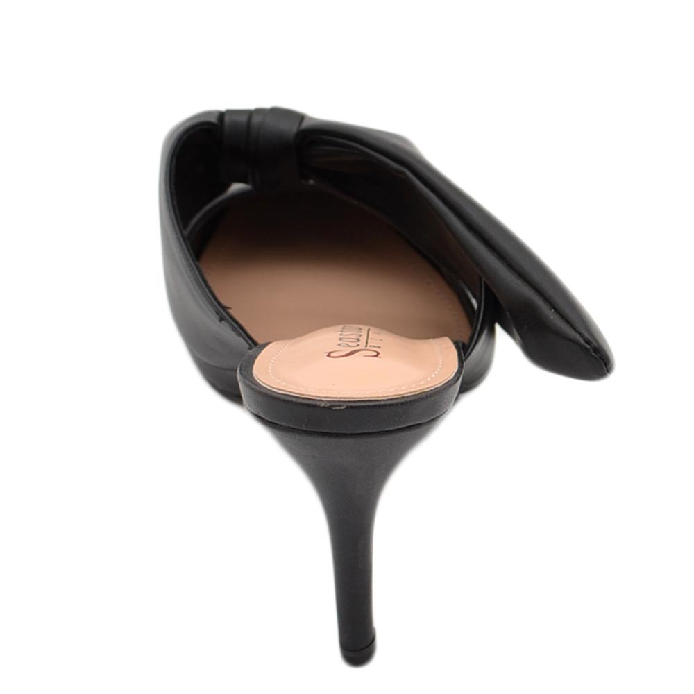Decollete' donna tacco sottile 7 comfort nero in raso con fiocco open toe morbido moda glamour evento