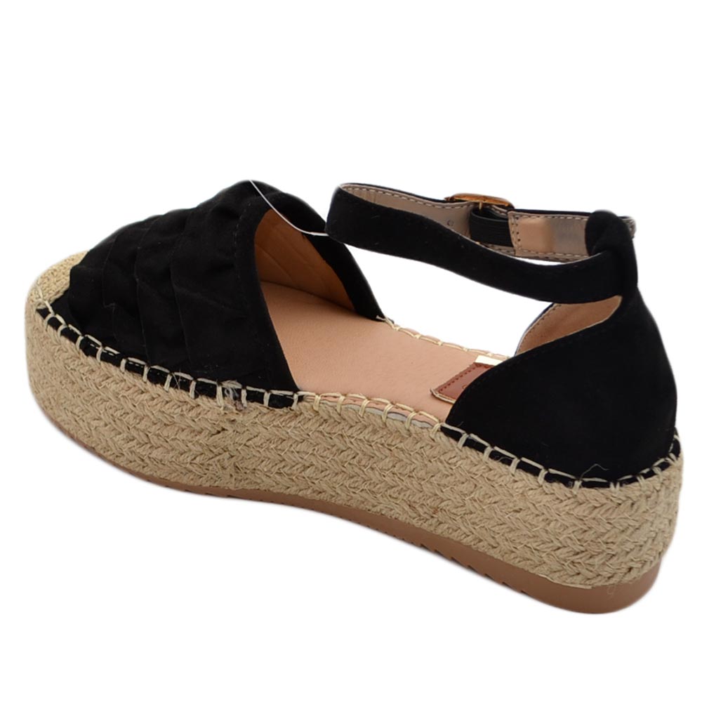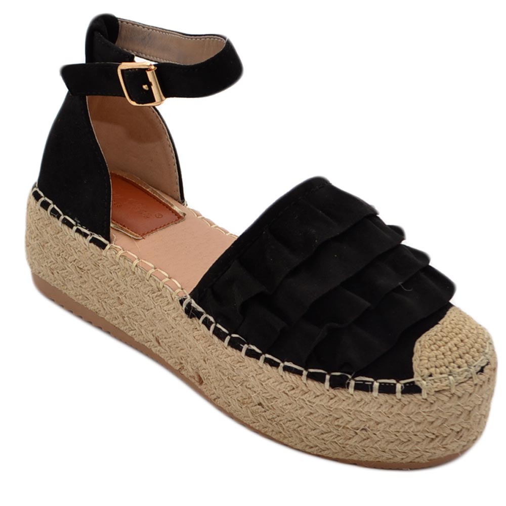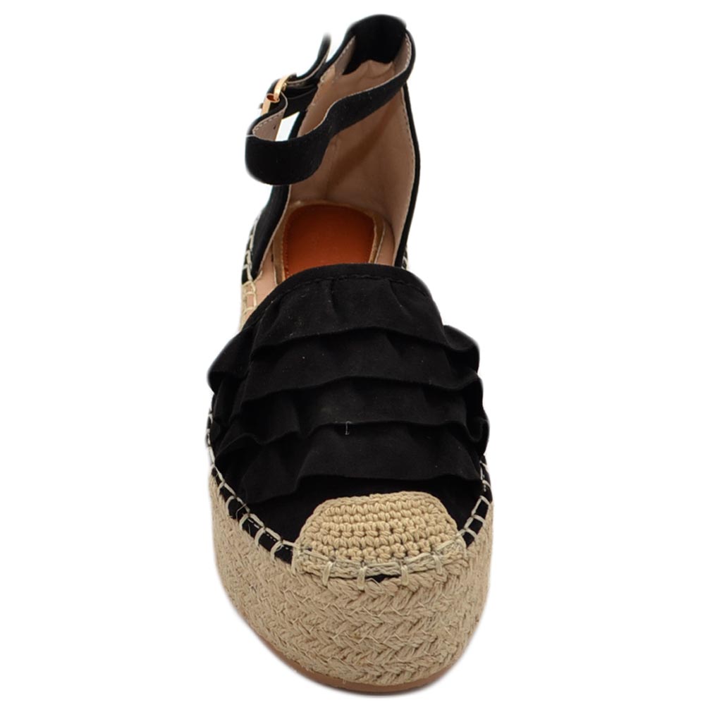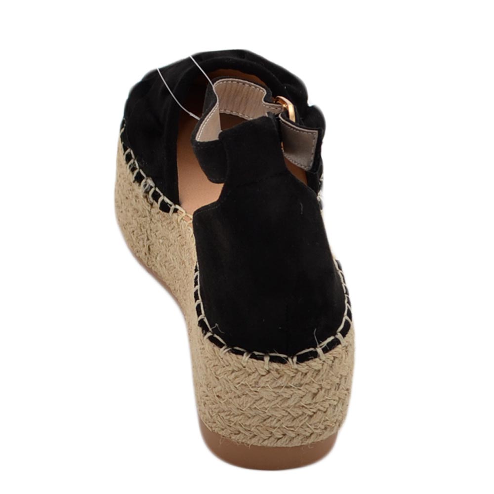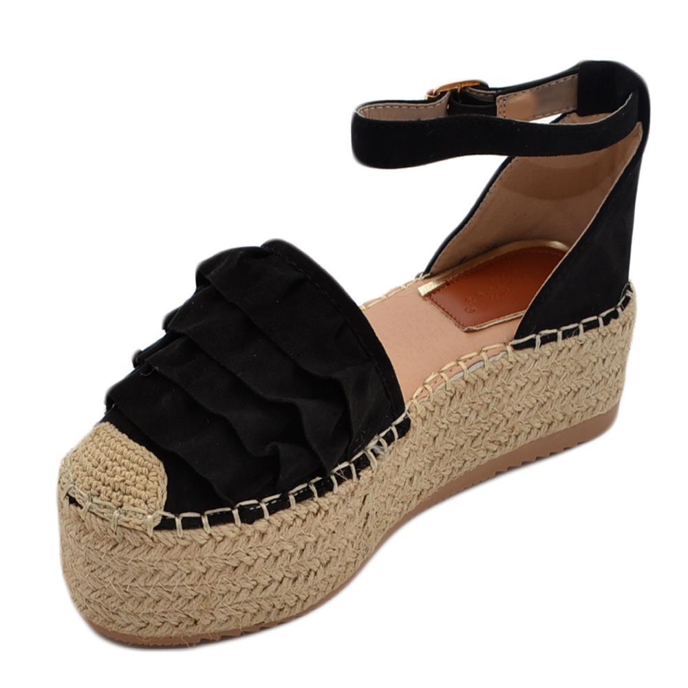 Espadrillas donna aperte ai lati in camoscio nero arricciato morbide comode con cinturino alla caviglia fondo paglia