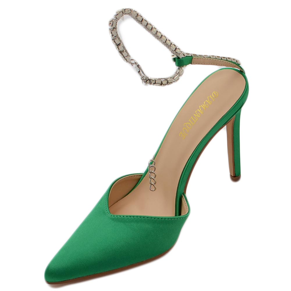 Decollete' donna gioiello elegante in ecopelle verde con tacco a spillo 120 cinturino gioiello scintillante effetto nudo