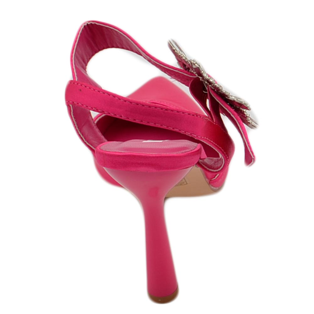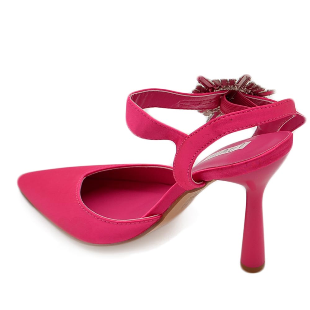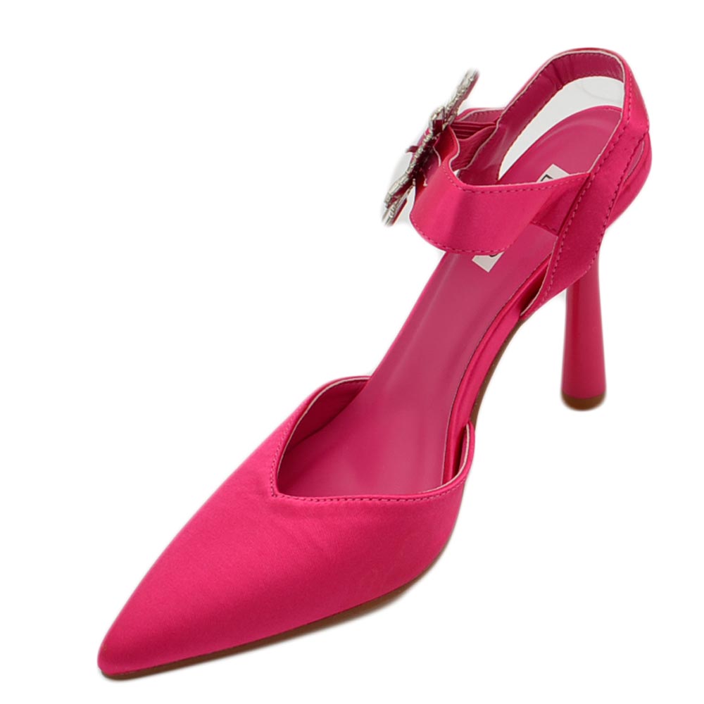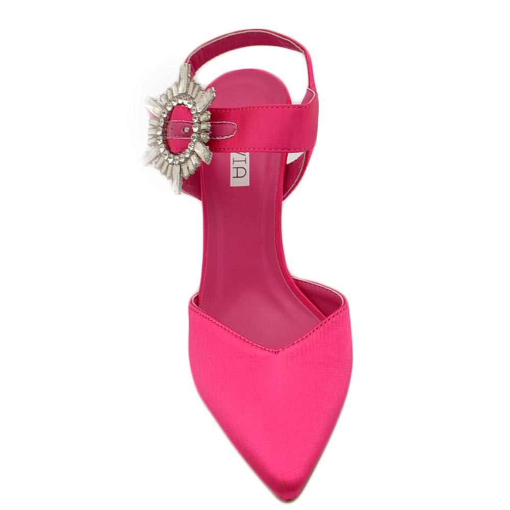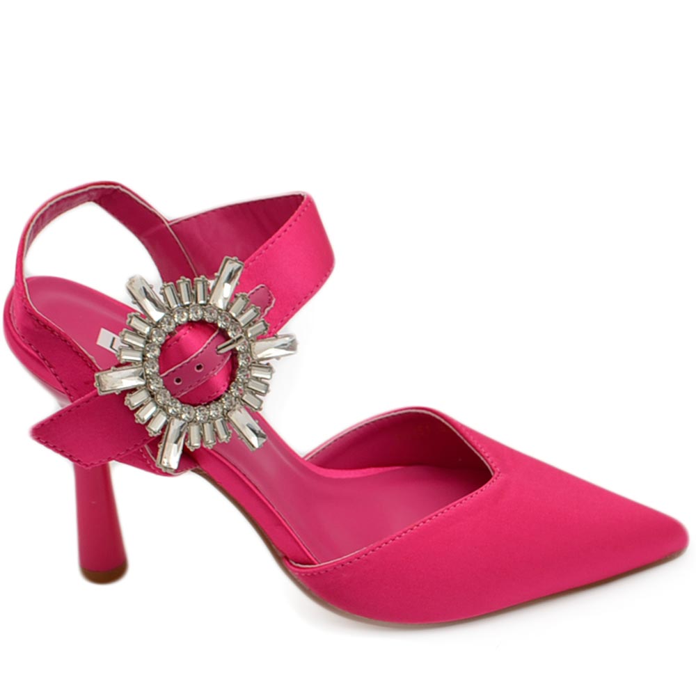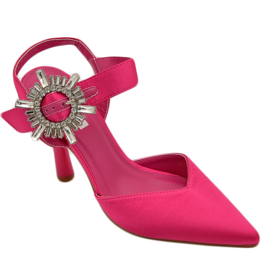 Decollete' scarpadonna gioiello in raso fucsia applicazione spilla cinturino alla caviglia tacco a spillo 10 comode