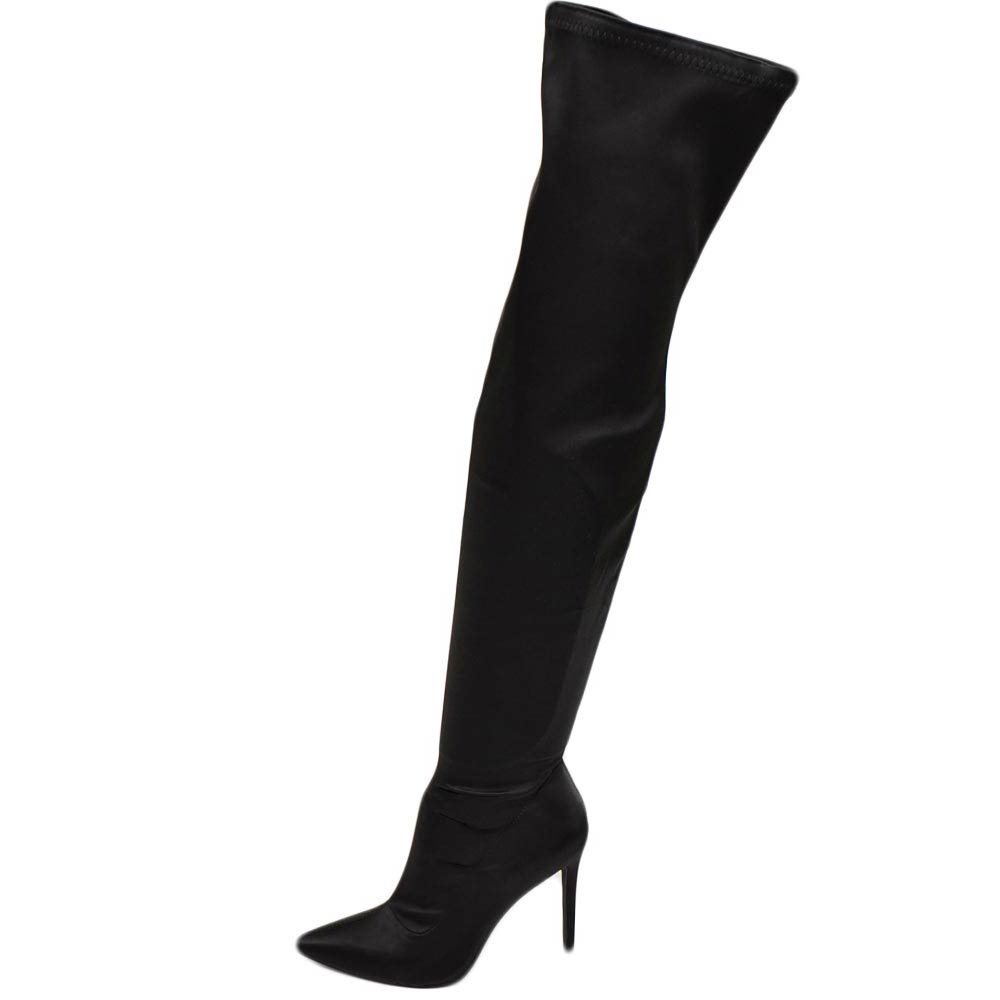 Stivale donna a punta alto in raso elastico nero sopra al ginocchio tacco a spillo 12 cm semilucido aderente con zip