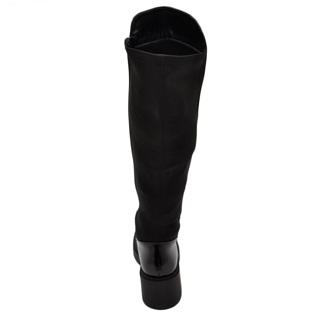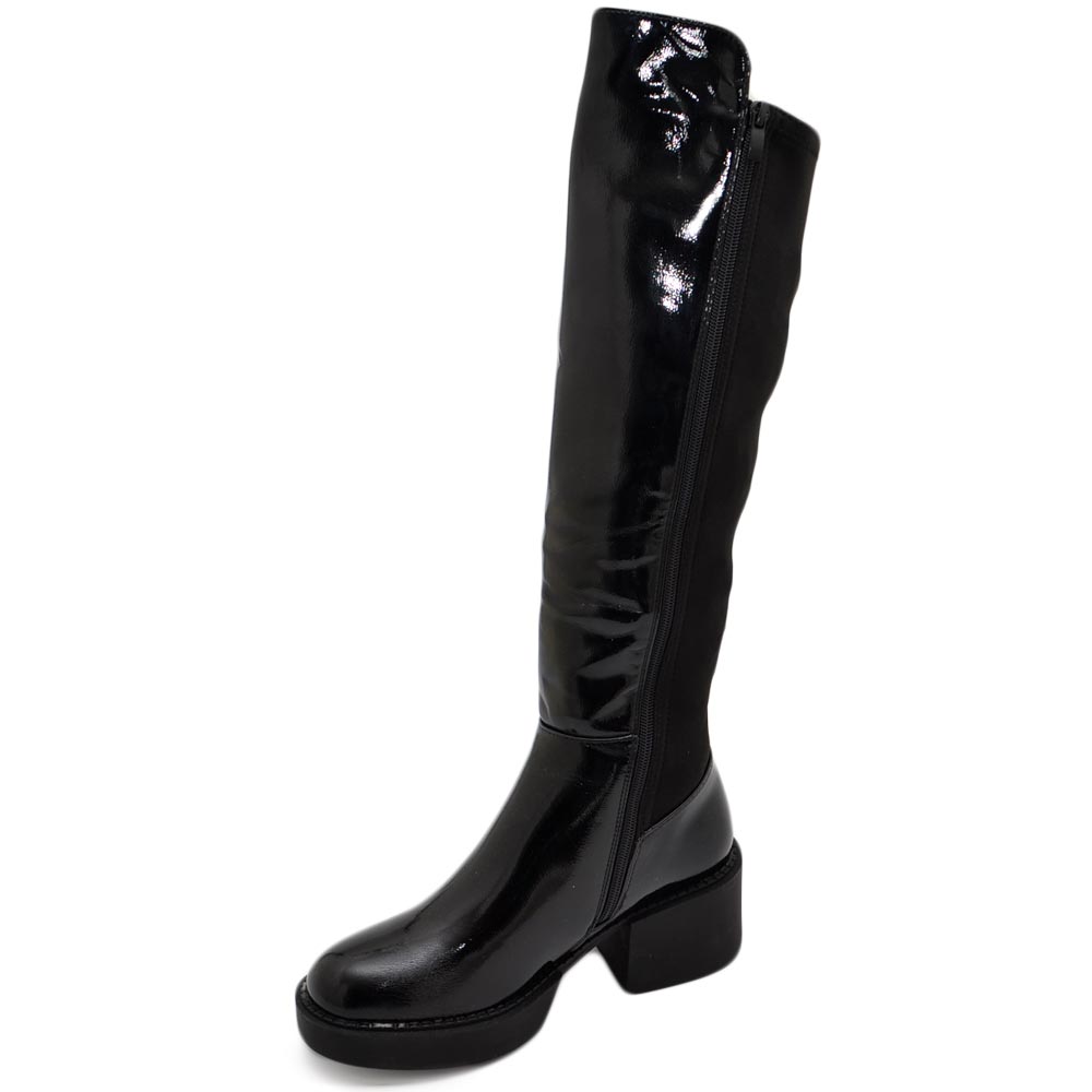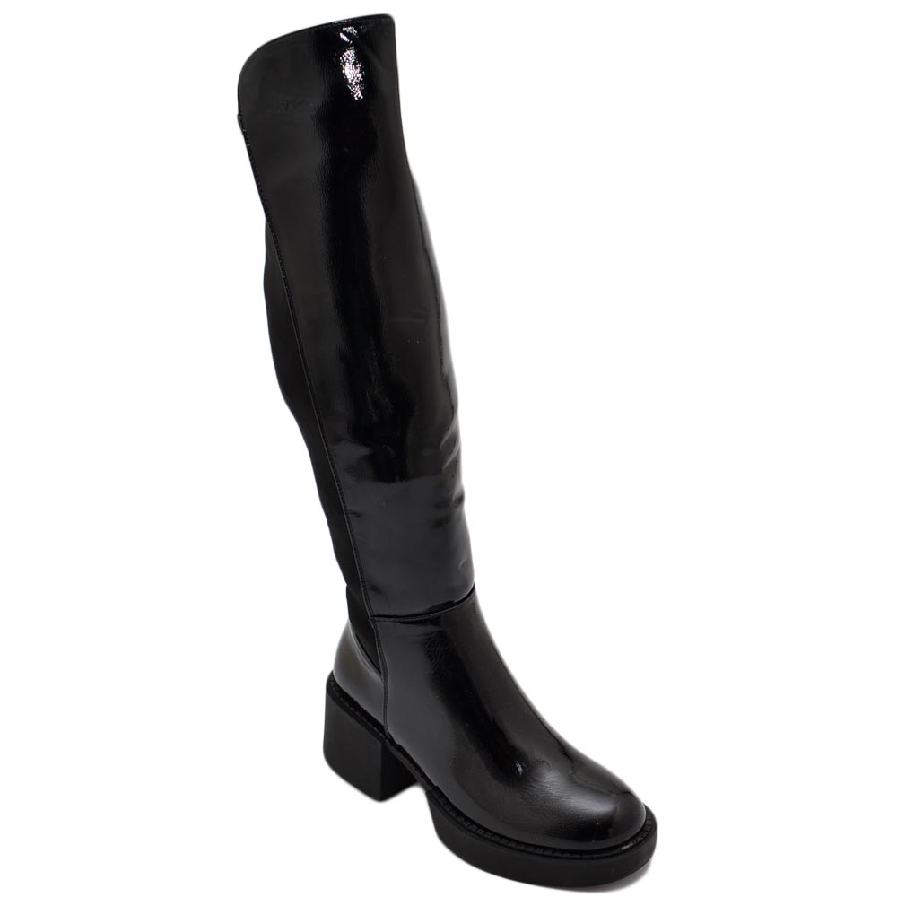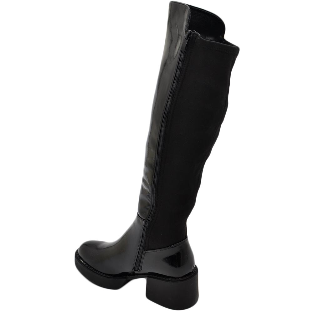 Stivali donna alto punta tonda nero lucido gambale aderente elasticizzato alto sopra al ginocchio tacco 4 plateau curvy