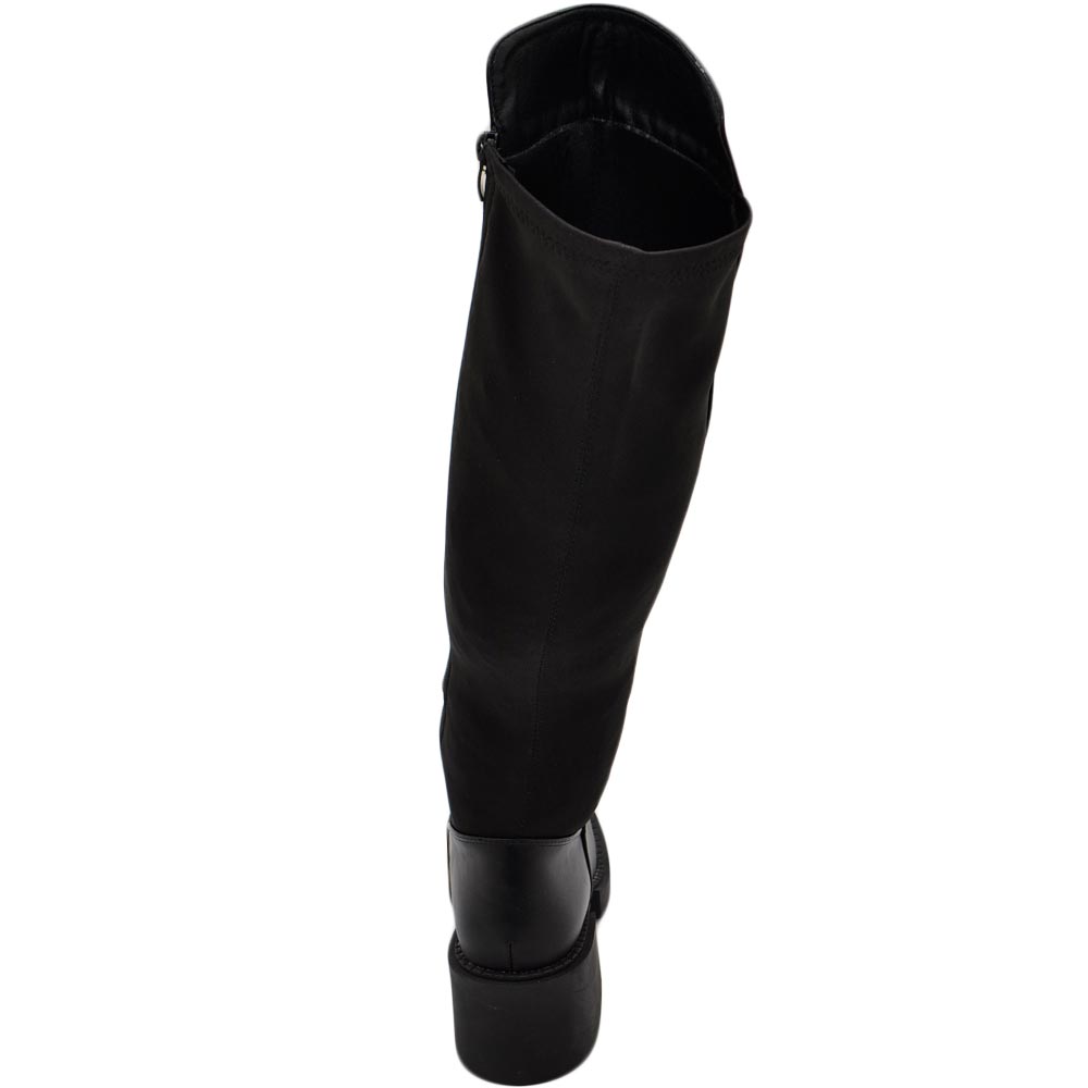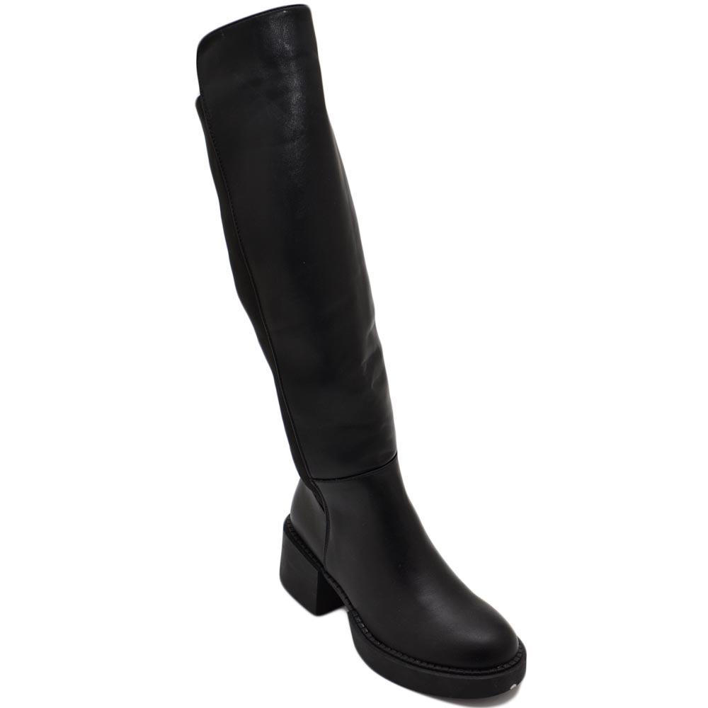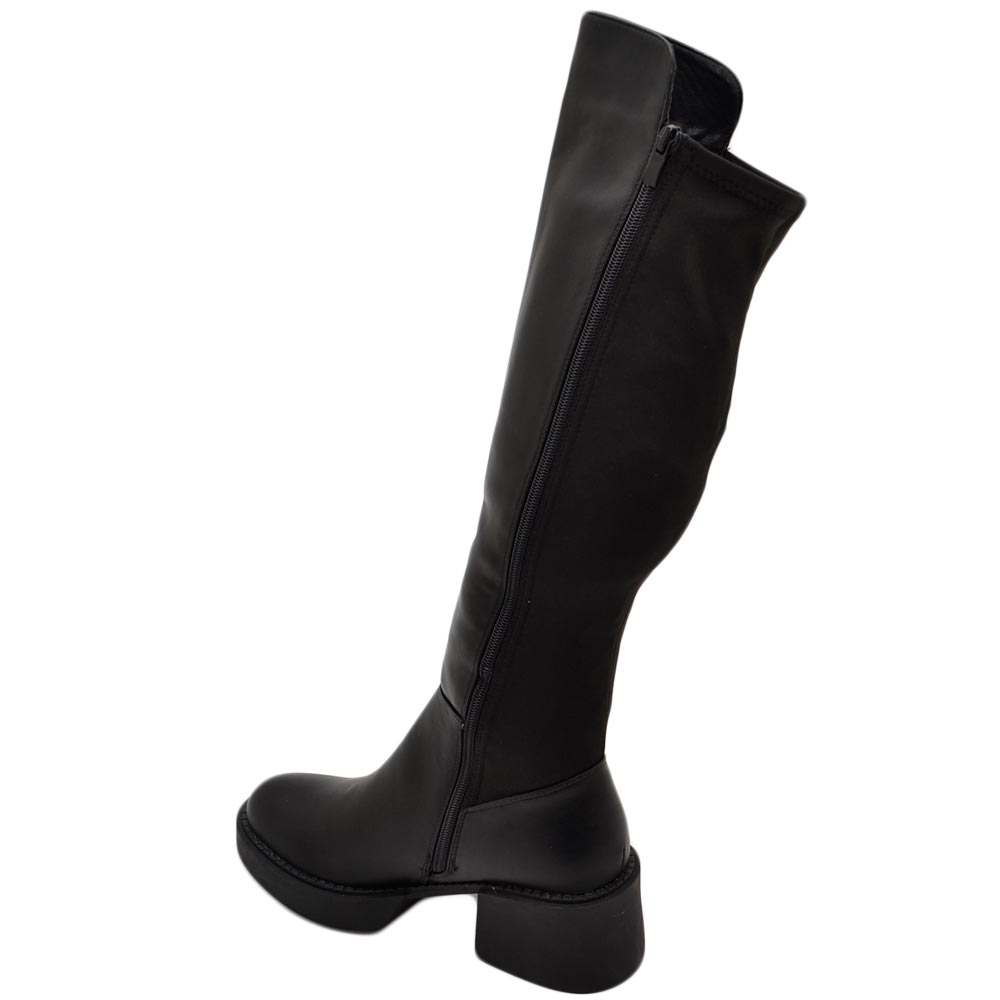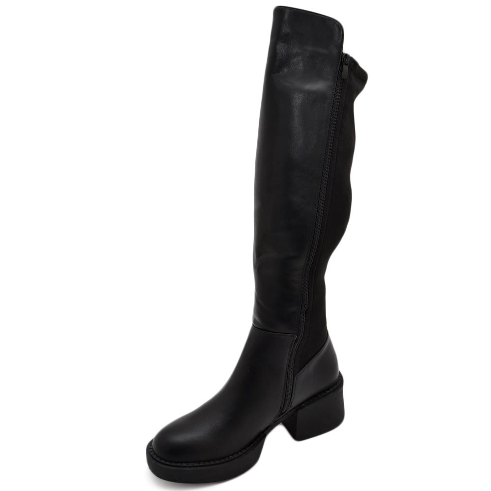 Stivali donna alto punta tonda nero gambale aderente elasticizzato alto sopra al ginocchio tacco 4 plateau zip curvy