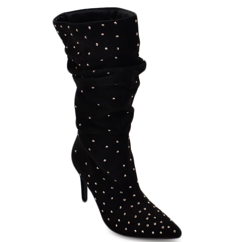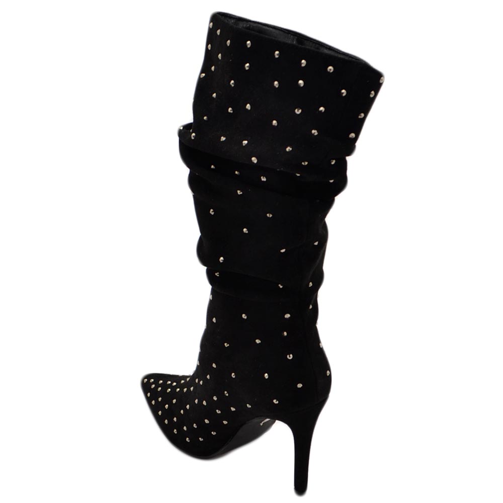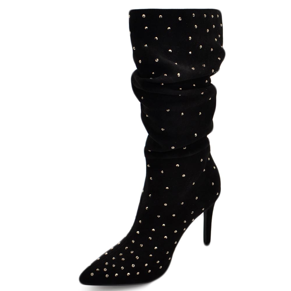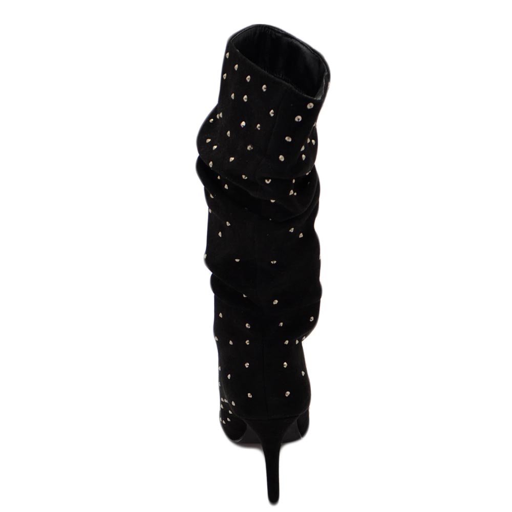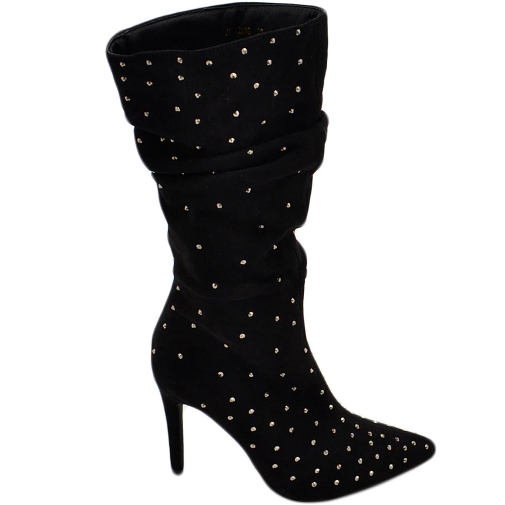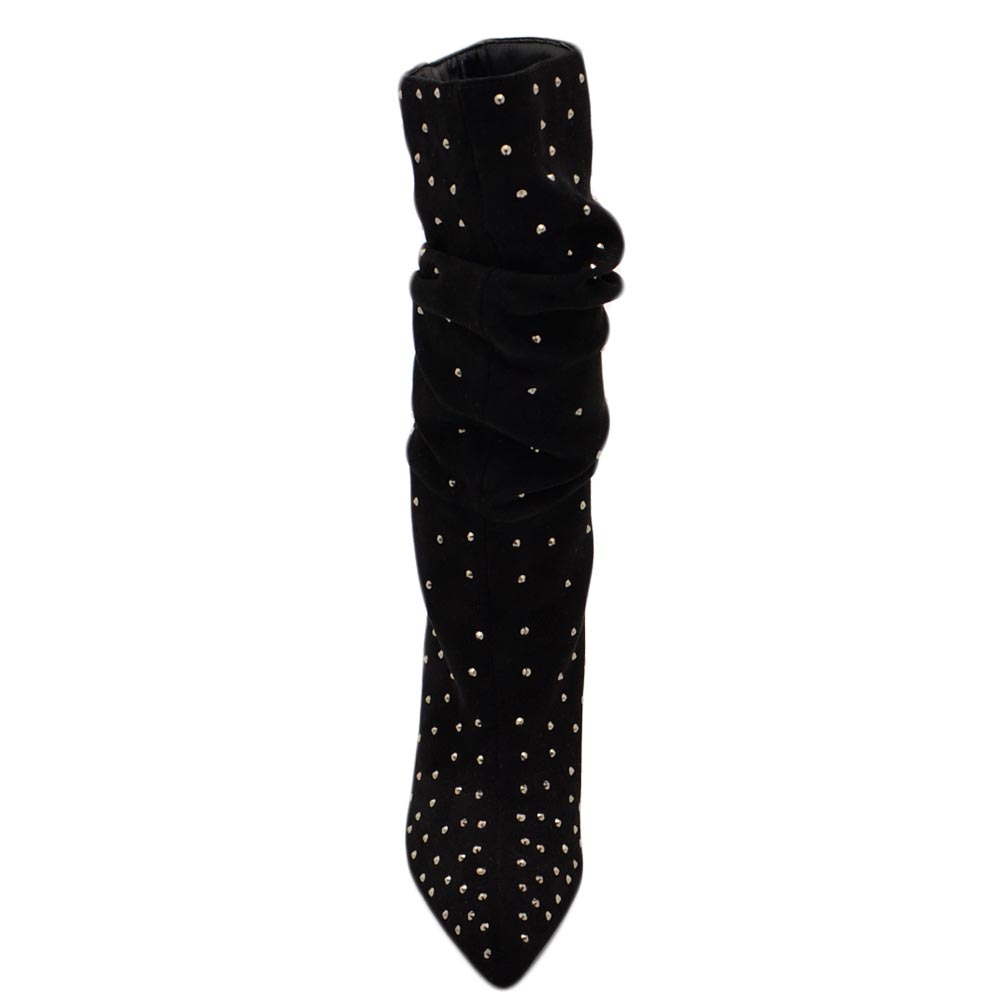 Tronchetti donna a punta alto meta' polpaccio in camoscio nero ricoperto di strass tacco a spillo 12 cm morbido con zip