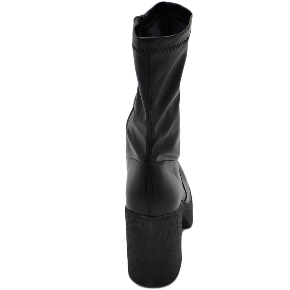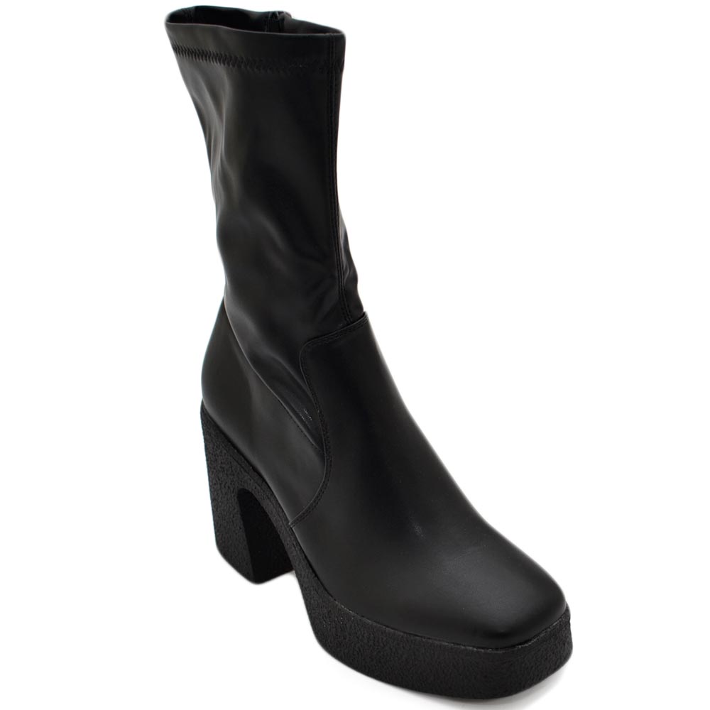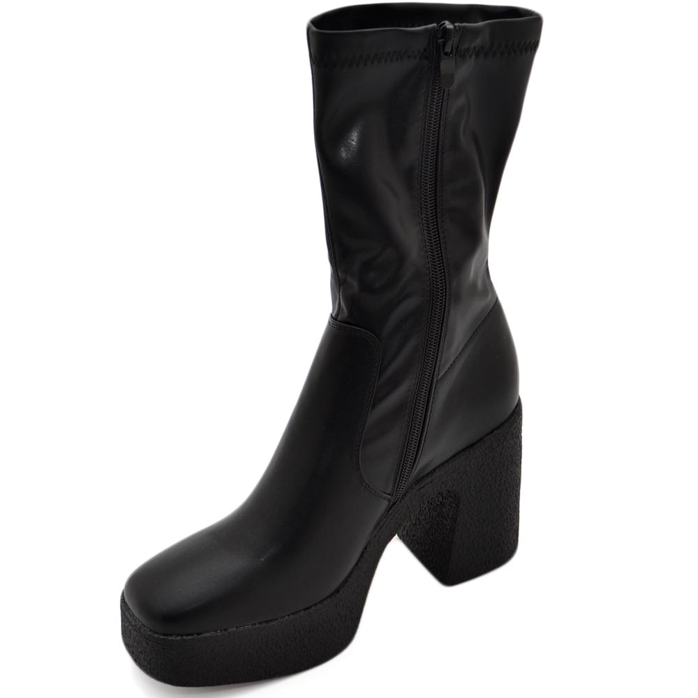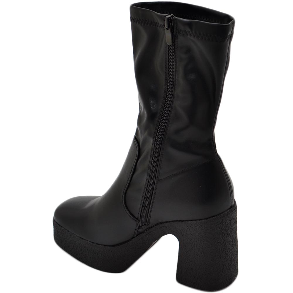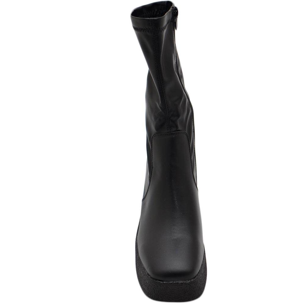 Tronchetto donna stivale nero meta' polpaccio punta quadrata tacco doppio 6 cm plateau zeppa 2 cm zip effetto calzino