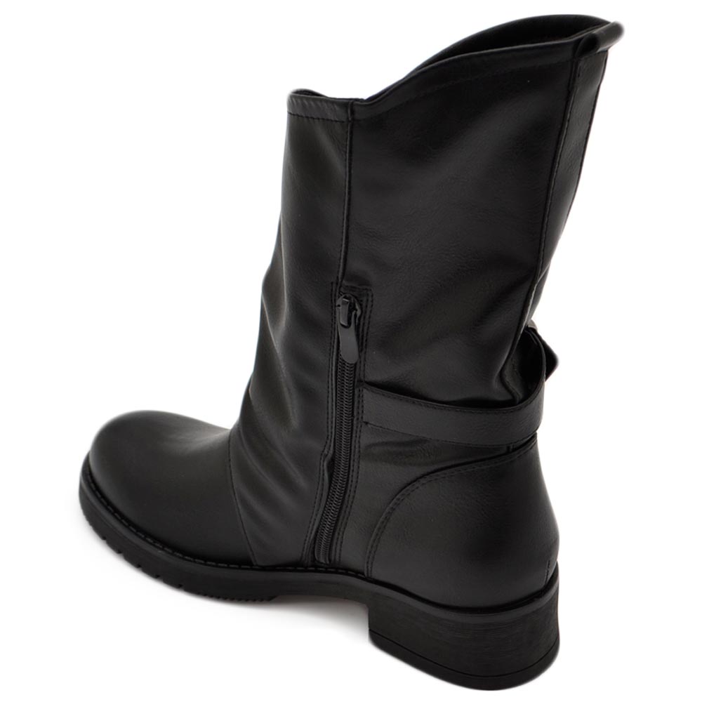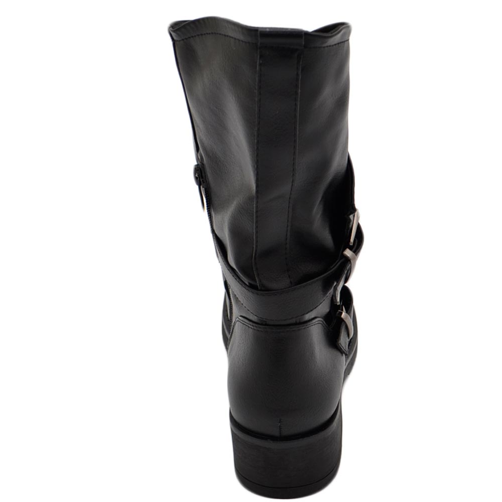Stivale basso donna biker con collo largo asimmetrico doppia zip fondo in gomma zigrinata con fibbie casual