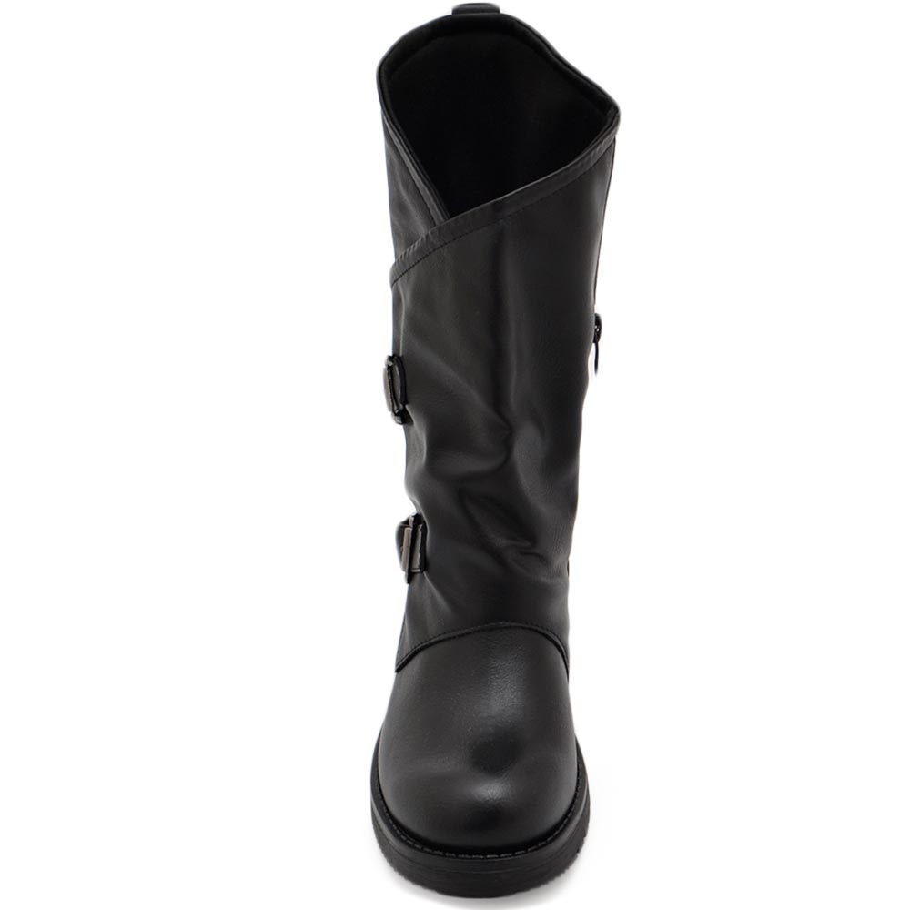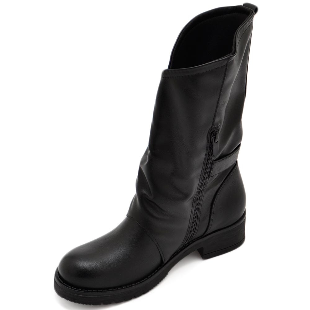 Lo stivaletto alto da donna o biker è realizzato con tomaia ecopelle morbida, suola rialzato in gomma, zip sul lato interno che rende maggiormente pratica la calzata. E' un modello all'ultima moda, adatto all'inverno della donna trendy che vuole camminare comodamente nel suo tempo libero indossando scarpe di grande qualità.