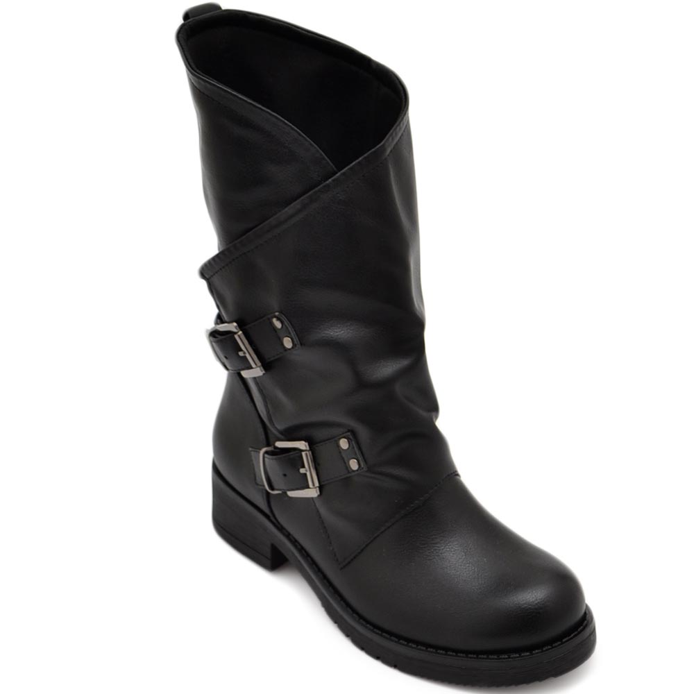 Stivali bassi donna morbidi biker in pelle cuoio risvolto e fibbia in contrasto fondo comodo antiscivolo moda glamour.