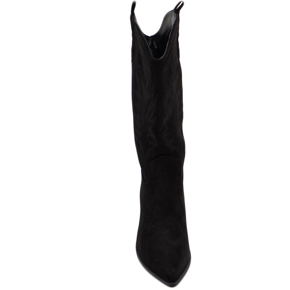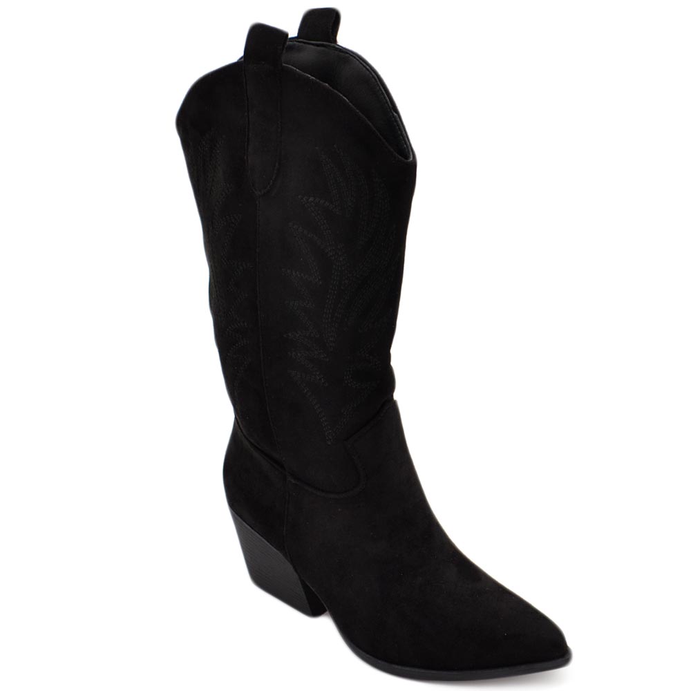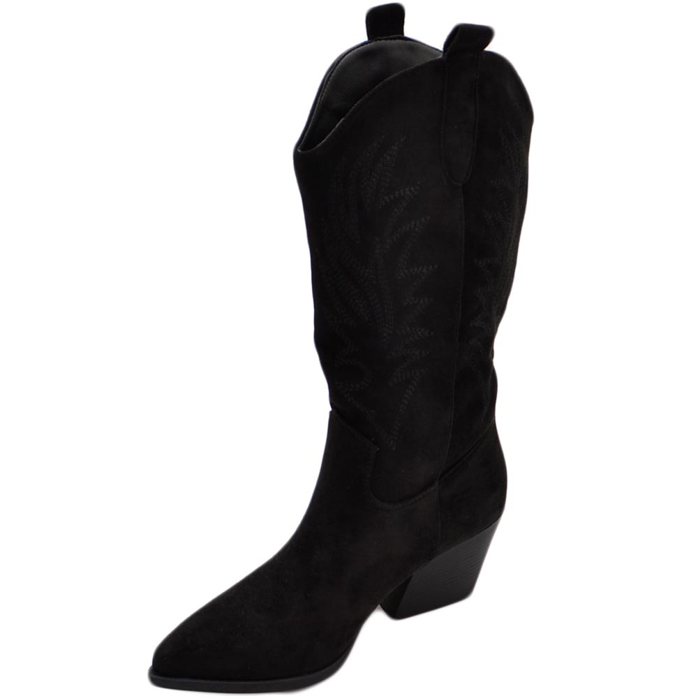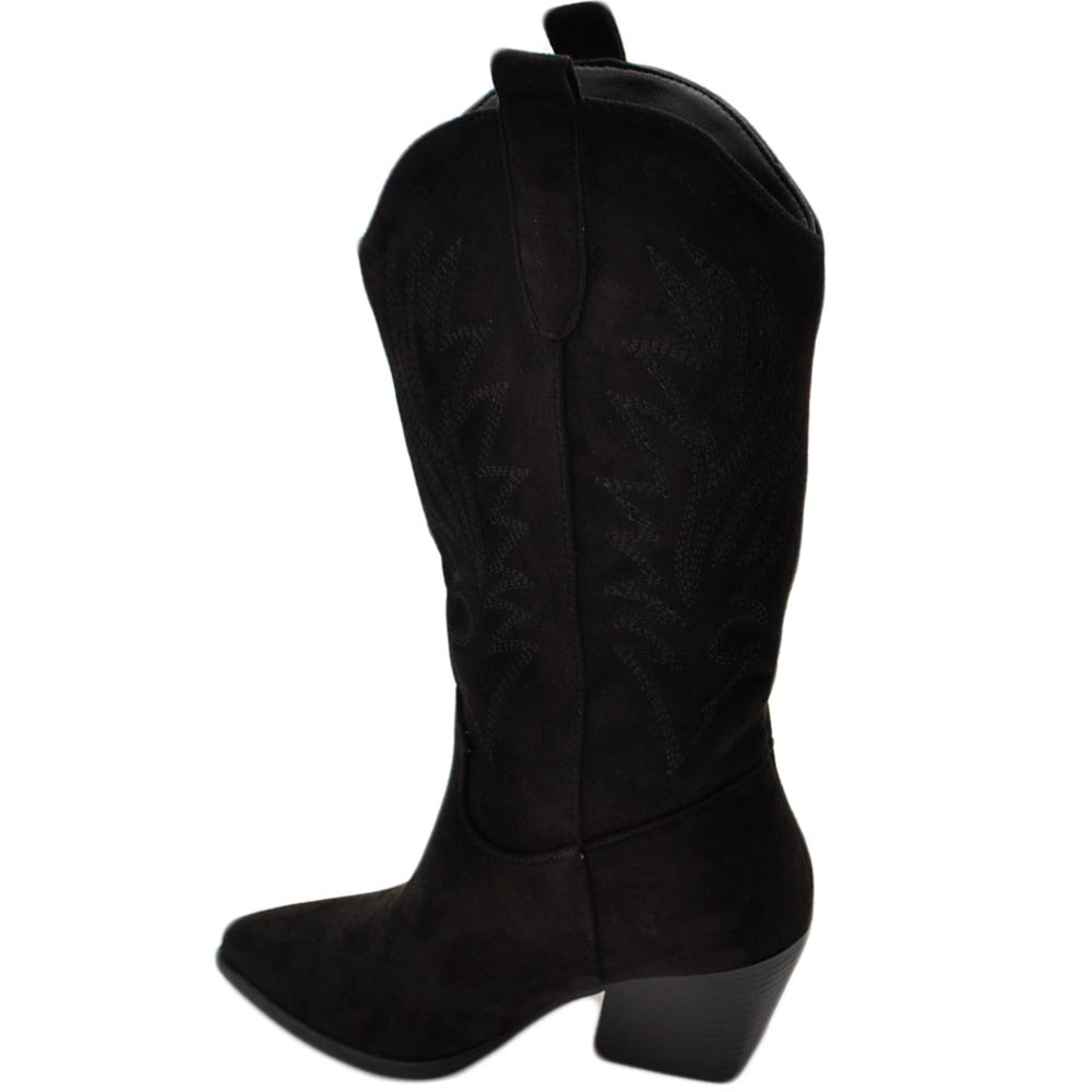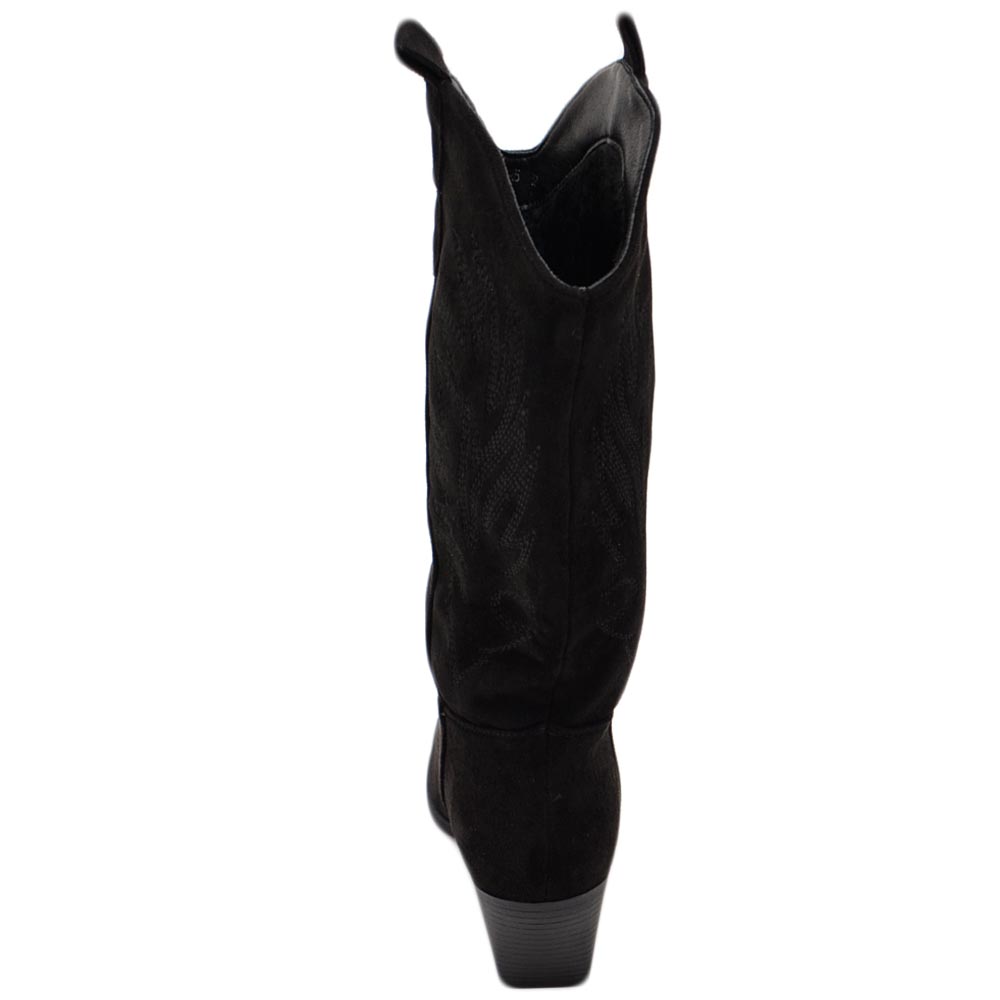 Stivali donna camperos texani stile western nero fantasia laser su pelle scamosciata tinta unita altezza polpaccio