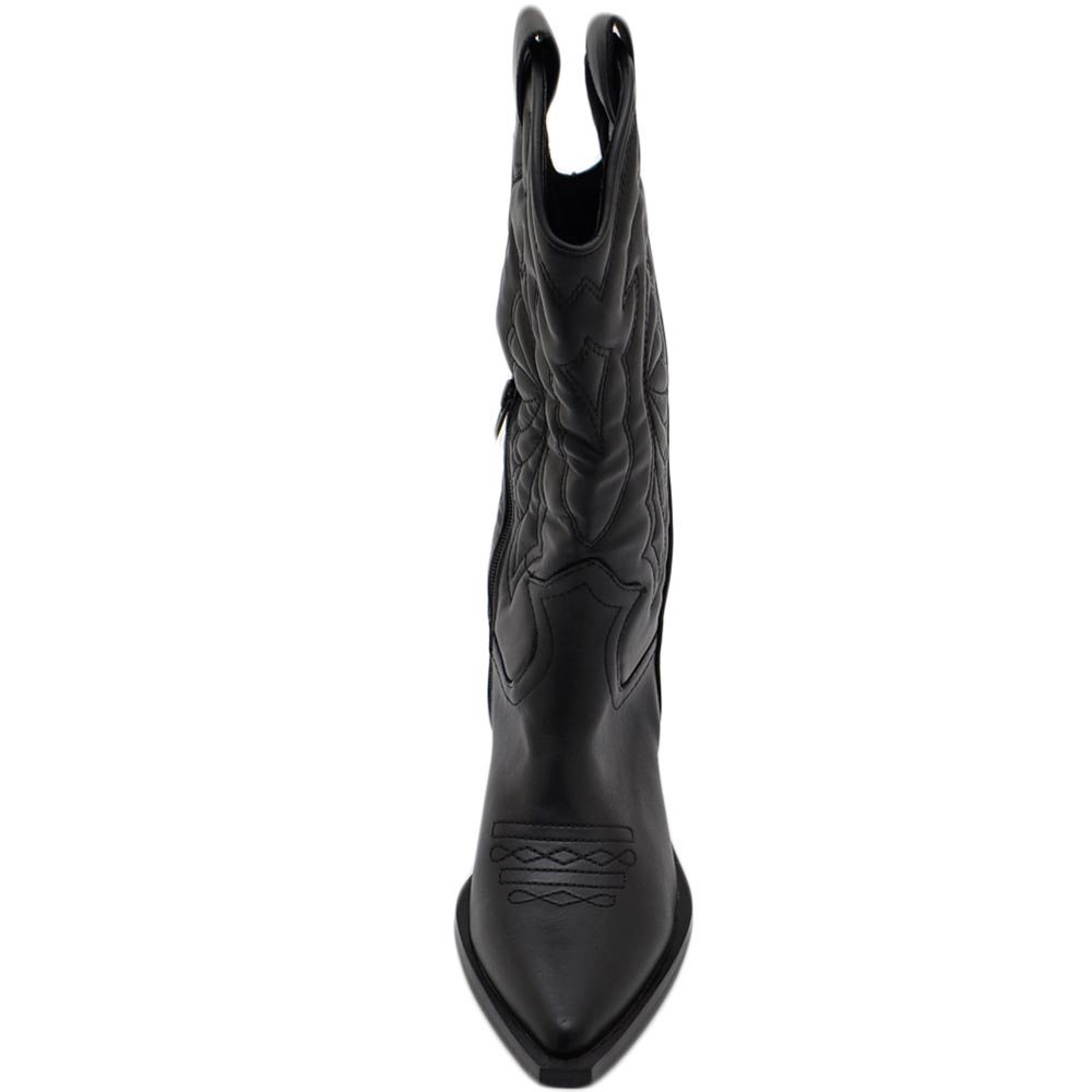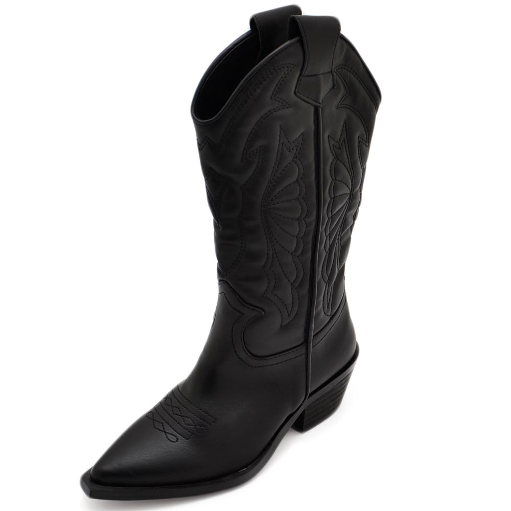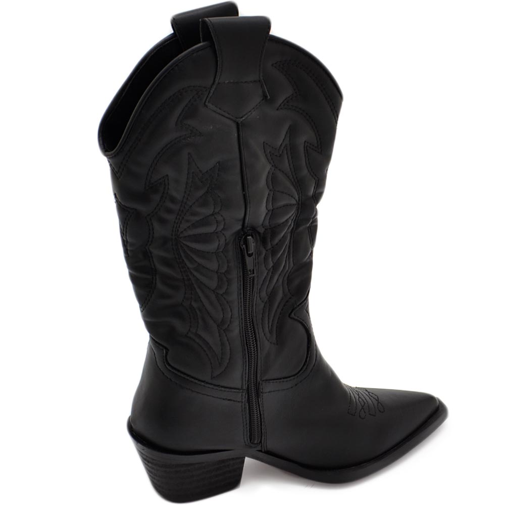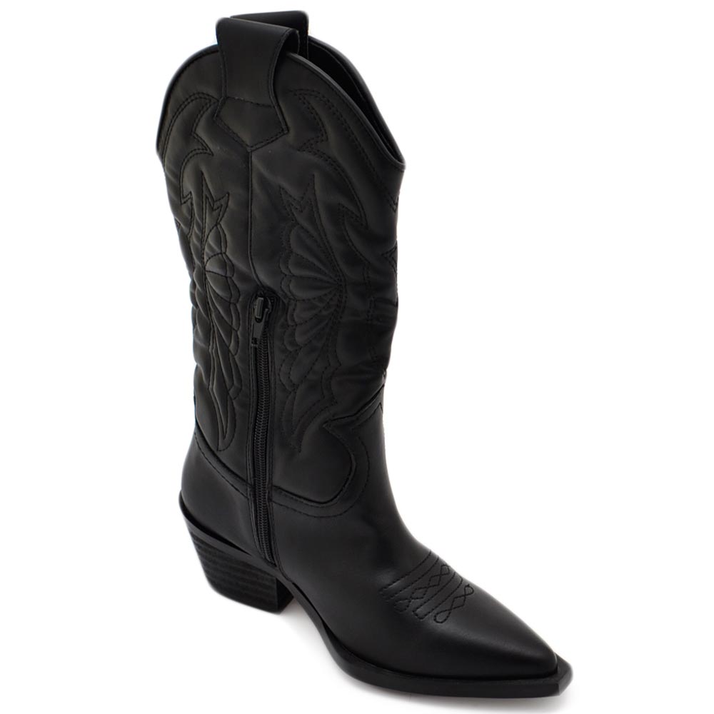 Stivali donna camperos texani stile western nero fantasia laser su ecopelle tinta unita altezza polpaccio