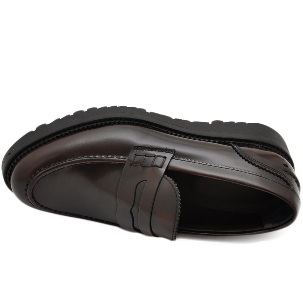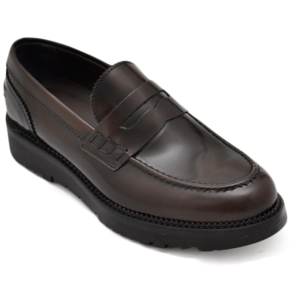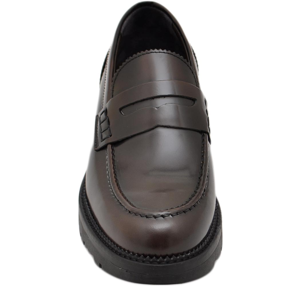 Mocassimo college uomo classico in vera pelle liscia marrone con suola alta zigrinata 3,5 cm