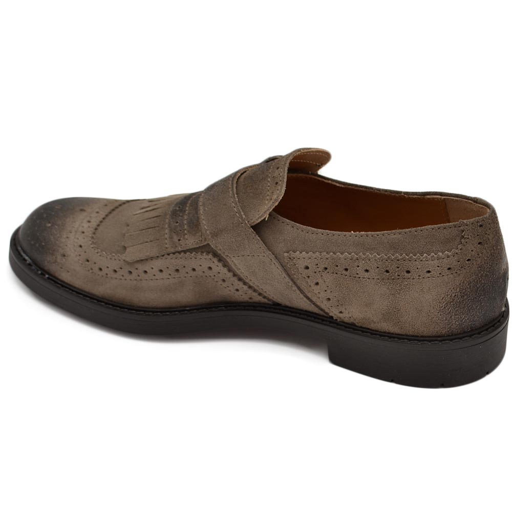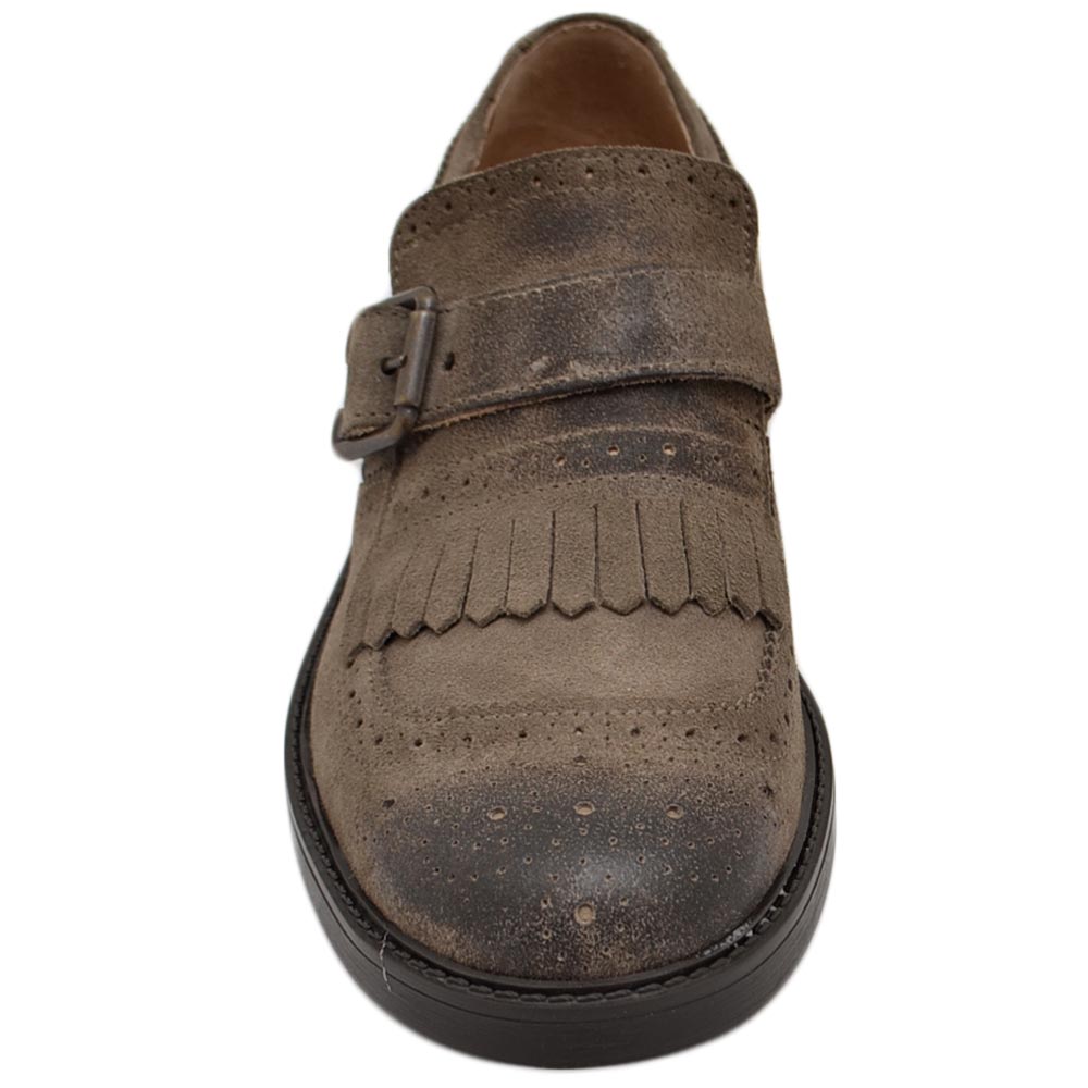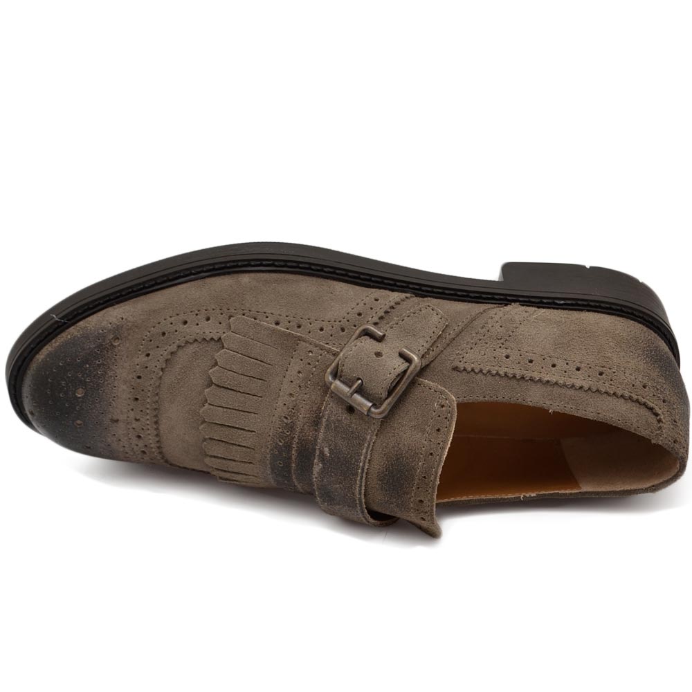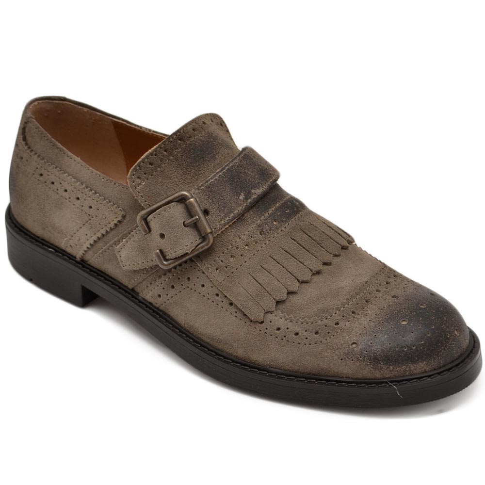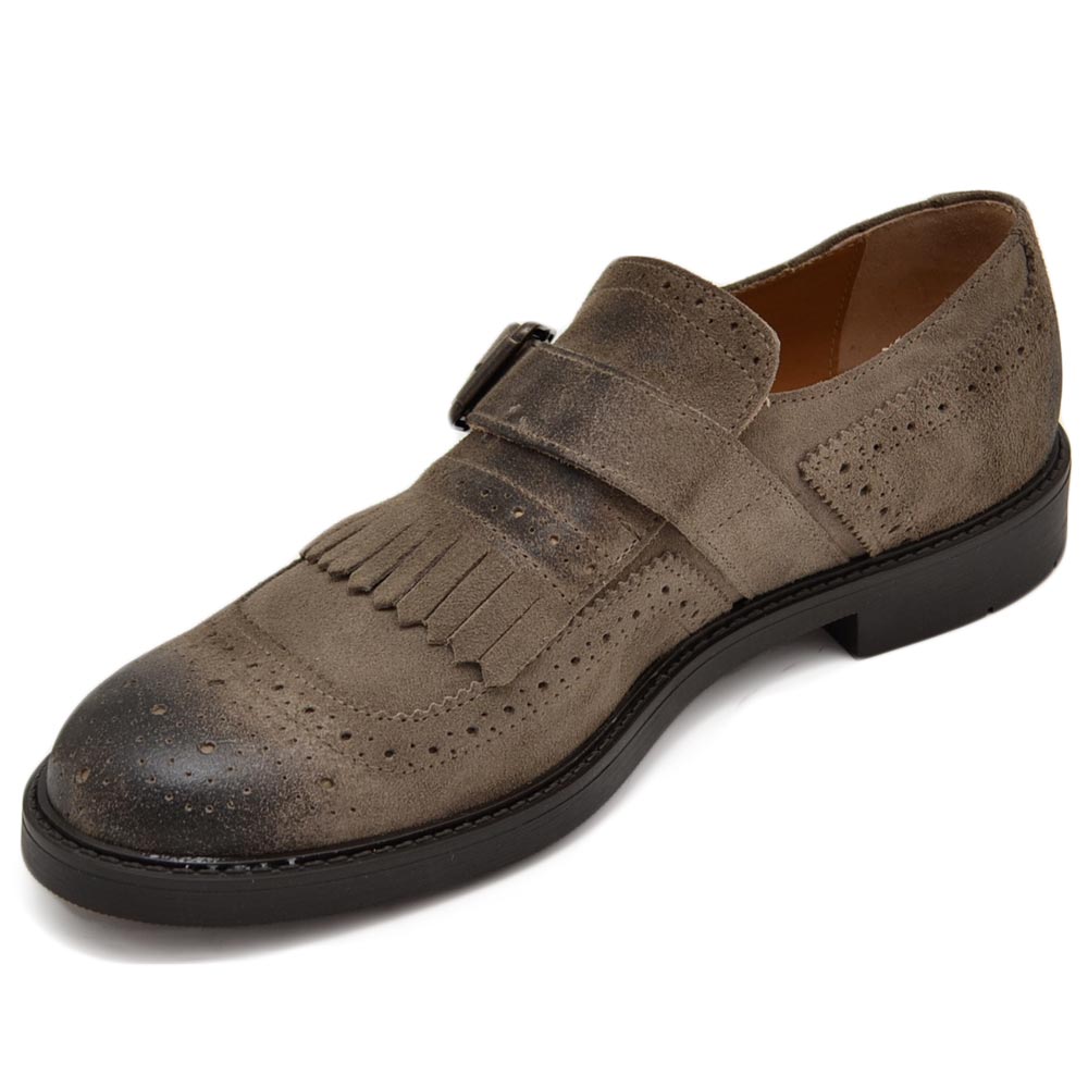 Scarpe uomo stringate decorate beige in vera pelle scamosciata effetto vintage con frange e fibbia fondo gomma light