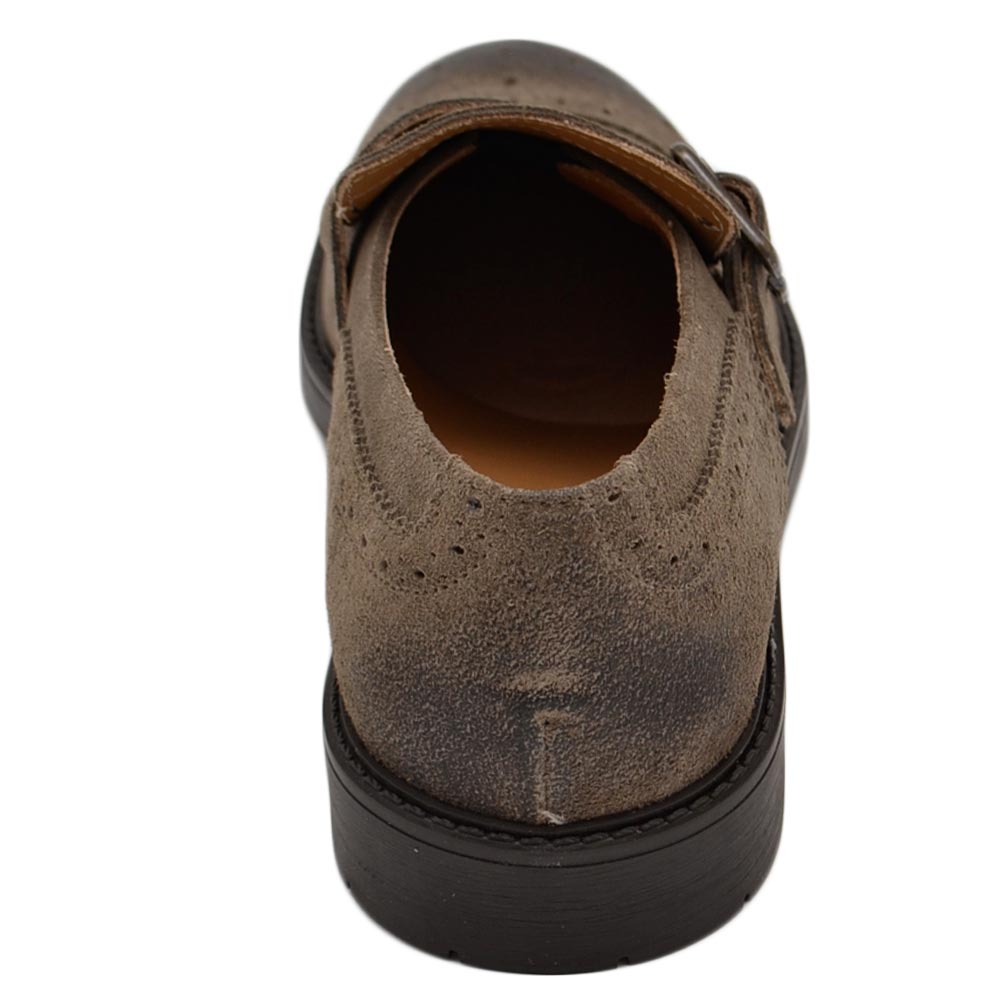 Scarpe uomo doppia fibbia eleganti in camoscio beige fondo grigio e guardolo in tinta handmade in italy.