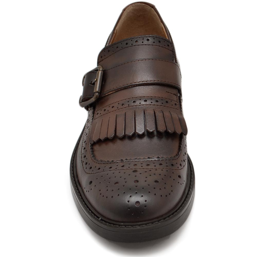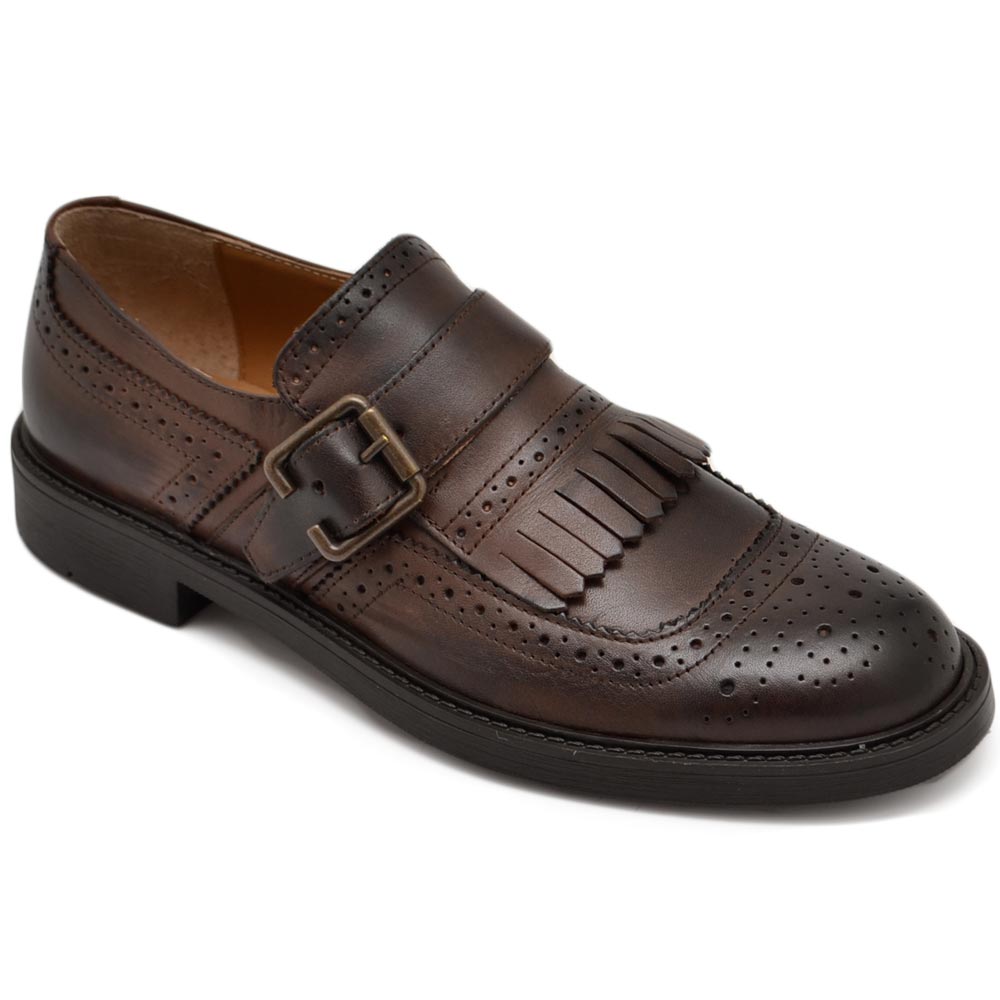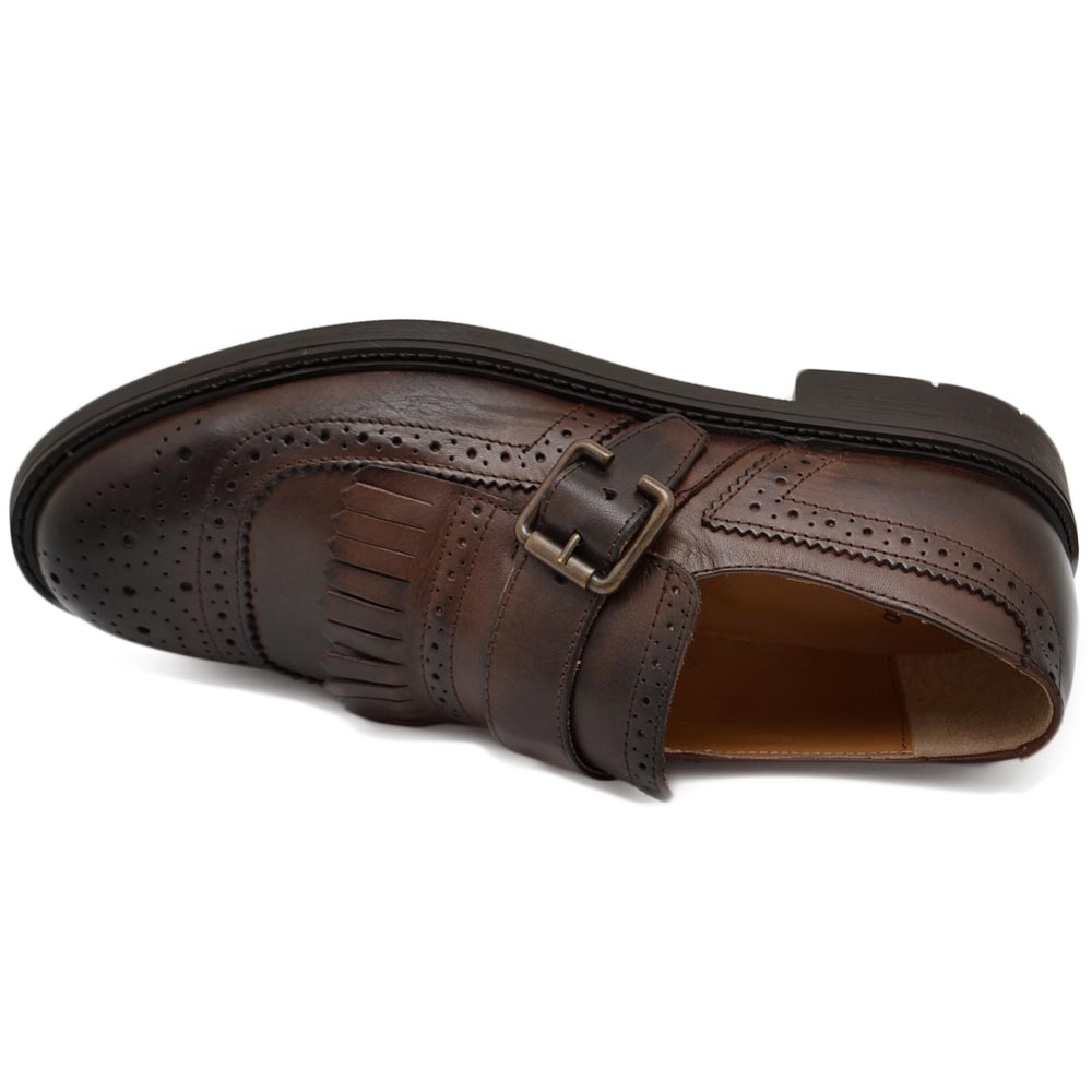Scarpe uomo stringate decorate marrone in vera pelle nappa effetto vintage con frange e fibbia fondo gomma light