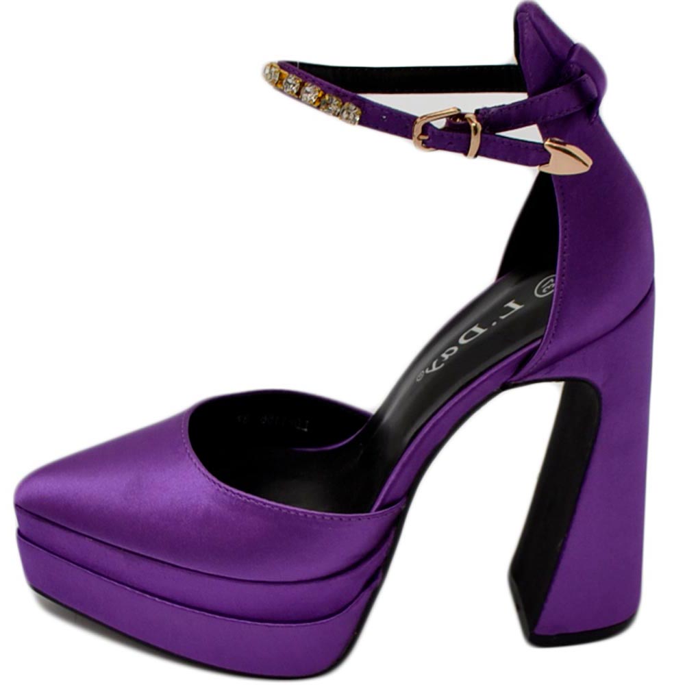 Decollete' donna mary jane a punta in raso viola con plateau 4 cm e tacco largo 15 cinturino strass alla caviglia