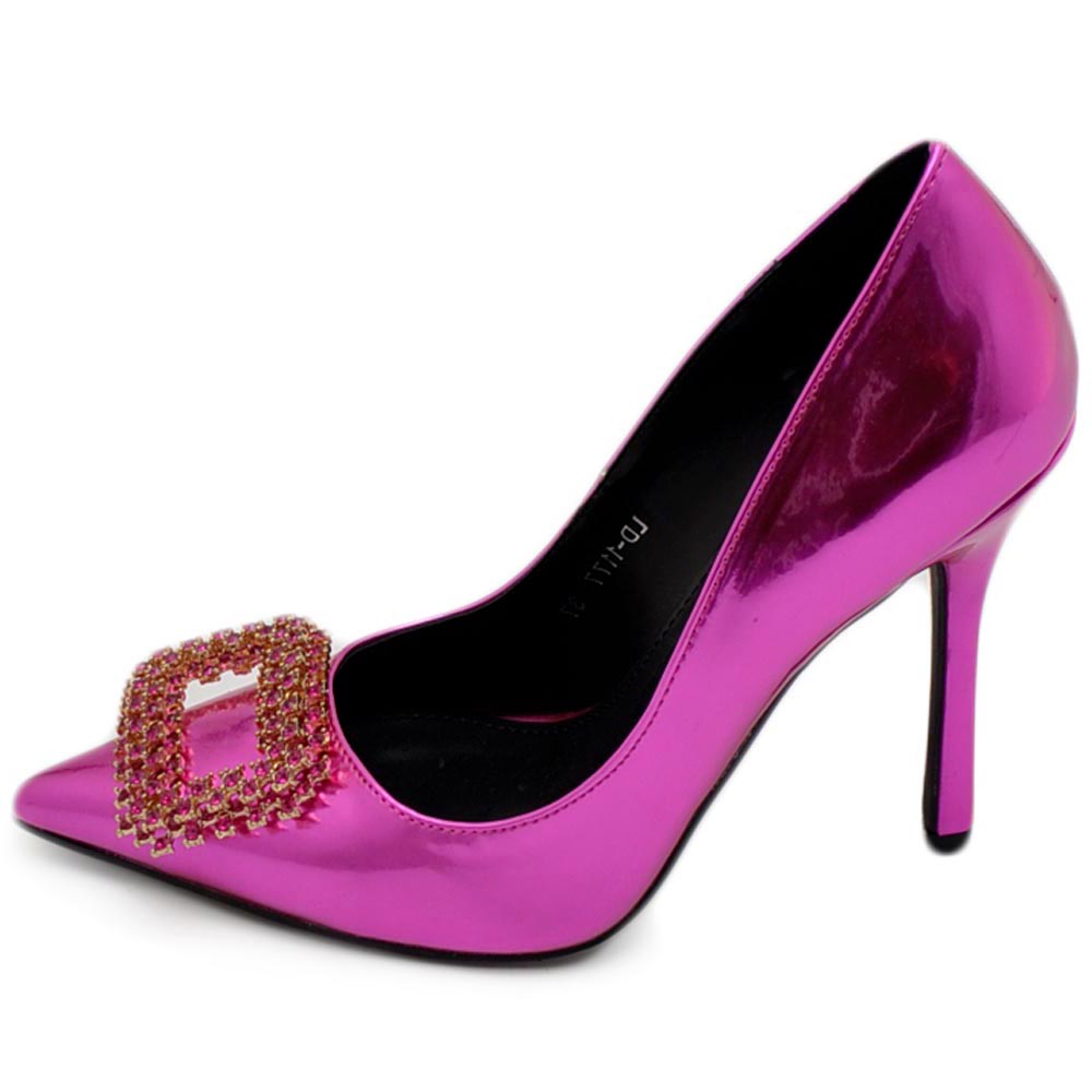 Decolette' donna lucido specchio fucsia con gioiello spilla quadrato oro in punta tacco 12 cm spillo