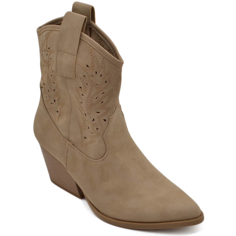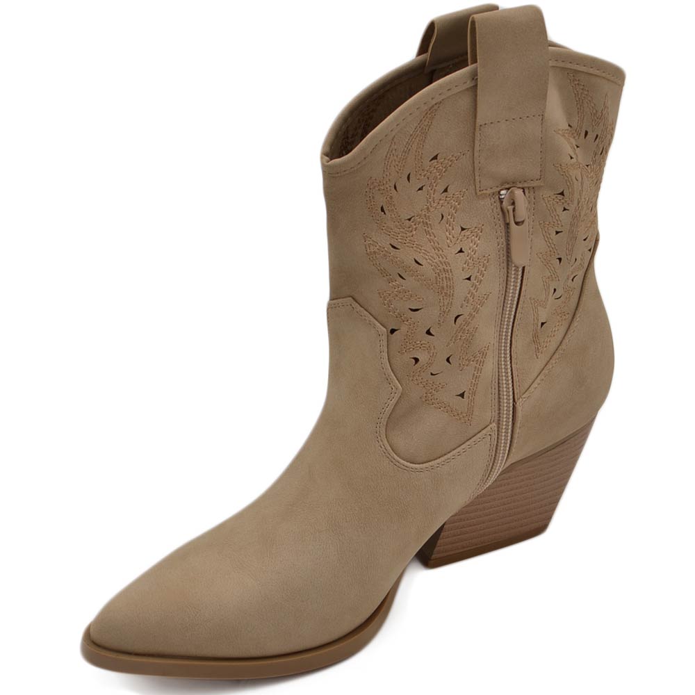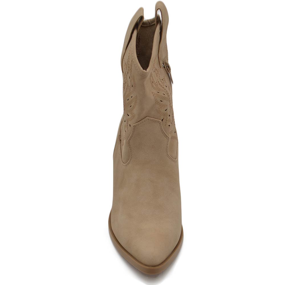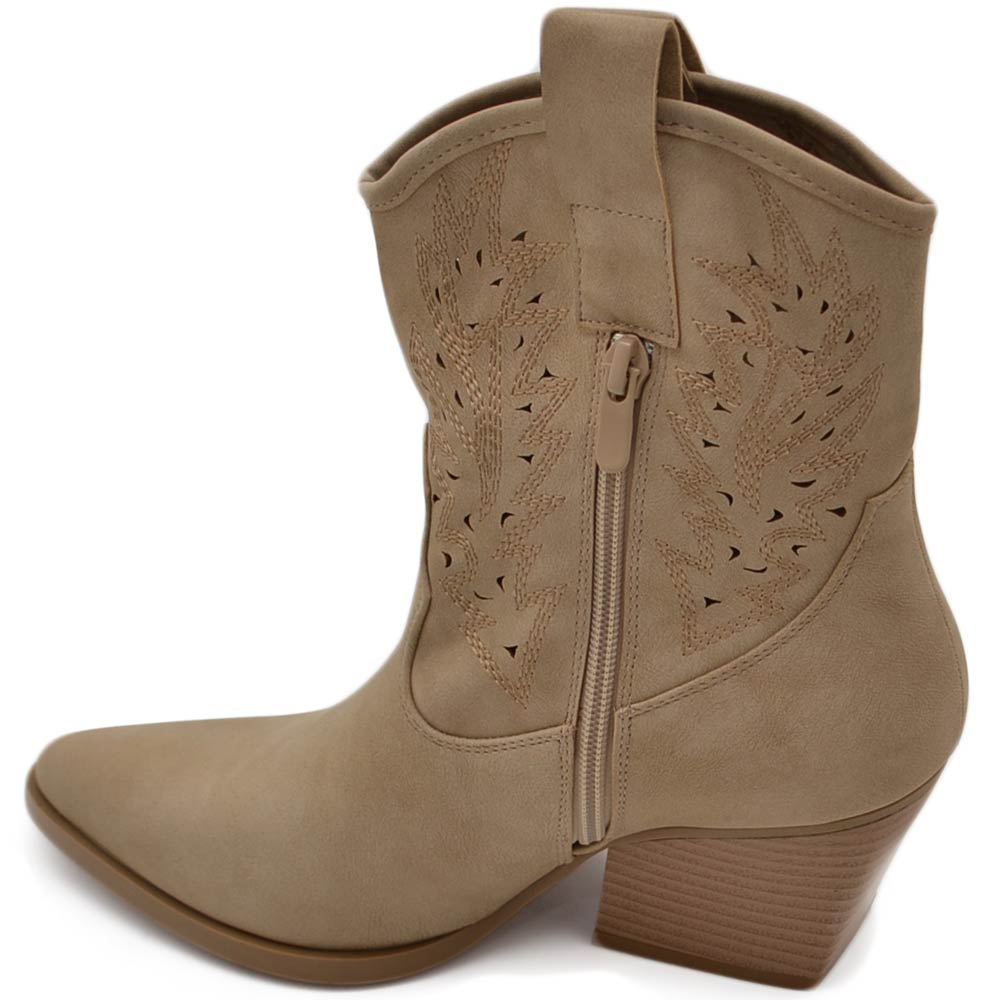 Texano tronchetti donna camperos in camoscio beige stivaletti con tacco largo comodo 5cm effetto laser alla caviglia zip