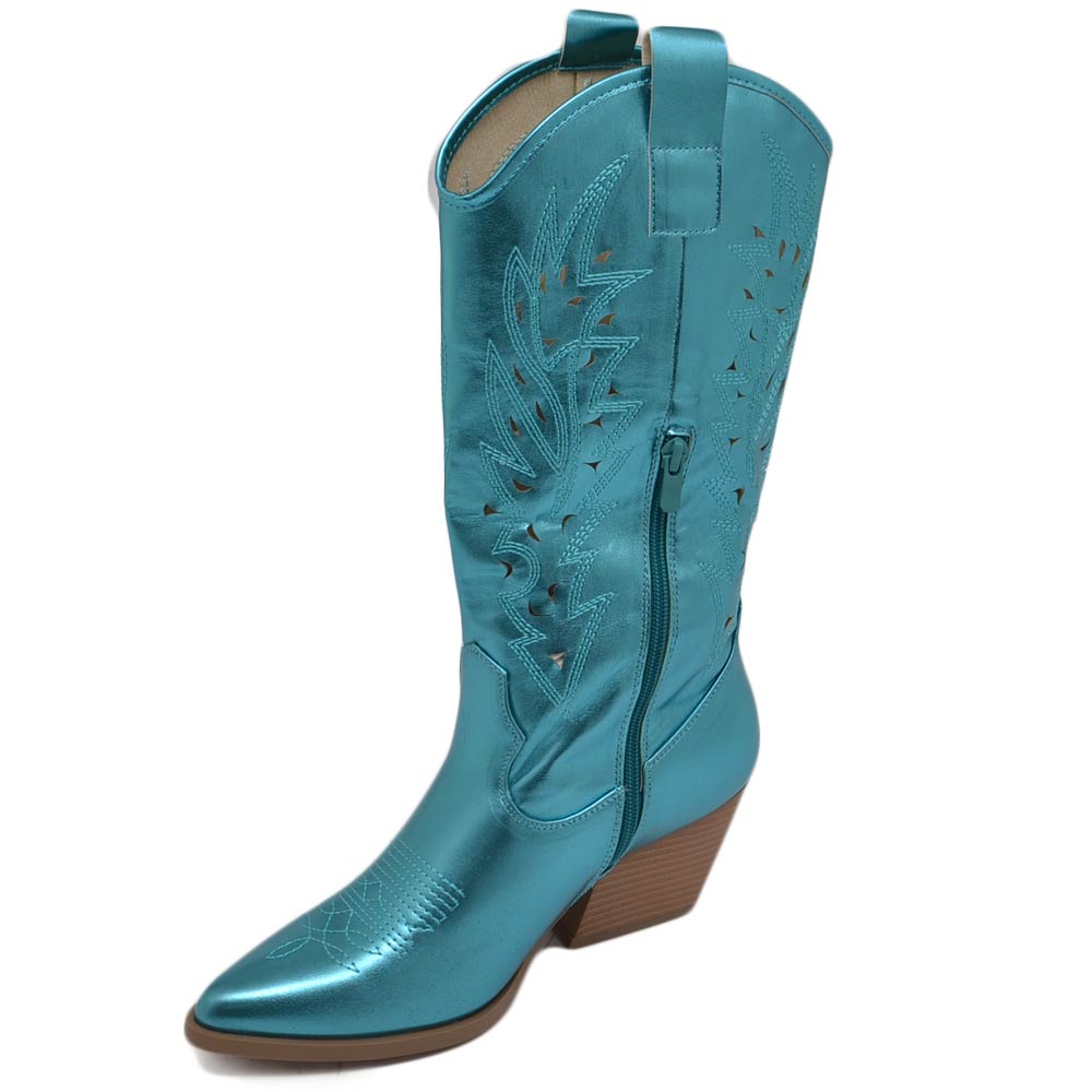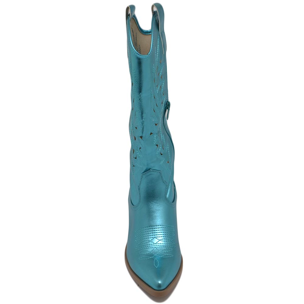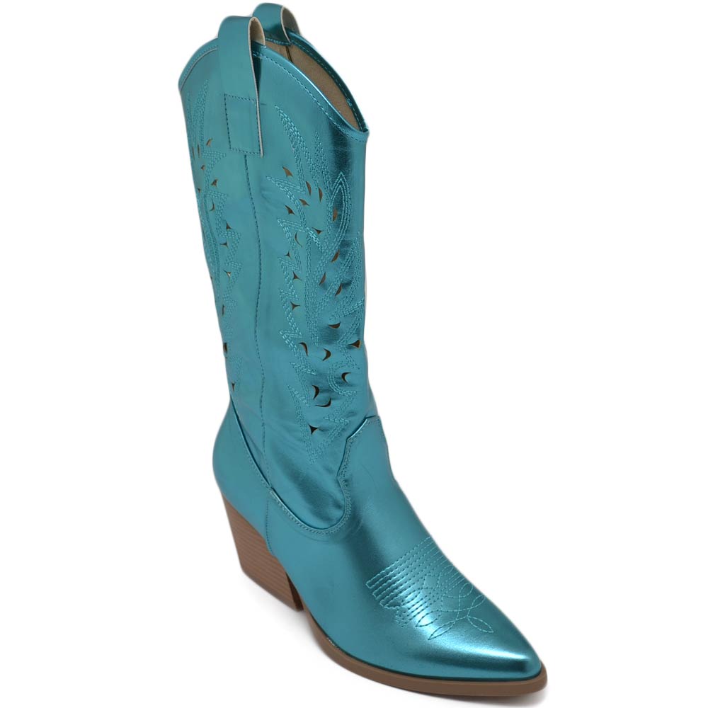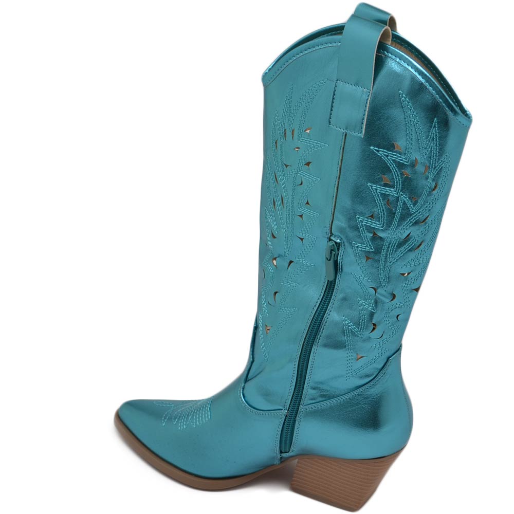 Stivali donna camperos texani stile western forati estivi turchese azzurro perlato tacco western 7 cm con zip laterale