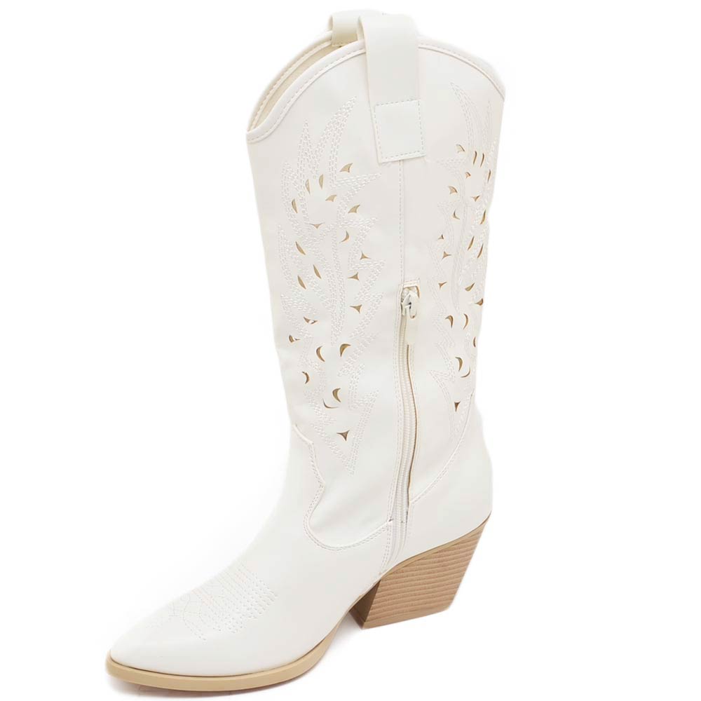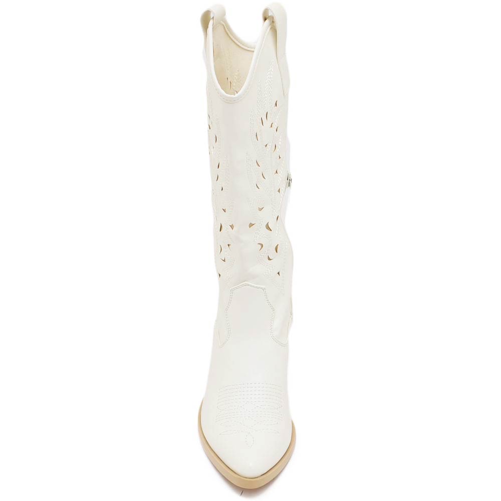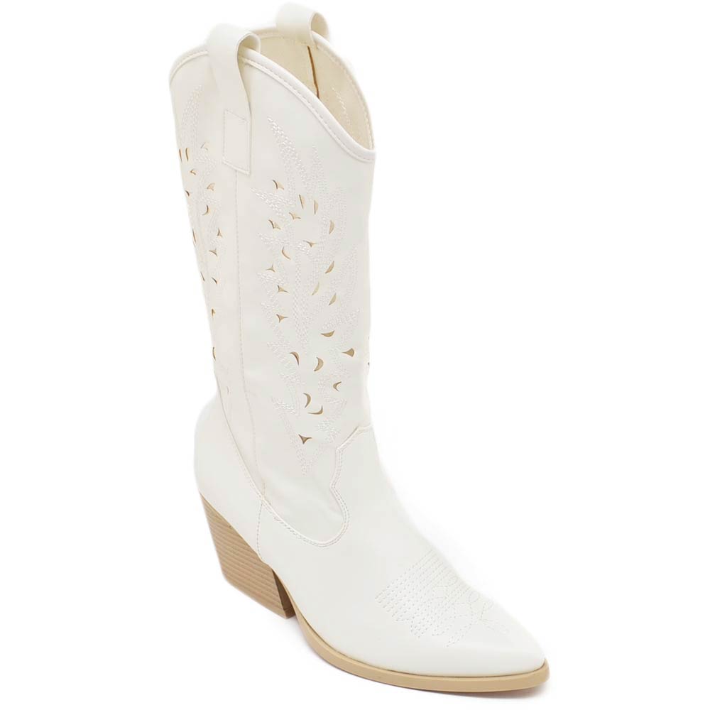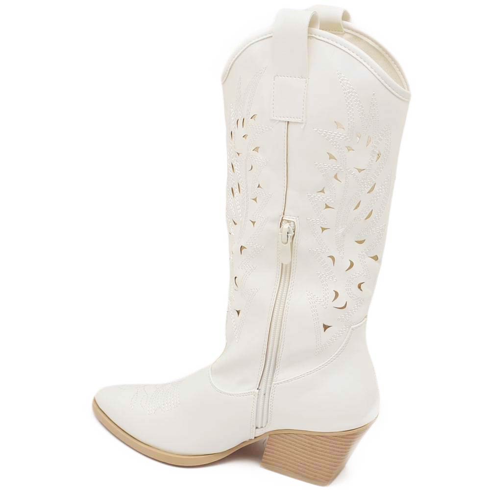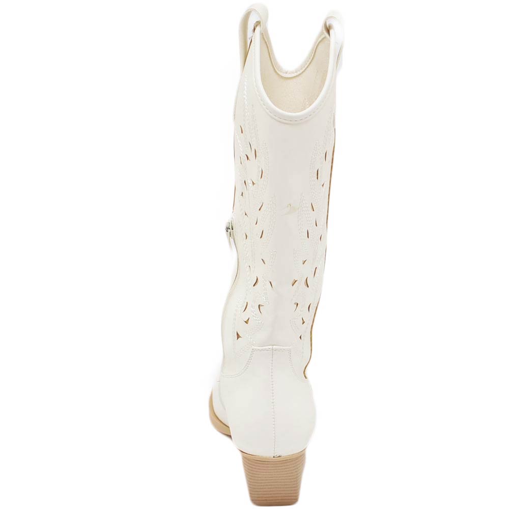 Stivali donna camperos texani stile western forati estivi bianco tacco western 7 cm legno con zip laterale