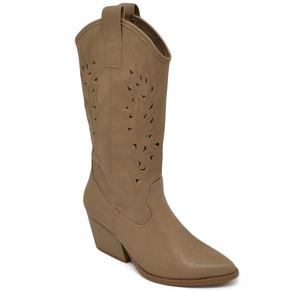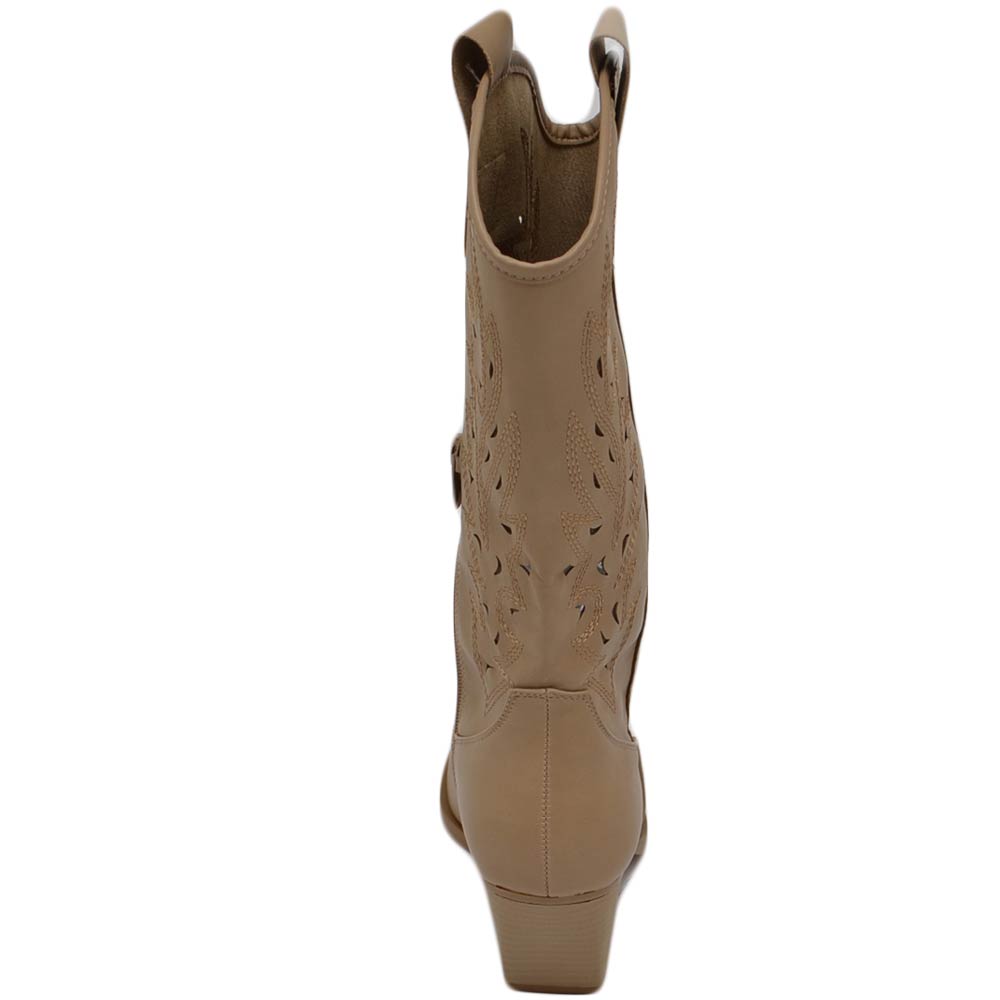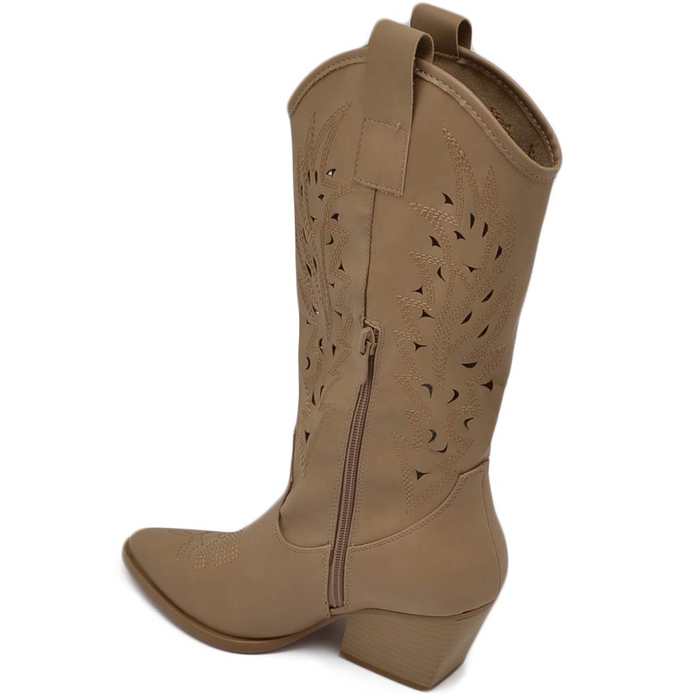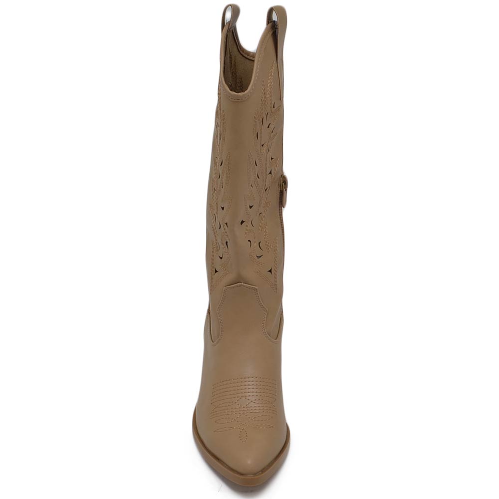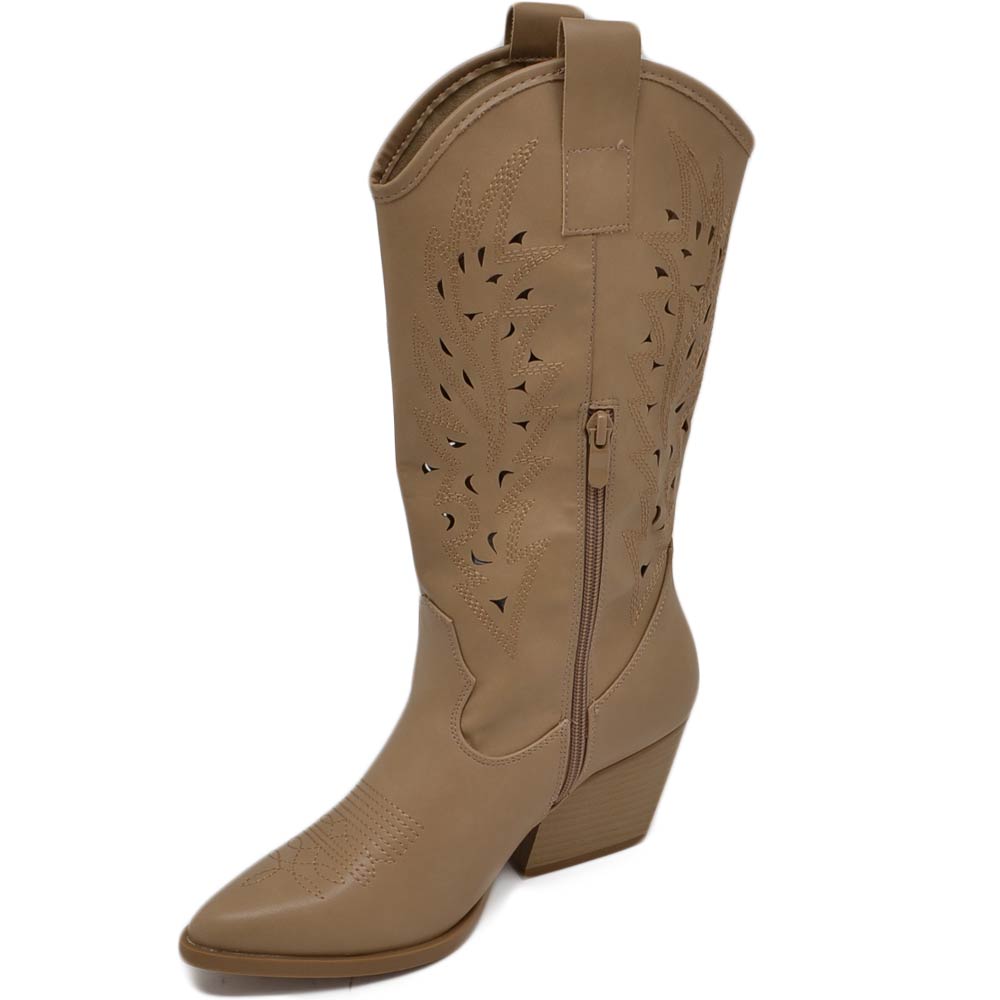 Stivali donna camperos texani stile western forati estivi beige ecopelle tacco western 7 cm legno con zip laterale