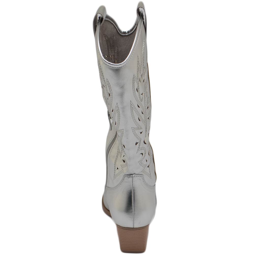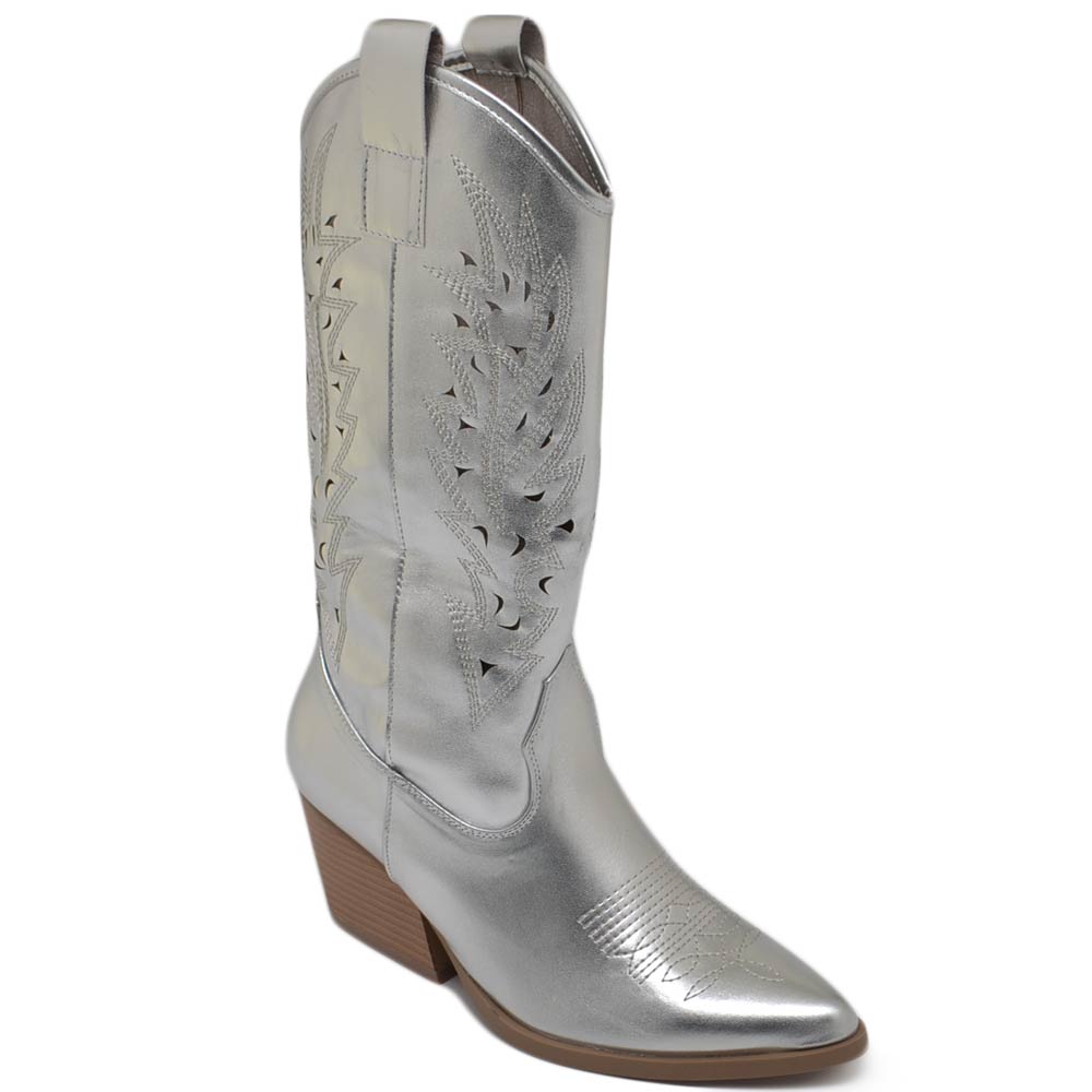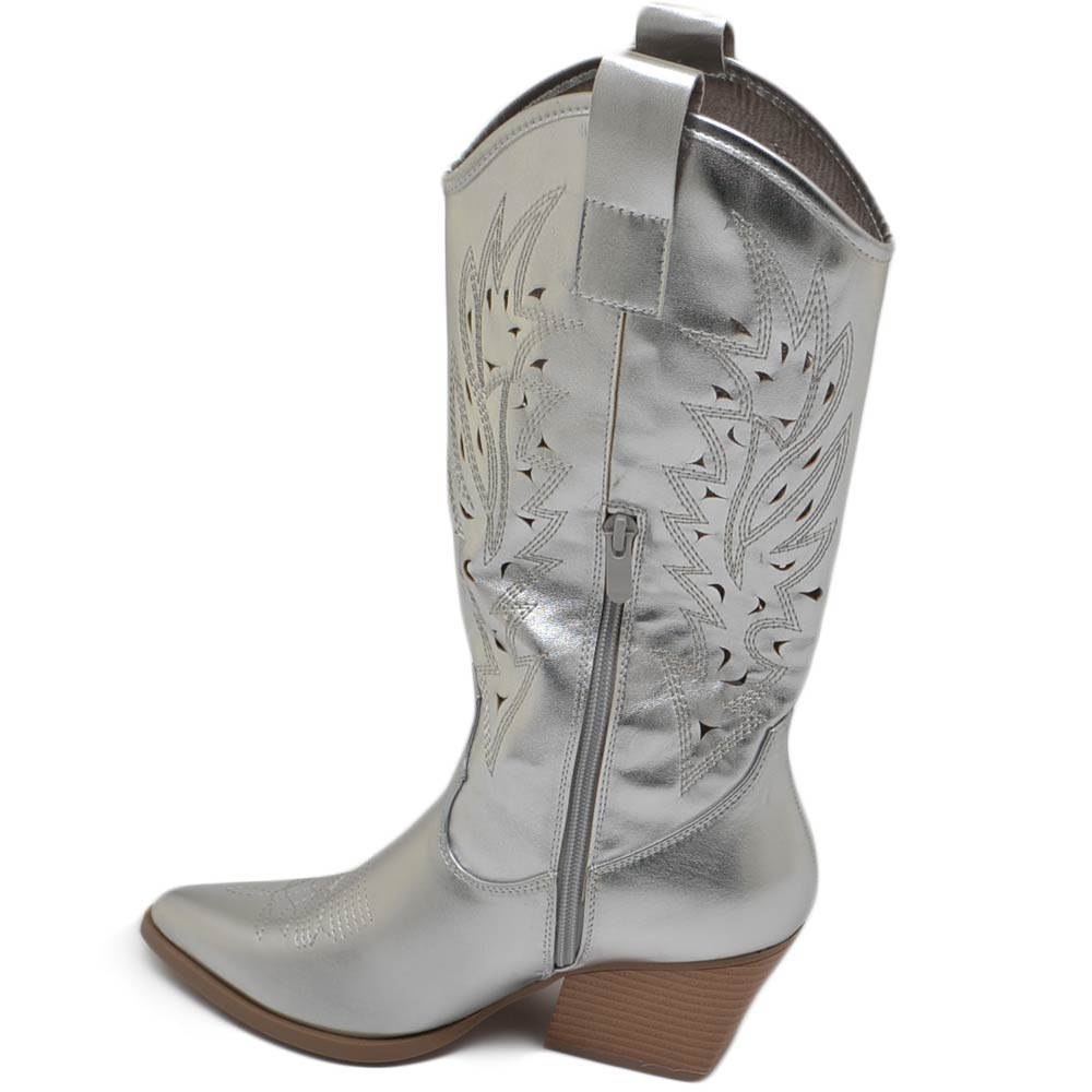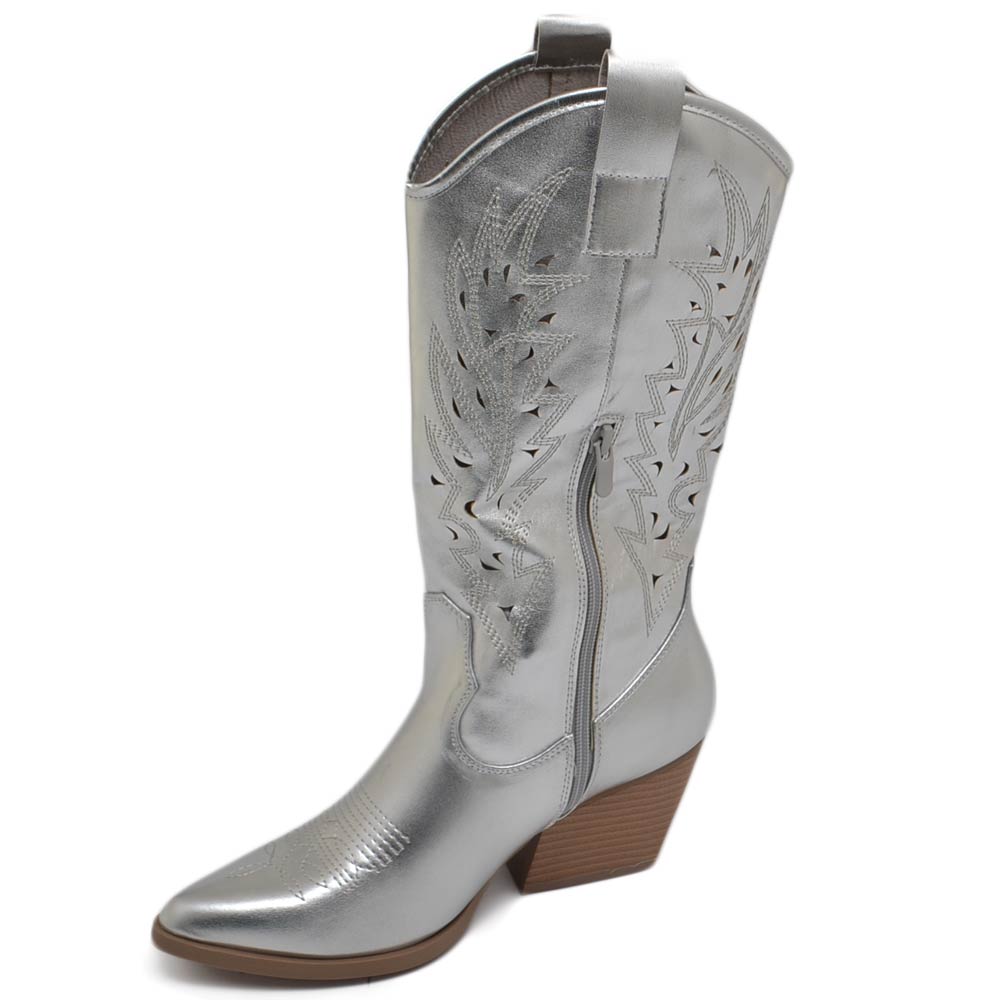 Stivali donna camperos texani stile western forati estivi argento perlato tacco western 7 cm legno con zip laterale