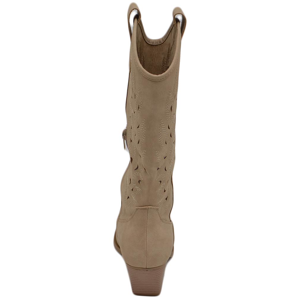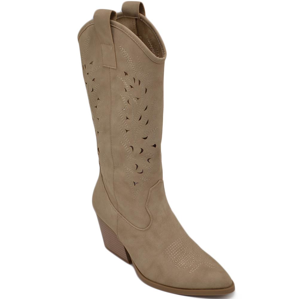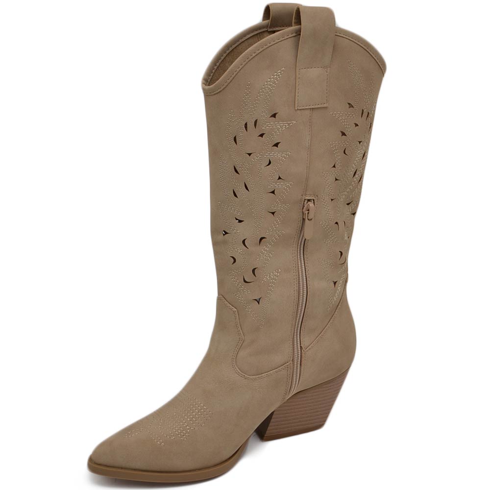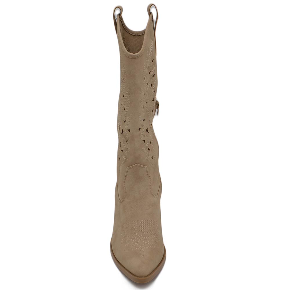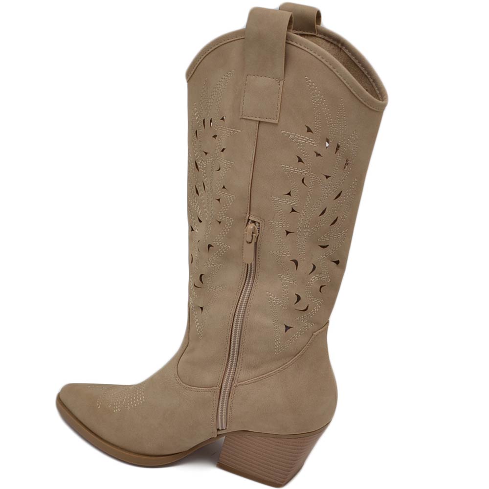Stivali donna camperos texani stile western forati estivi beige scamosciato tacco western 7 cm legno con zip laterale