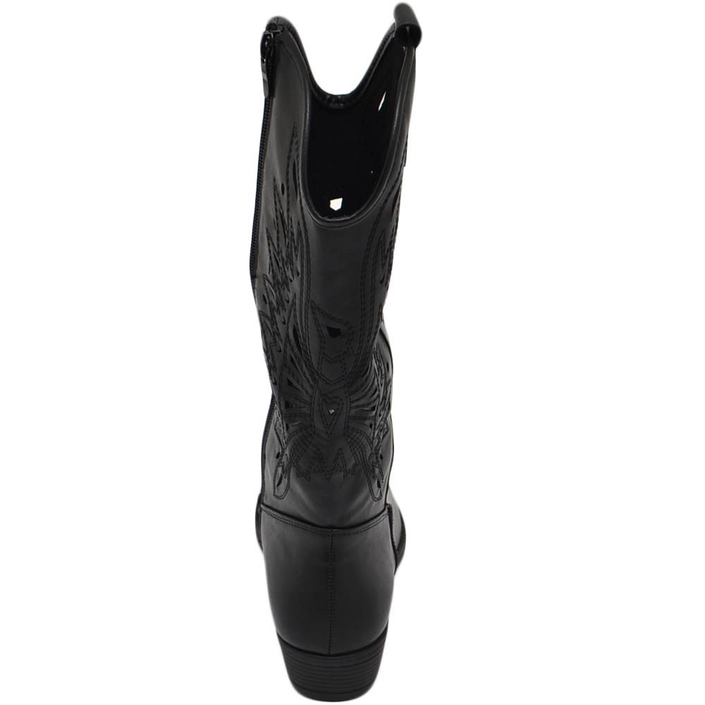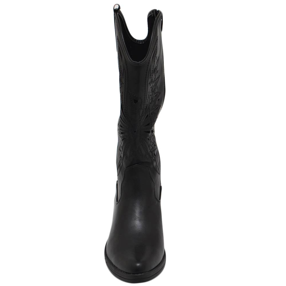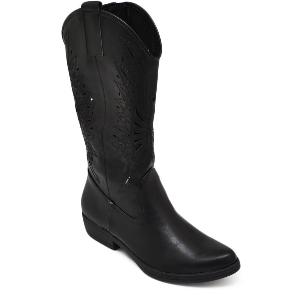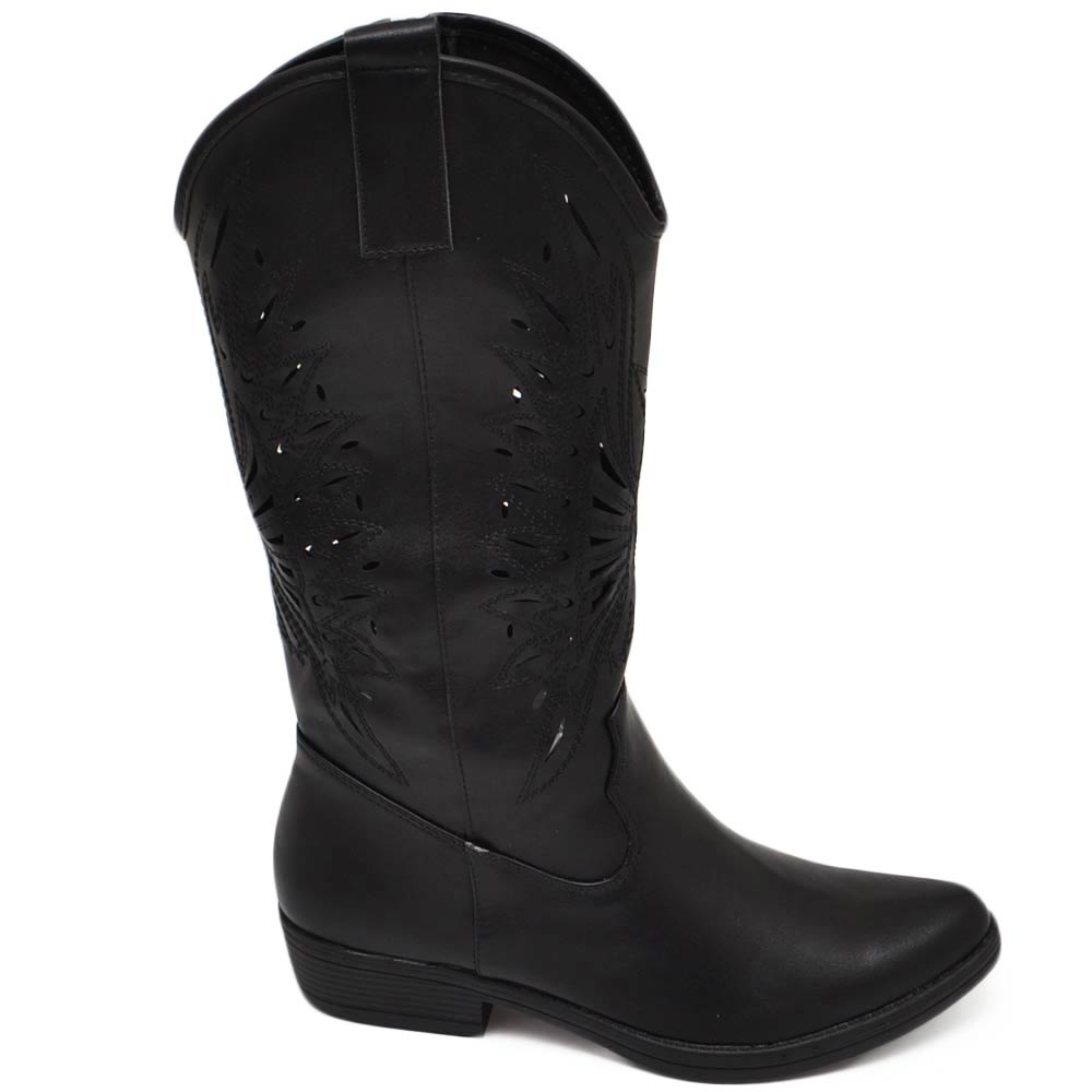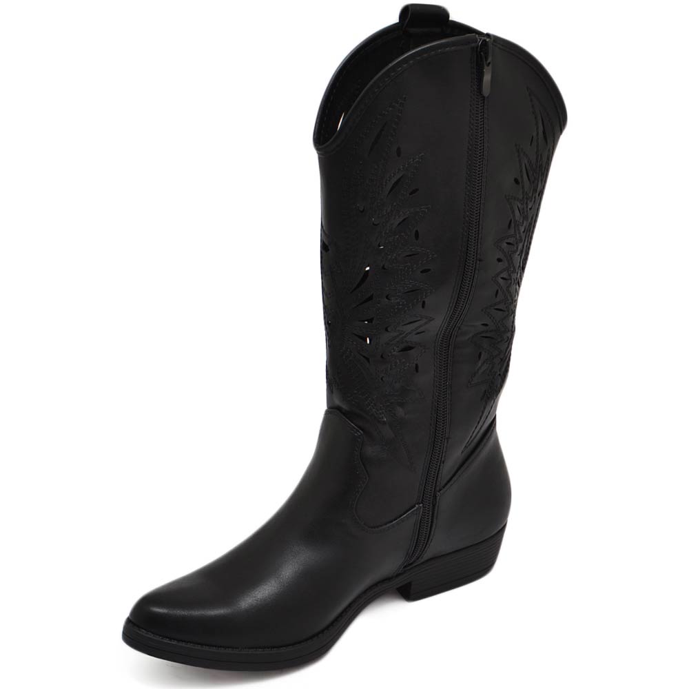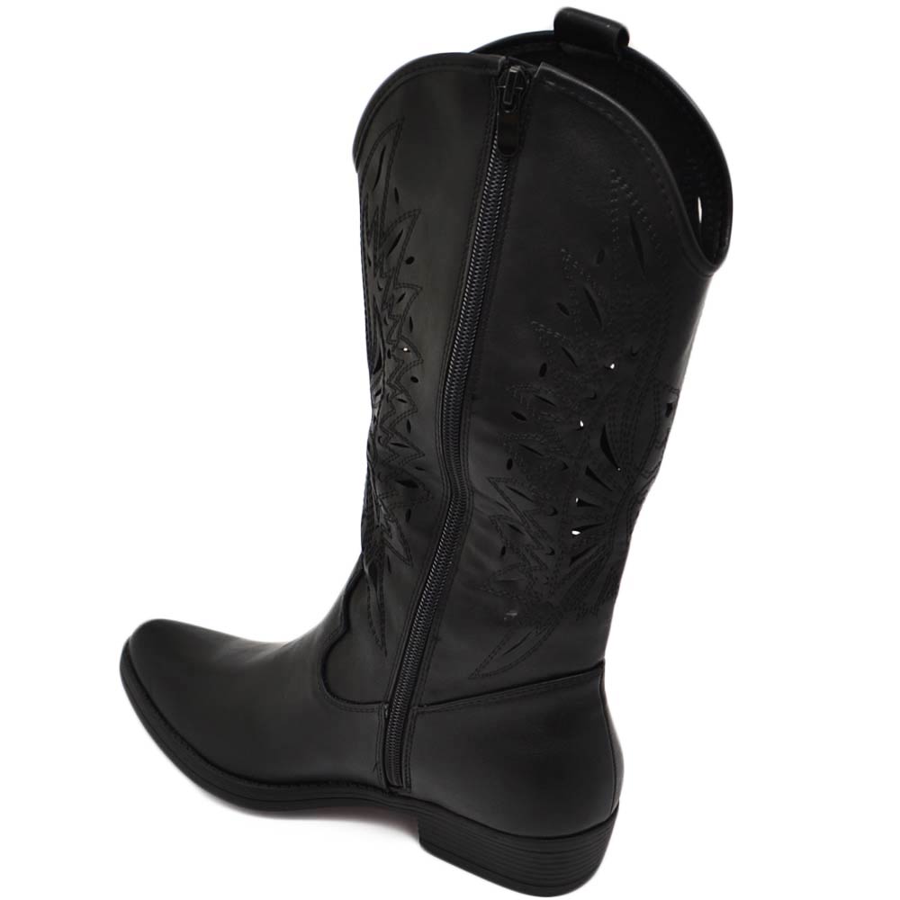 Stivali camperos donna nero tacco basso estivi traforati altezza ginocchio texani con cuciture tinta unita
