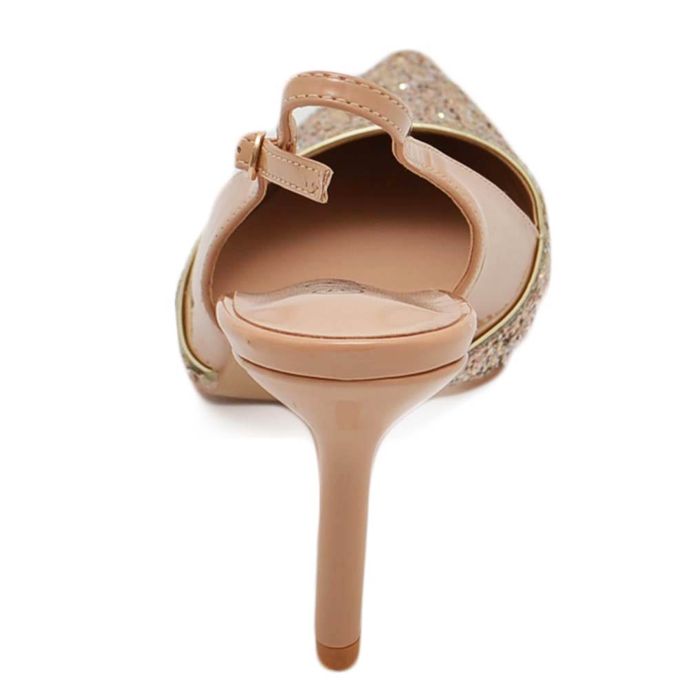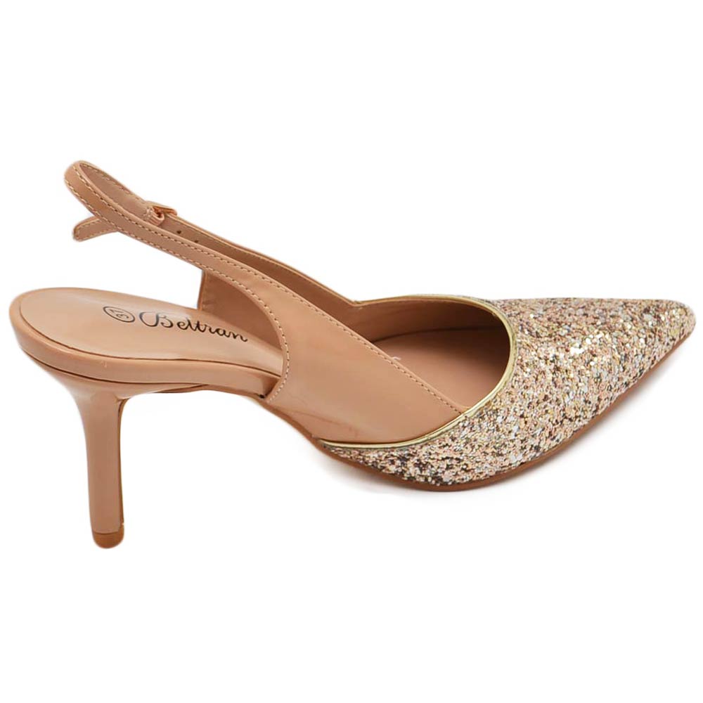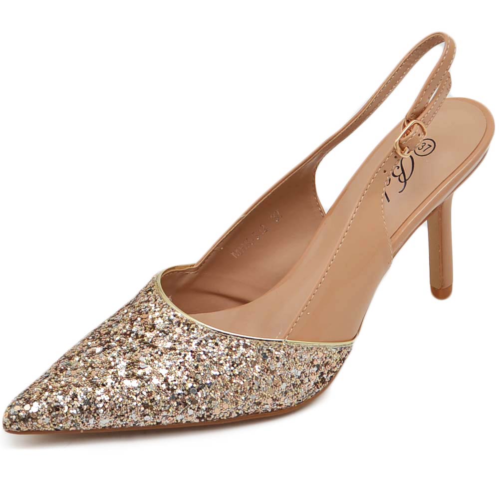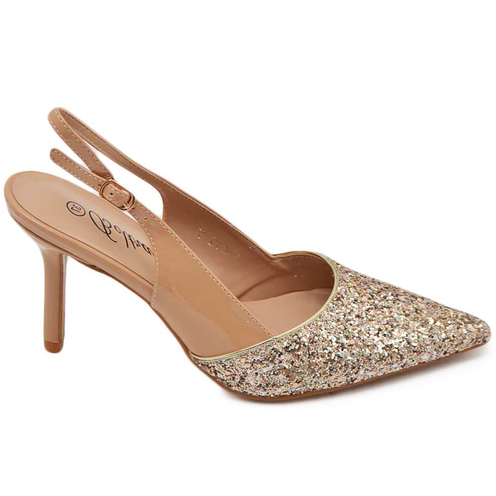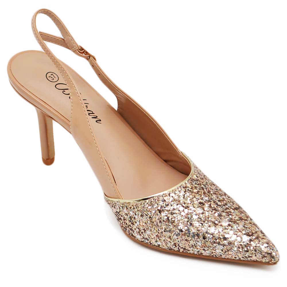 Scarpe decollete slingback donna elegante punta glitter vernice lucida oro tacco 12 cm cerimonia cinturino retro