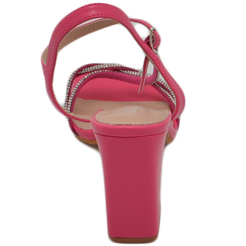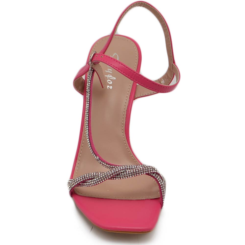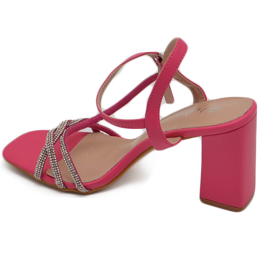 Sandalo donna ecopelle fucsia gioiello argento sabot aperto dietro con chiusura caviglia tacco 7cm incrociato sul piede