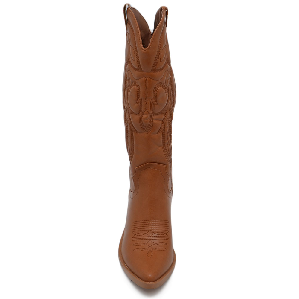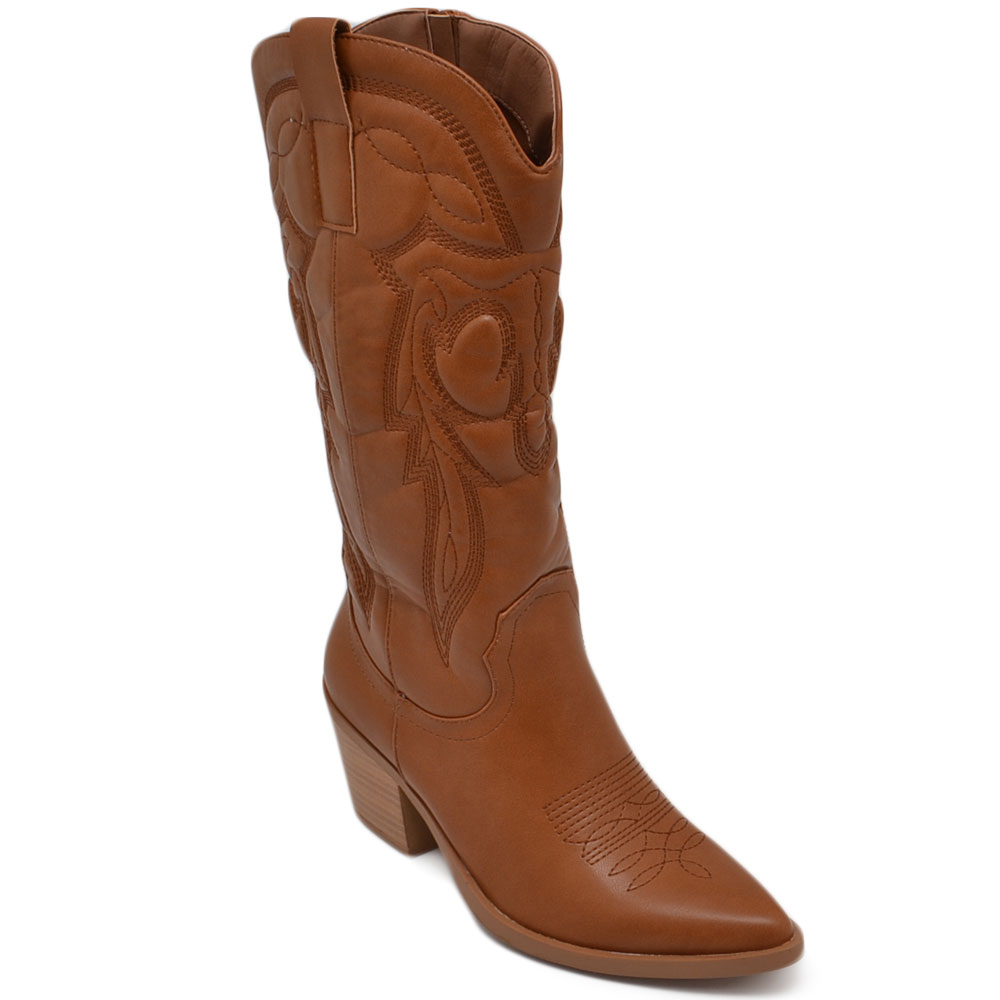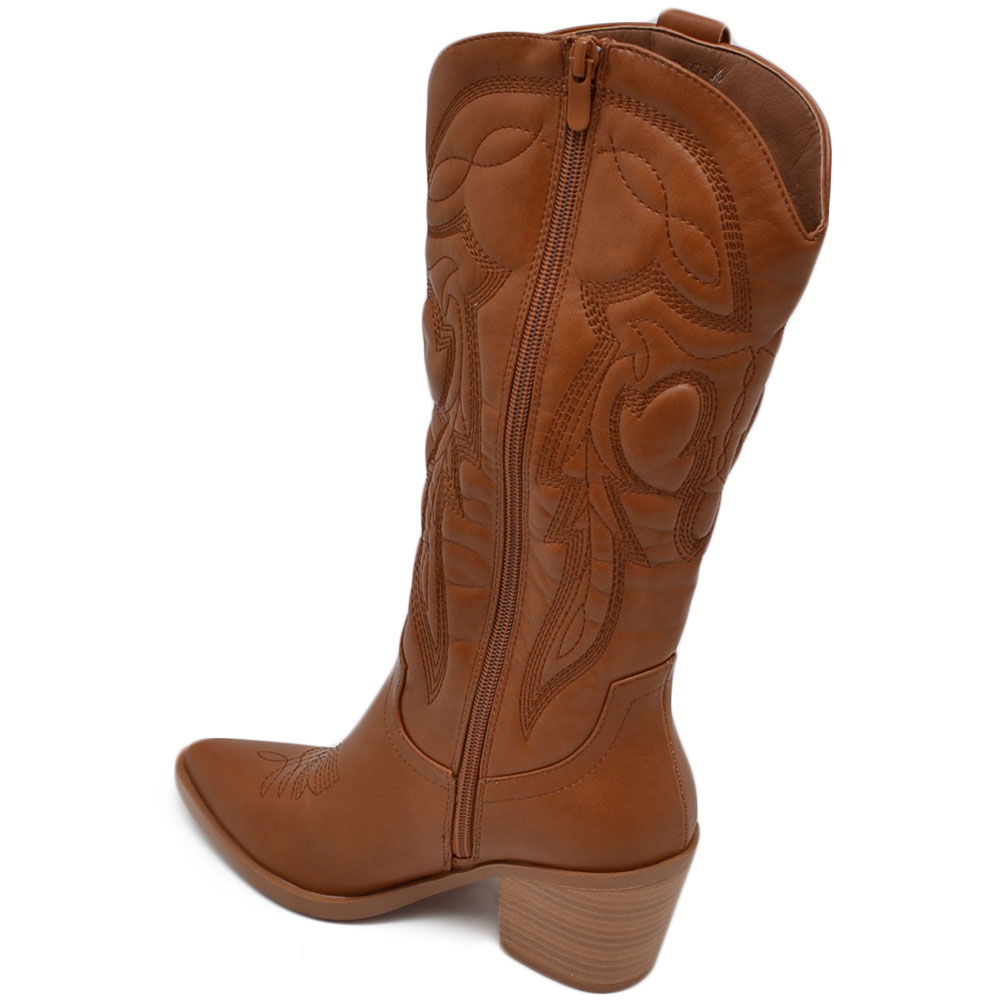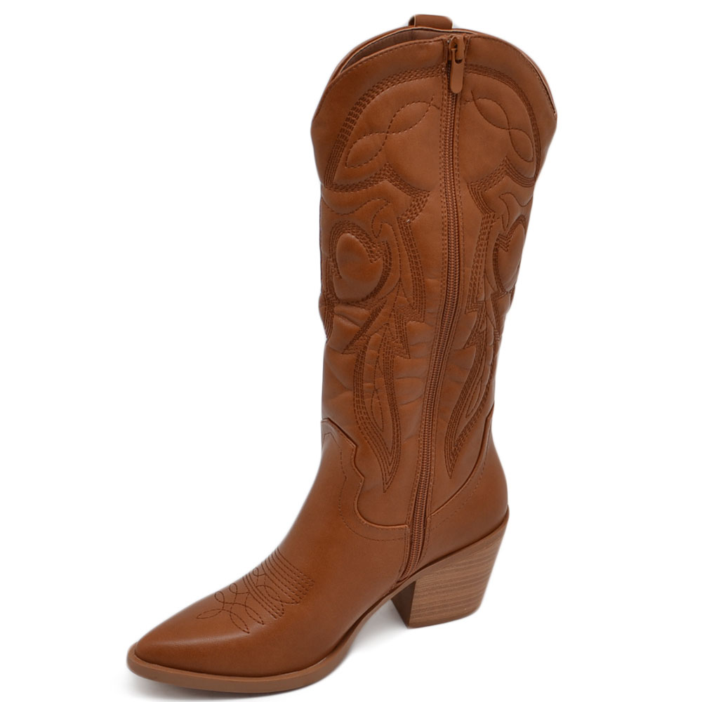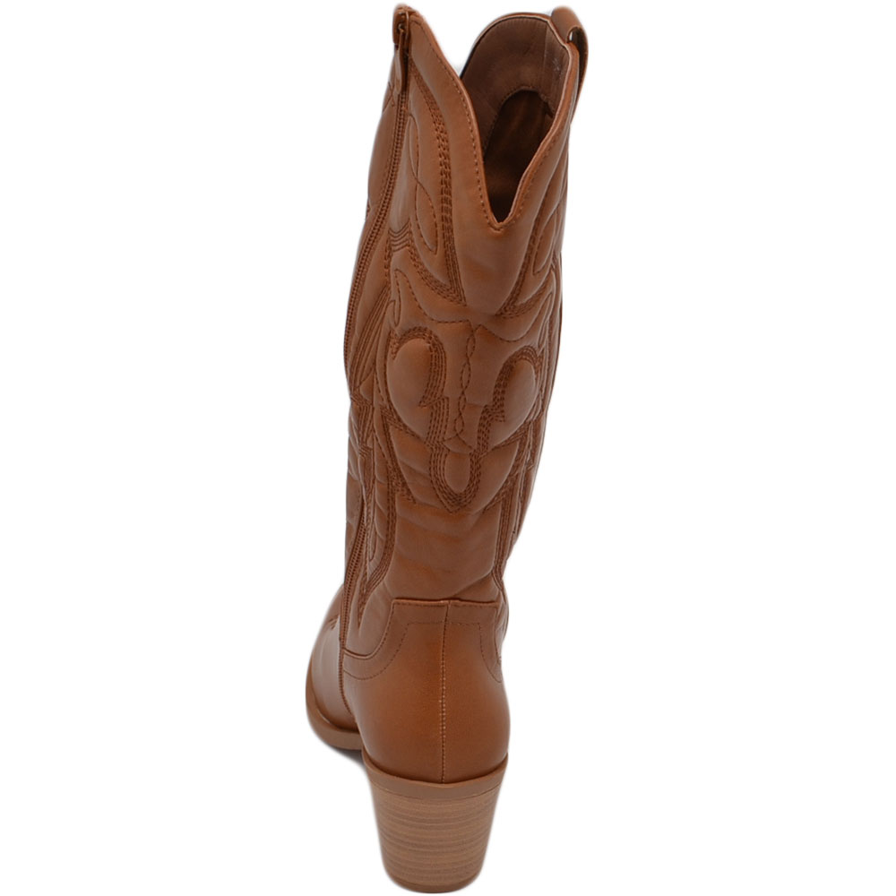 Stivali donna camperos cuoio texani stile western con cuciture in rilievo fulmine tacco legno 5 cm con zip laterale