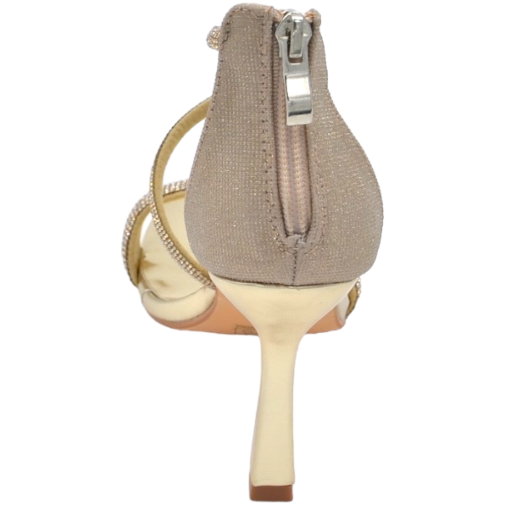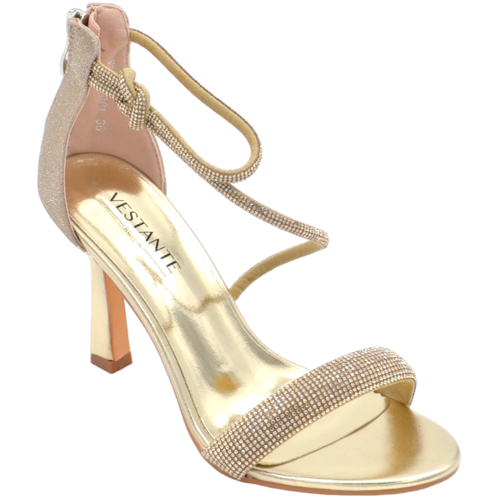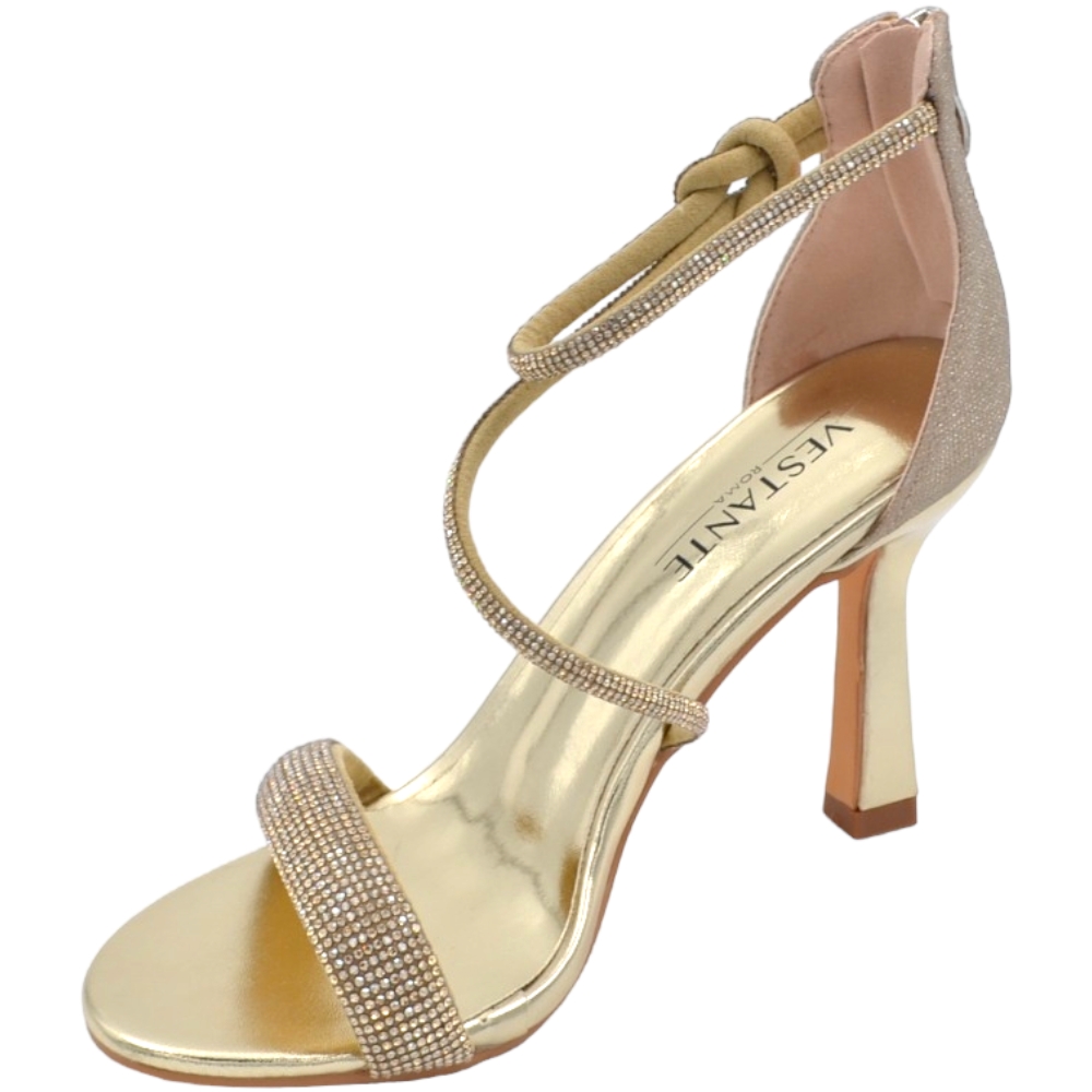 Sandali gioiello donna oro in vernice con strass chiusura alla caviglia tacco a spillo 12 cm elegante