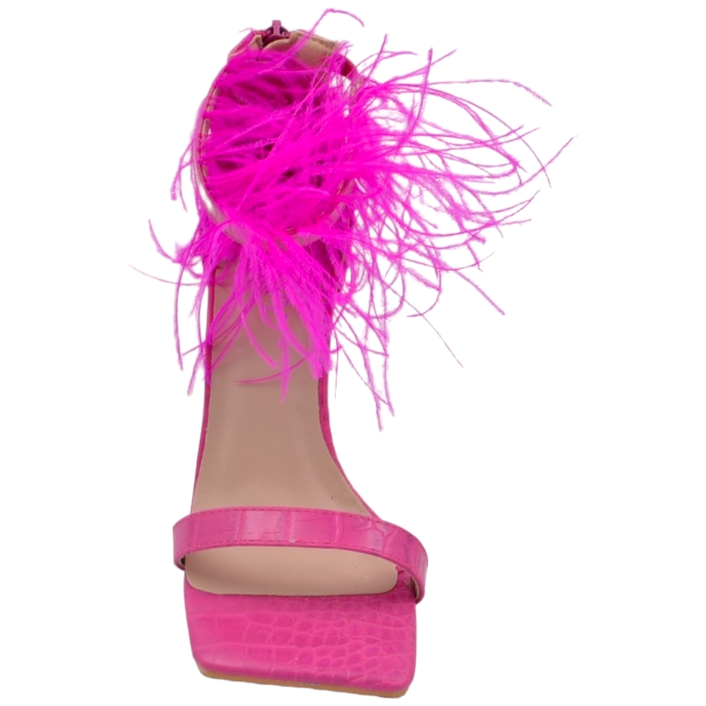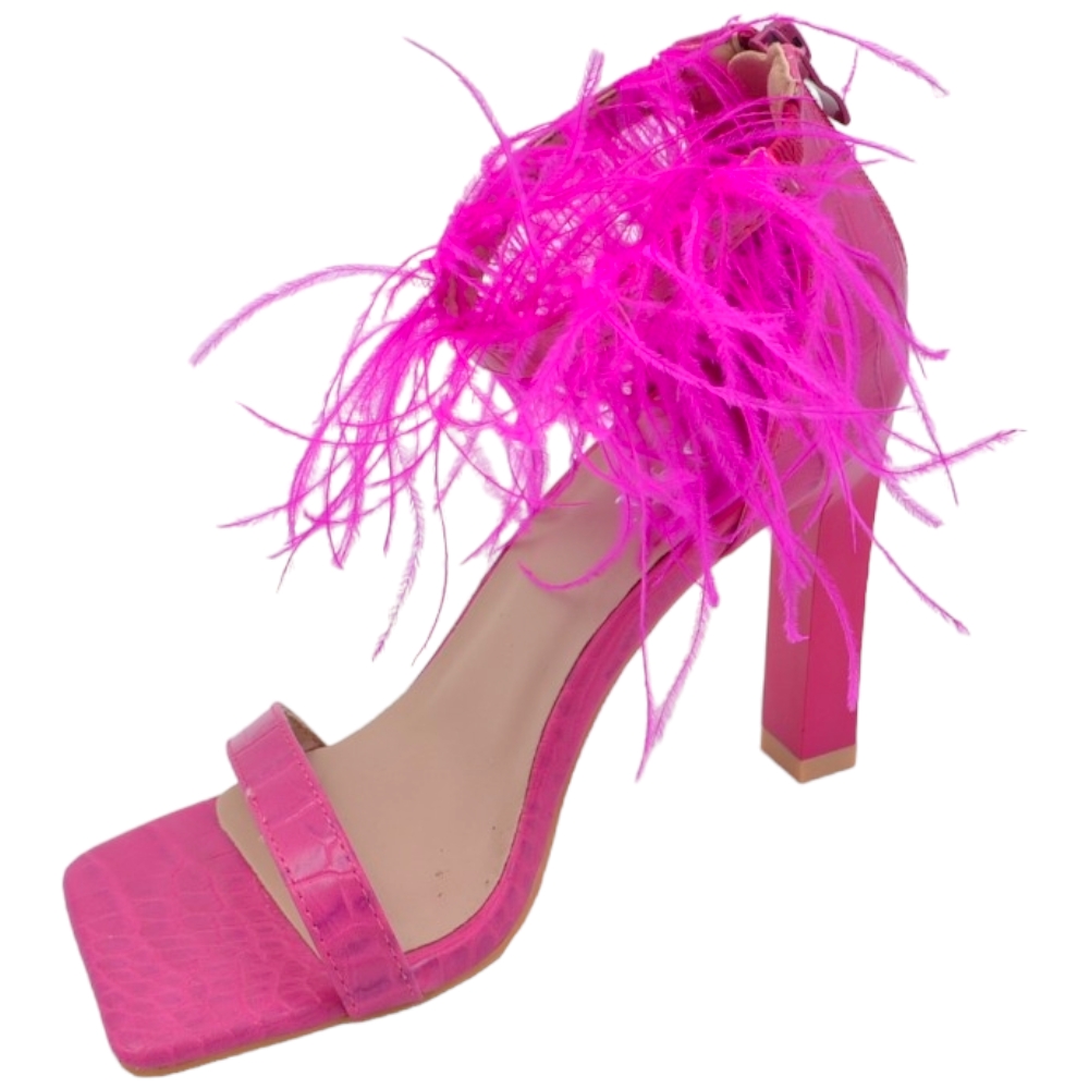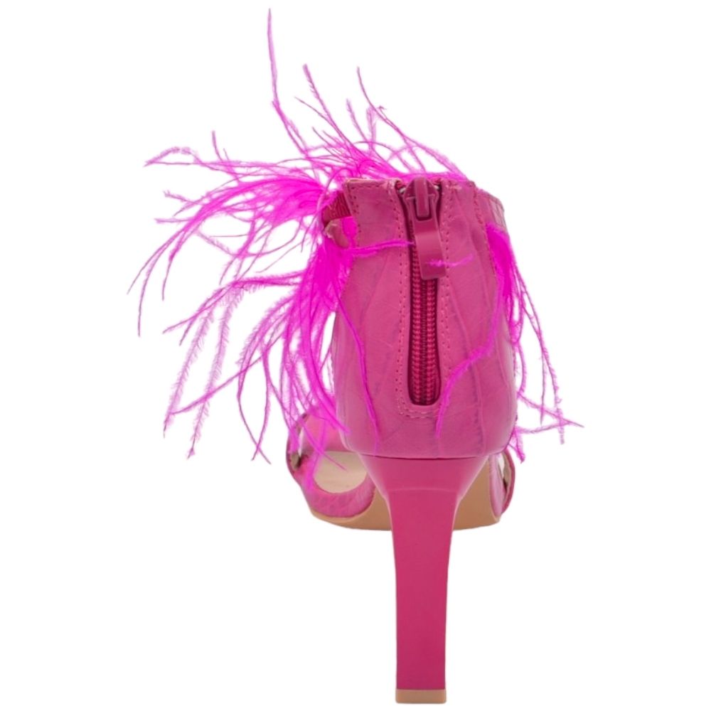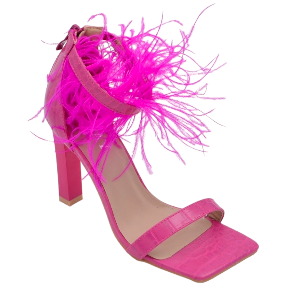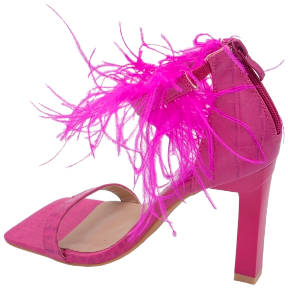 SANDALI TACCO DONNA IN PELLE STAMPA COCCO FUCSIA CON FASCETTE PIUME TACCO DOPPIO 12CM CHIUSURA ZIP