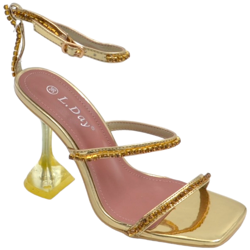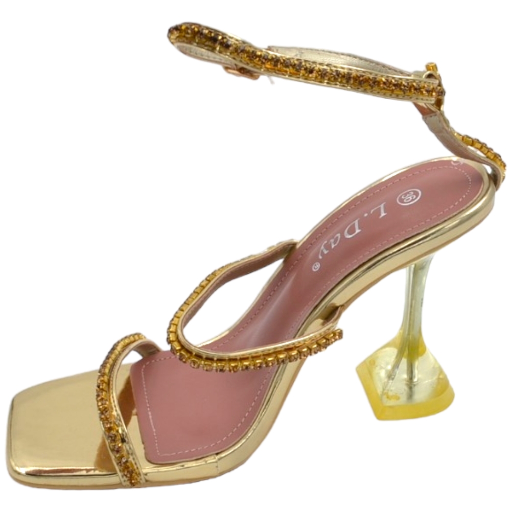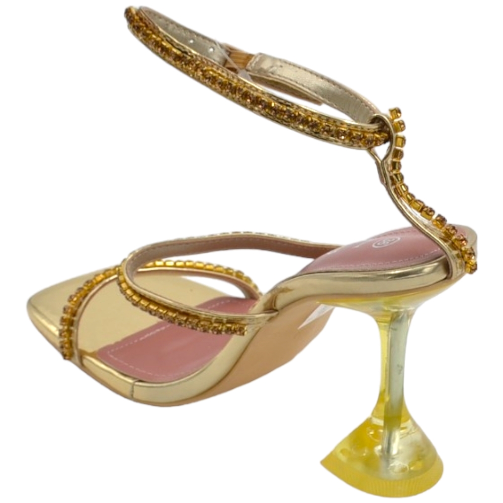 Sandali donna cerimonia a 3 fasce piede nudo con cavigliera oro brillantini tacco trasparente 10 martini elegante