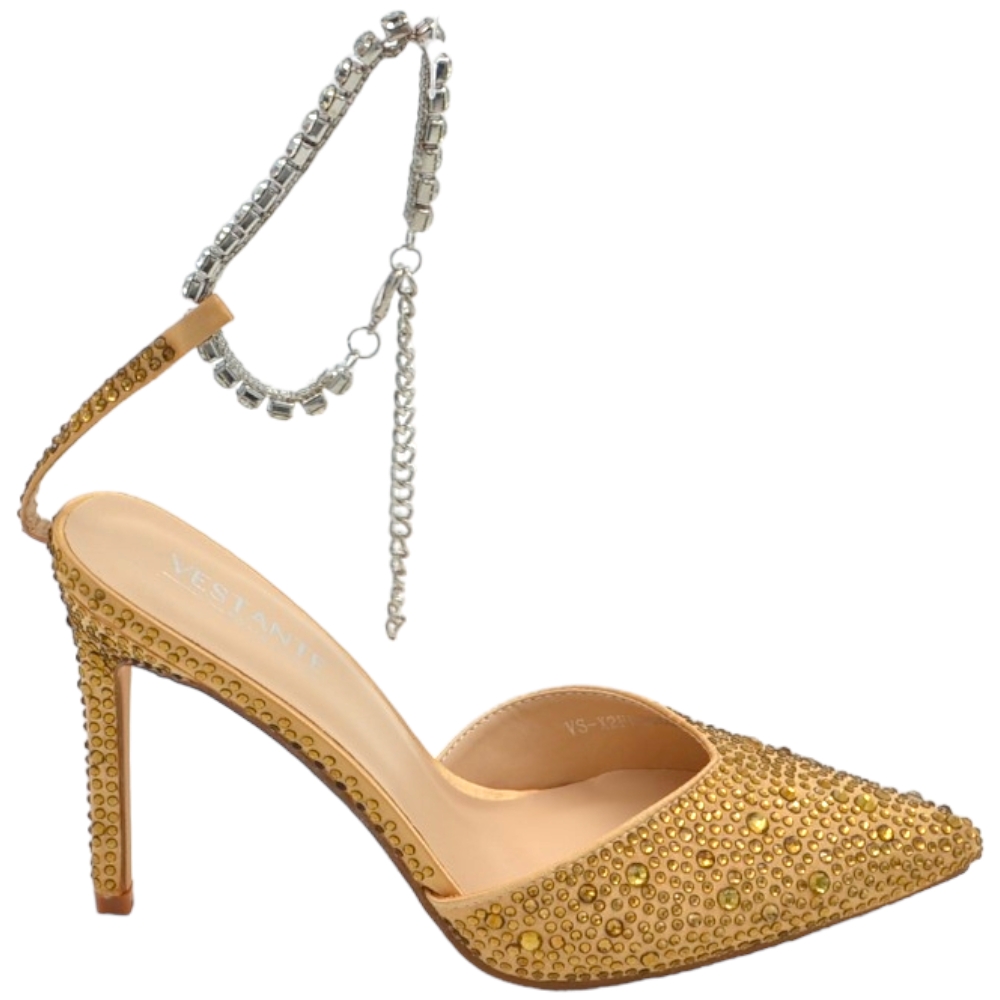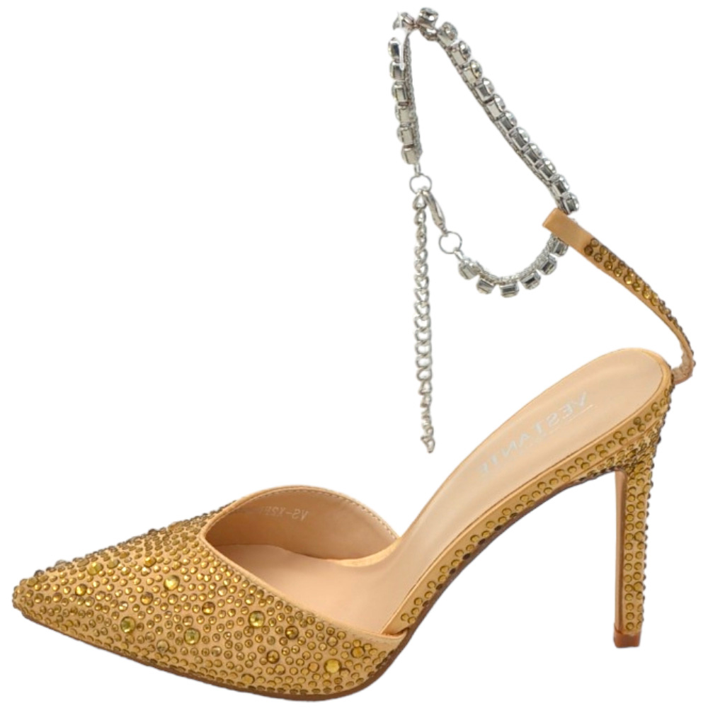 Decollete' donna gioiello elegante in tessuto oro con strass tacco a spillo 12cm cinturino gioiello effetto nudo